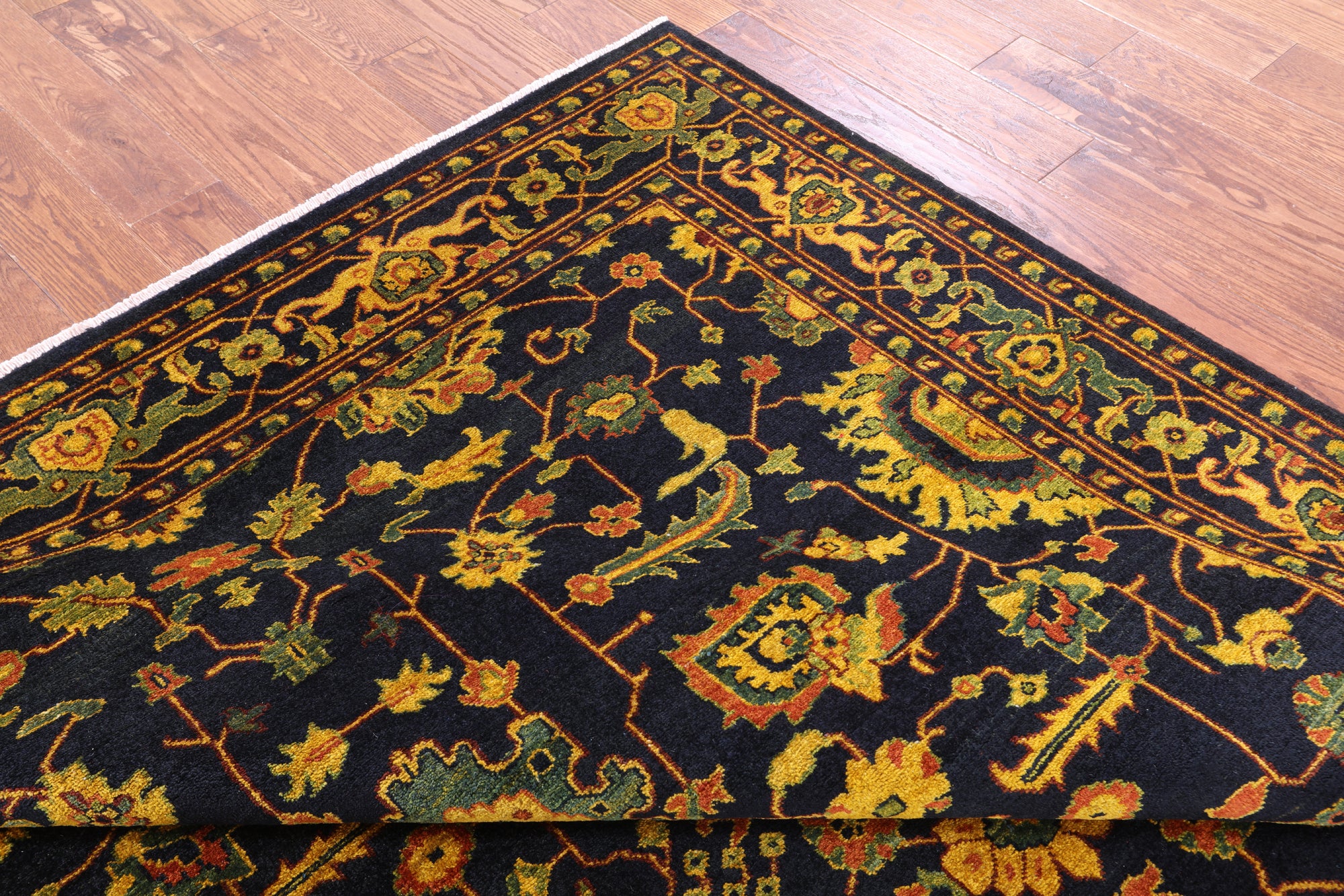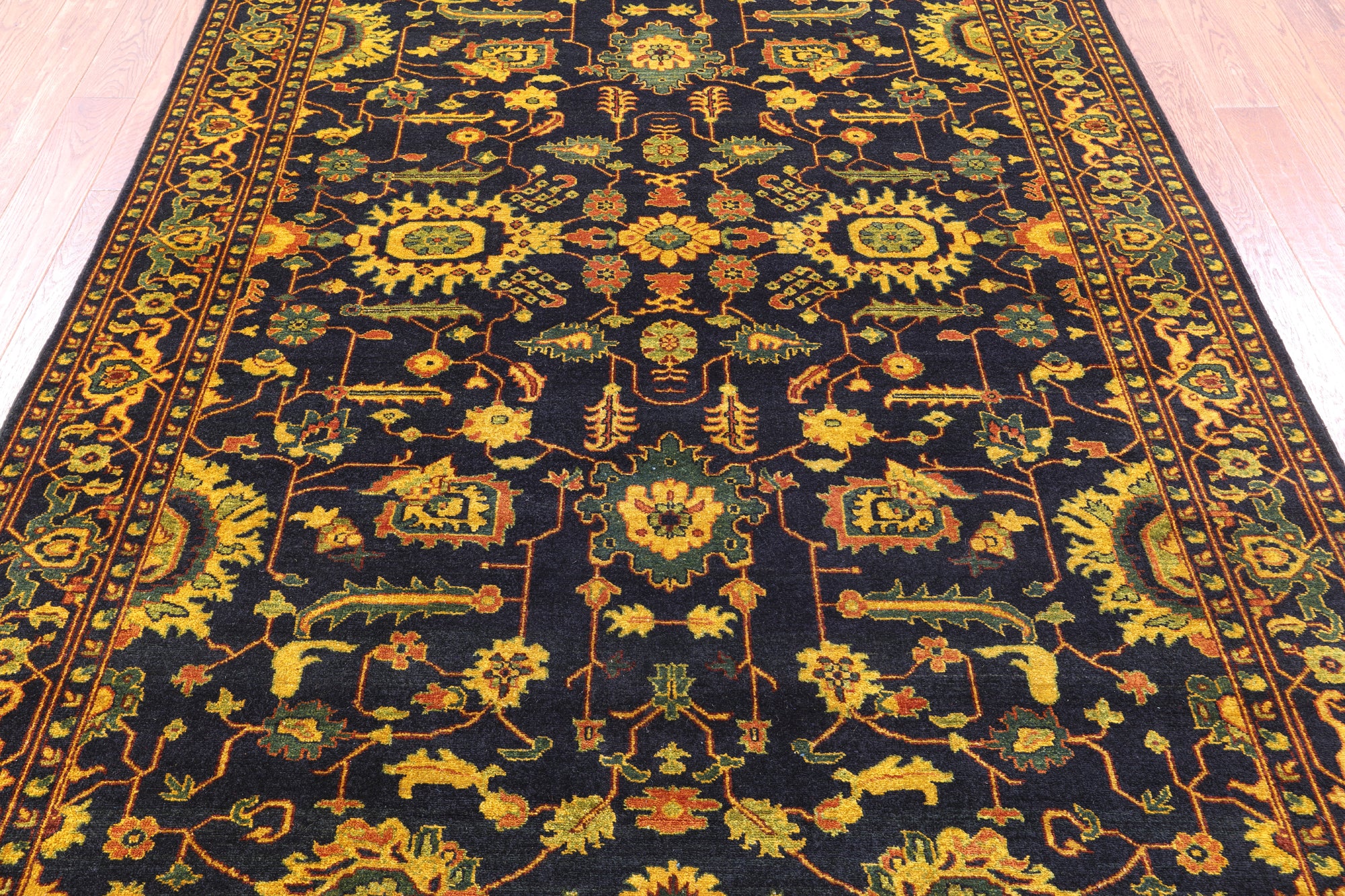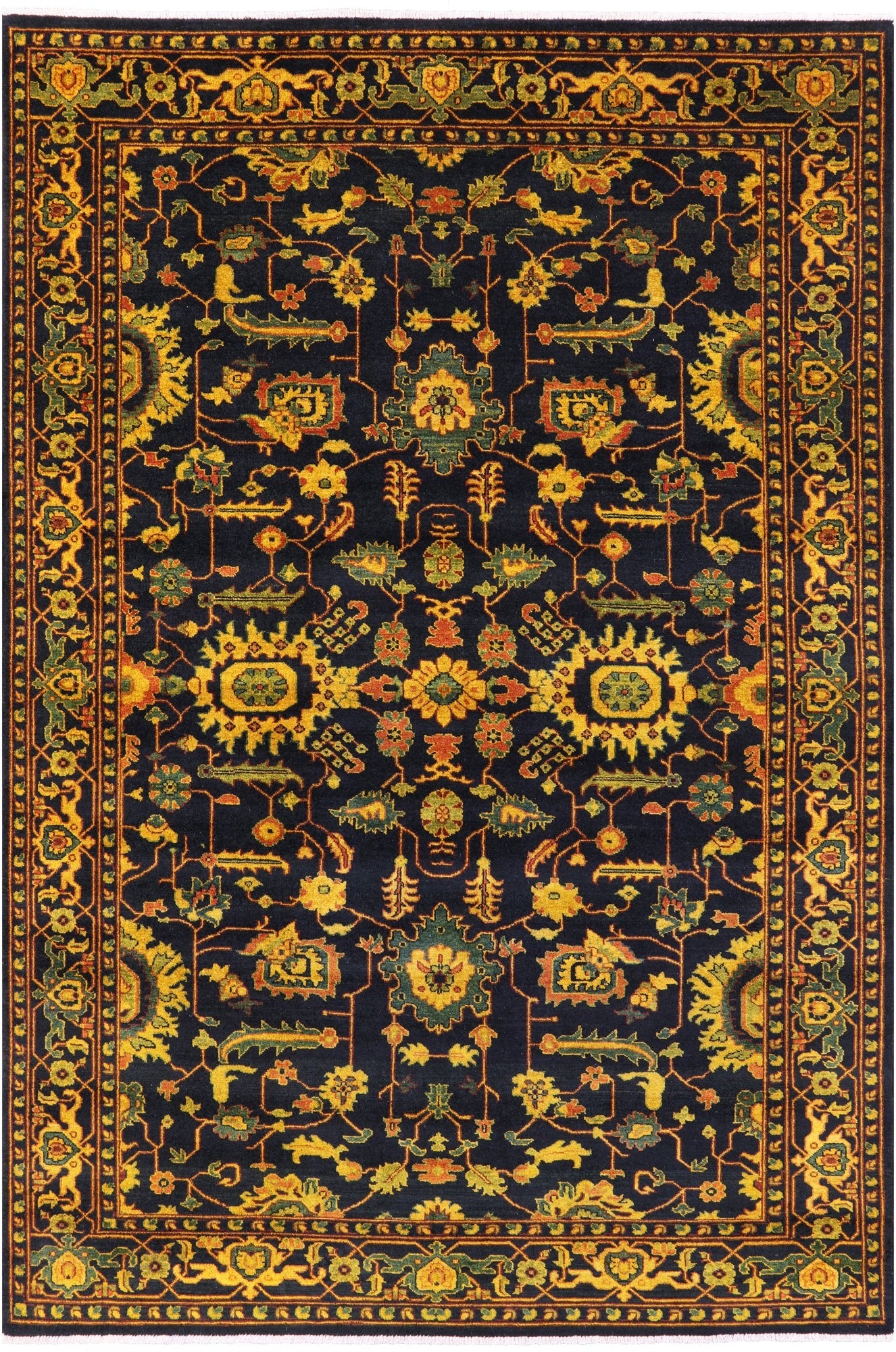 Heriz Serapi rugs are commonly known to be highly durable and are great for high traffic areas. Their medallions can be seen as large and angular, surrounded by more rigid lines and flowy floral patterns or they can also come in strictly geometric floral designs all symmetrically placed. The colors are elegant reds and indigos set against creamy ivory.