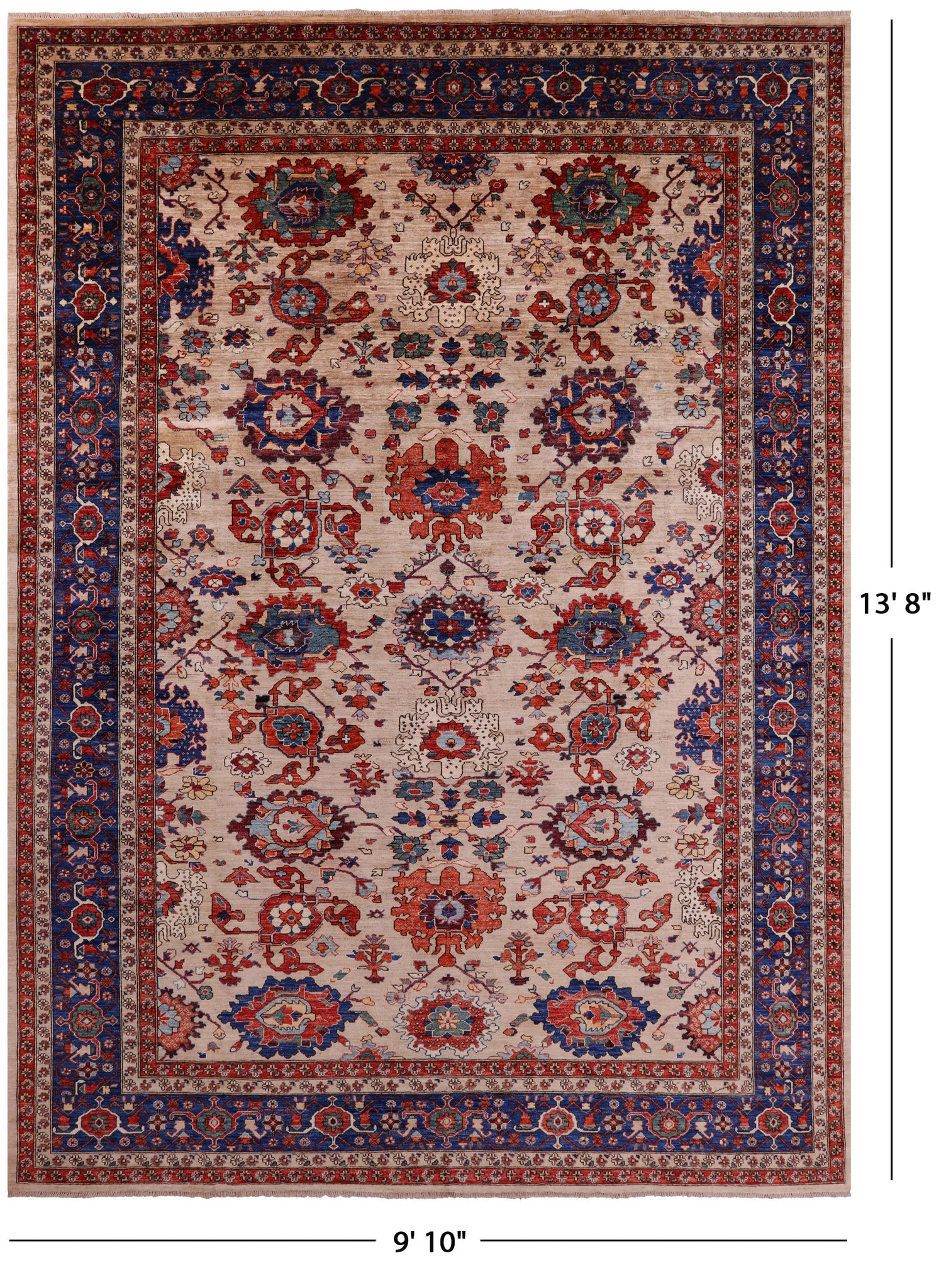 Heriz Serapi rugs are commonly known to be highly durable and are great for high traffic areas. Their medallions can be seen as large and angular, surrounded by more rigid lines and flowy floral patterns or they can also come in strictly geometric floral designs all symmetrically placed. The colors are elegant reds and indigos set against creamy ivory.