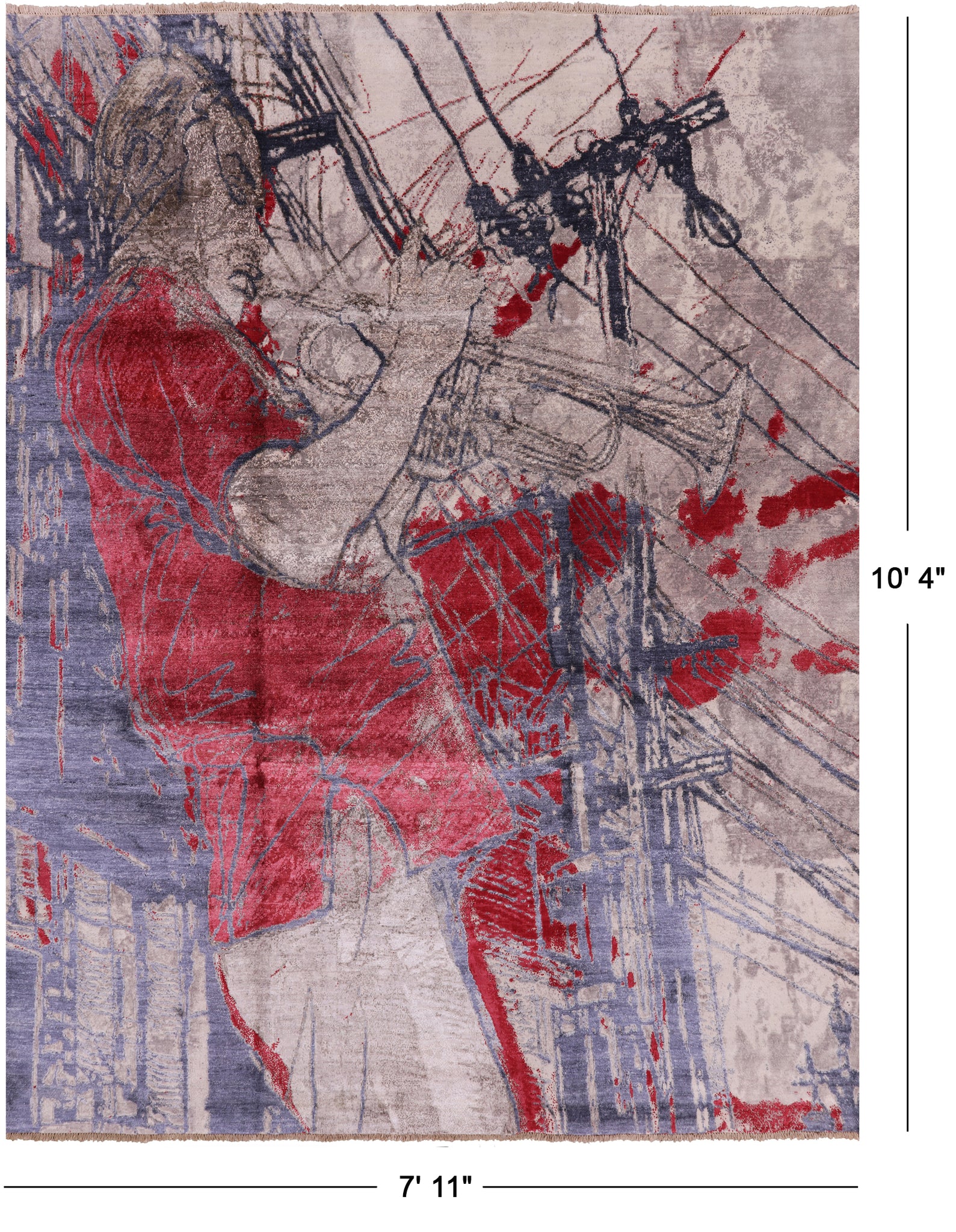 Trumpet Player Design Modern Hand Knotted Wool & Silk Rug - 7' 11" X 10' 4"