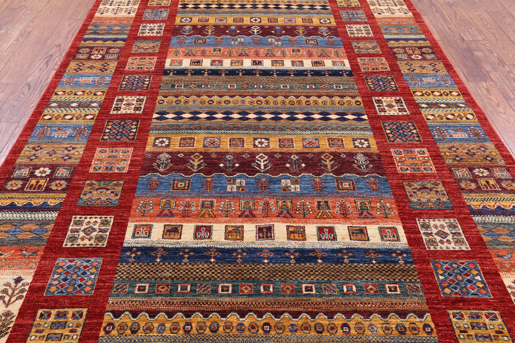 Gabbeh Rugs feature hand-spun wool in both the pile and foundation. These rugs are characterized by their abstract designs that relies upon open fields of color and a playfulness with geometric figures used to depict a story, person, or event. Gabbeh Rugs are popular in a contemporary or modern setting and are extremely durable, usually small to medium size.