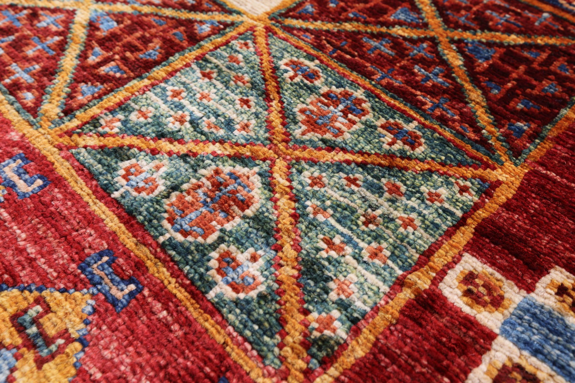 Gabbeh Rugs feature hand-spun wool in both the pile and foundation. These rugs are characterized by their abstract designs that relies upon open fields of color and a playfulness with geometric figures used to depict a story, person, or event. Gabbeh Rugs are popular in a contemporary or modern setting and are extremely durable, usually small to medium size.