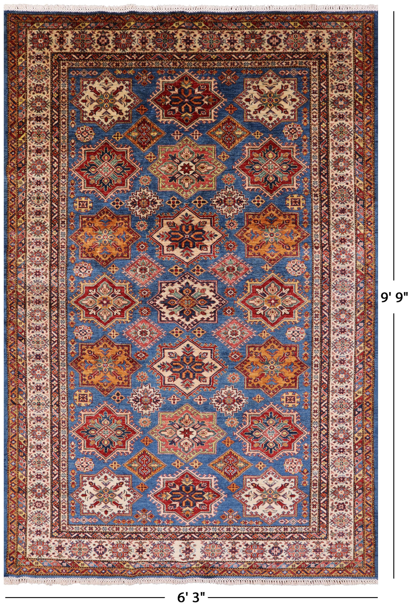 Blue Super Kazak Hand Knotted Area Rug - 6' 3" X 9' 9"