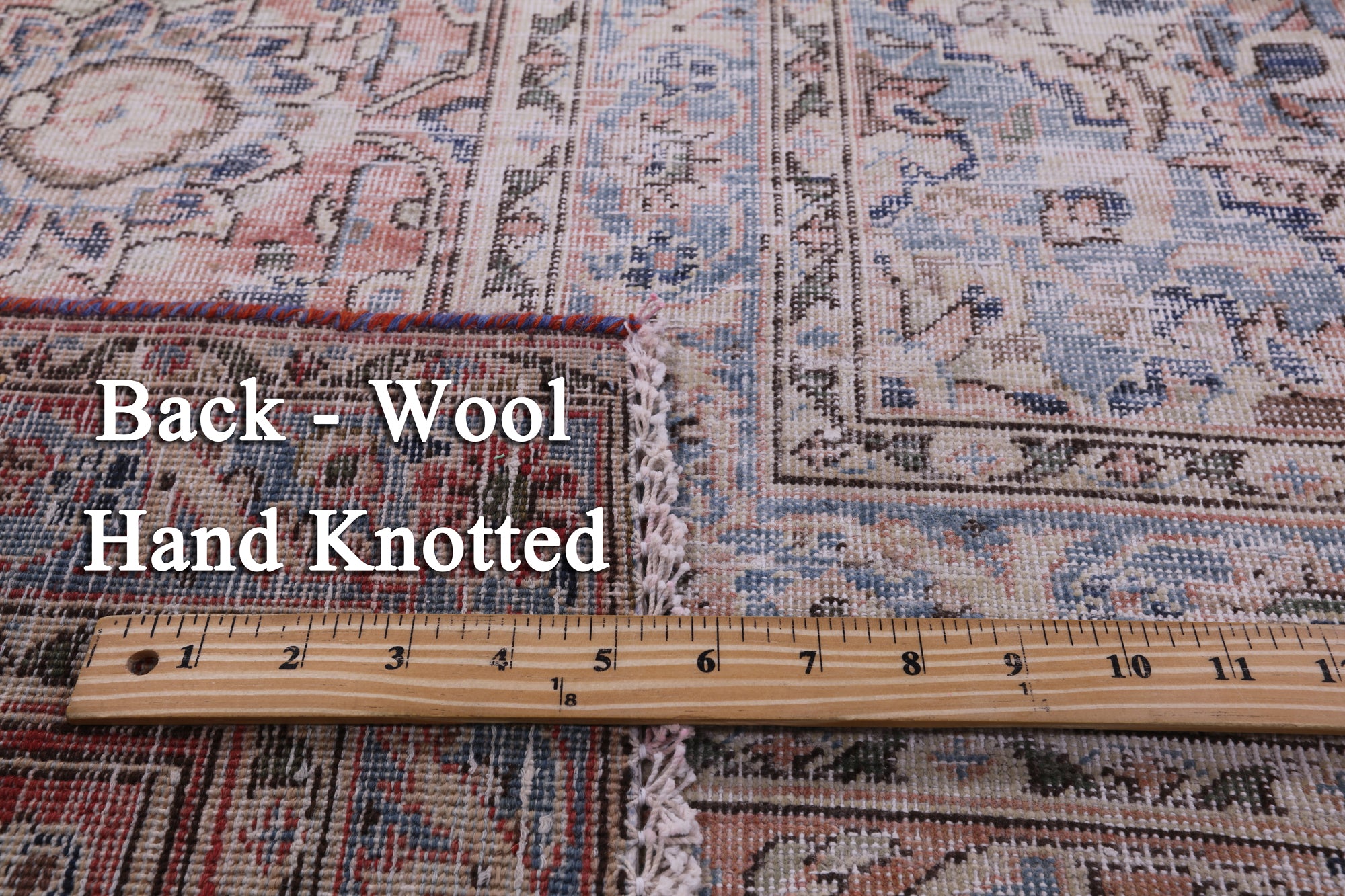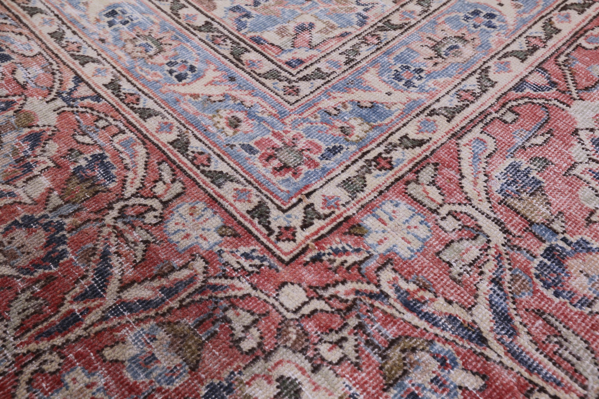 White wash rugs undergo a series of processes to neutralize & lift the original color of the rug. This includes a mixture of washes & natural sun bleaching. During this process, the pattern is not removed, but instead the outline of the design is left, creating a foundation ready to be re-imagined. This piece has the charming white washed light colors palette that gives it the highly appreciated vintage look, plus the density quality of a high number of knots per square inch.
