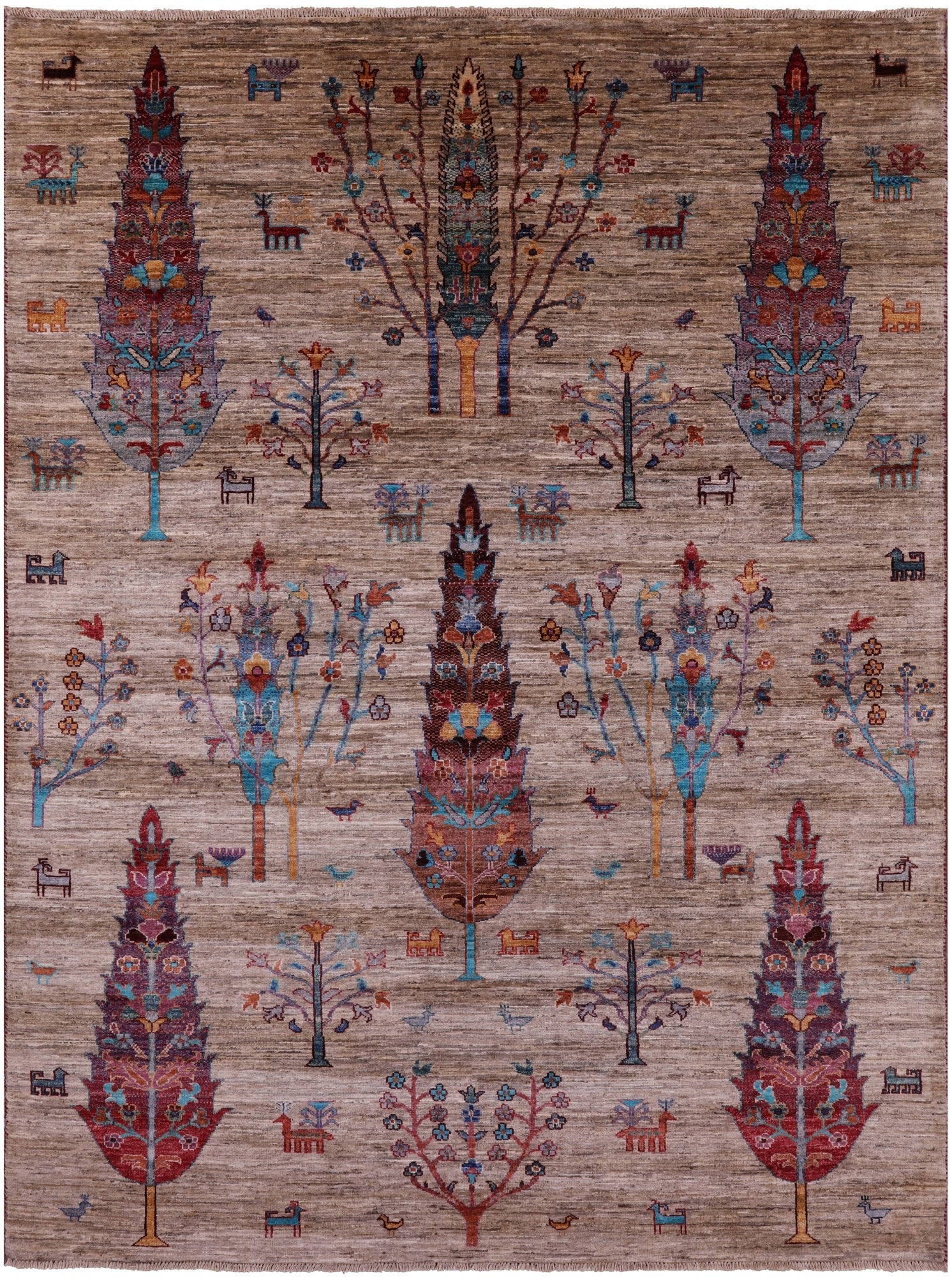 Gabbeh Rugs originate from South-Central Iran, and feature hand-spun wool in both the pile and foundation as well as all natural dyes. Gabbeh patterns are very basic, mostly consisting of colorful rectangular objects resembling animals, or people, abstract scenery used to tell a story, depict a person or place. They contain soft lustrous wool, and emphasizes color on design detail. These Classic Persian Rugs are popular in homes with contemporary & modern interior.