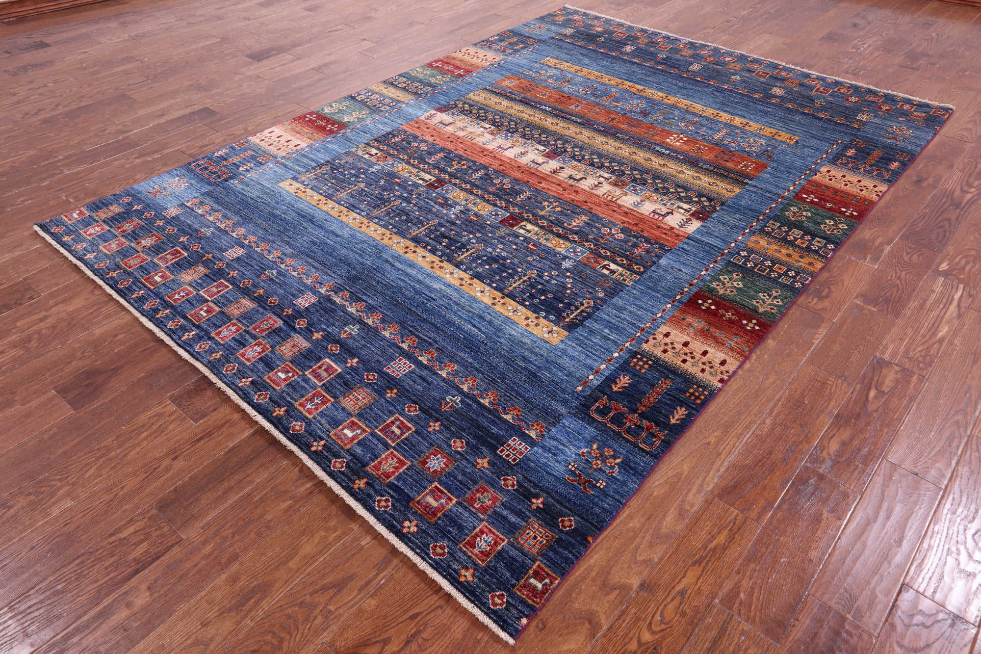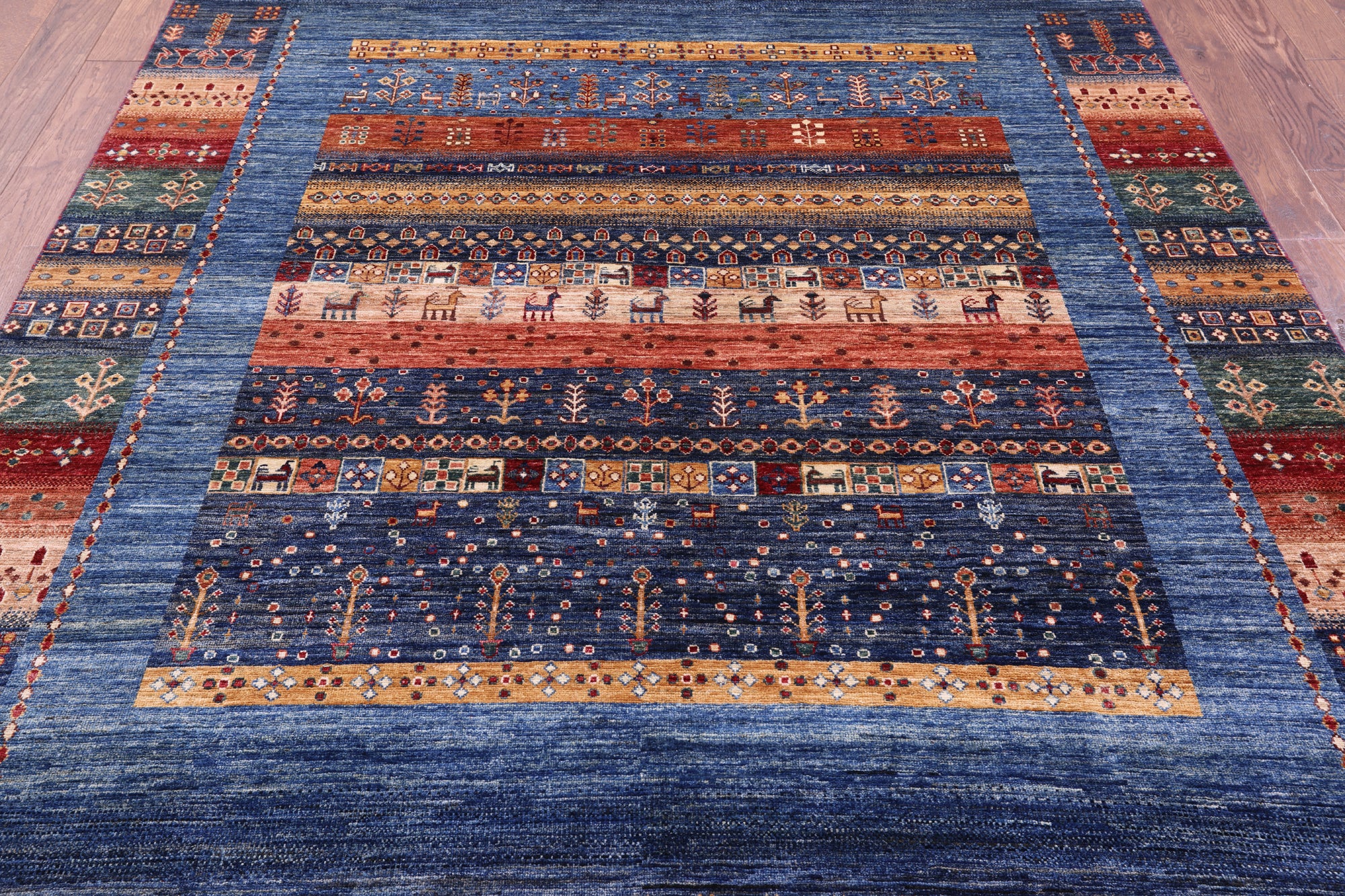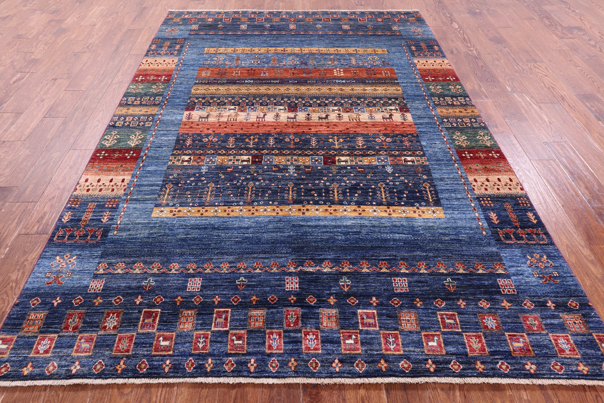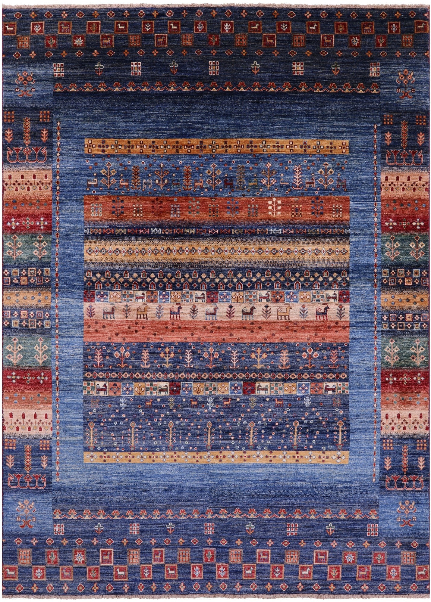 Gabbeh Rugs originate from South-Central Iran, and feature hand-spun wool in both the pile and foundation as well as all natural dyes. Gabbeh patterns are very basic, mostly consisting of colorful rectangular objects resembling animals, or people, abstract scenery used to tell a story, depict a person or place. They contain soft lustrous wool, and emphasizes color on design detail. These Classic Persian Rugs are popular in homes with contemporary & modern interior.