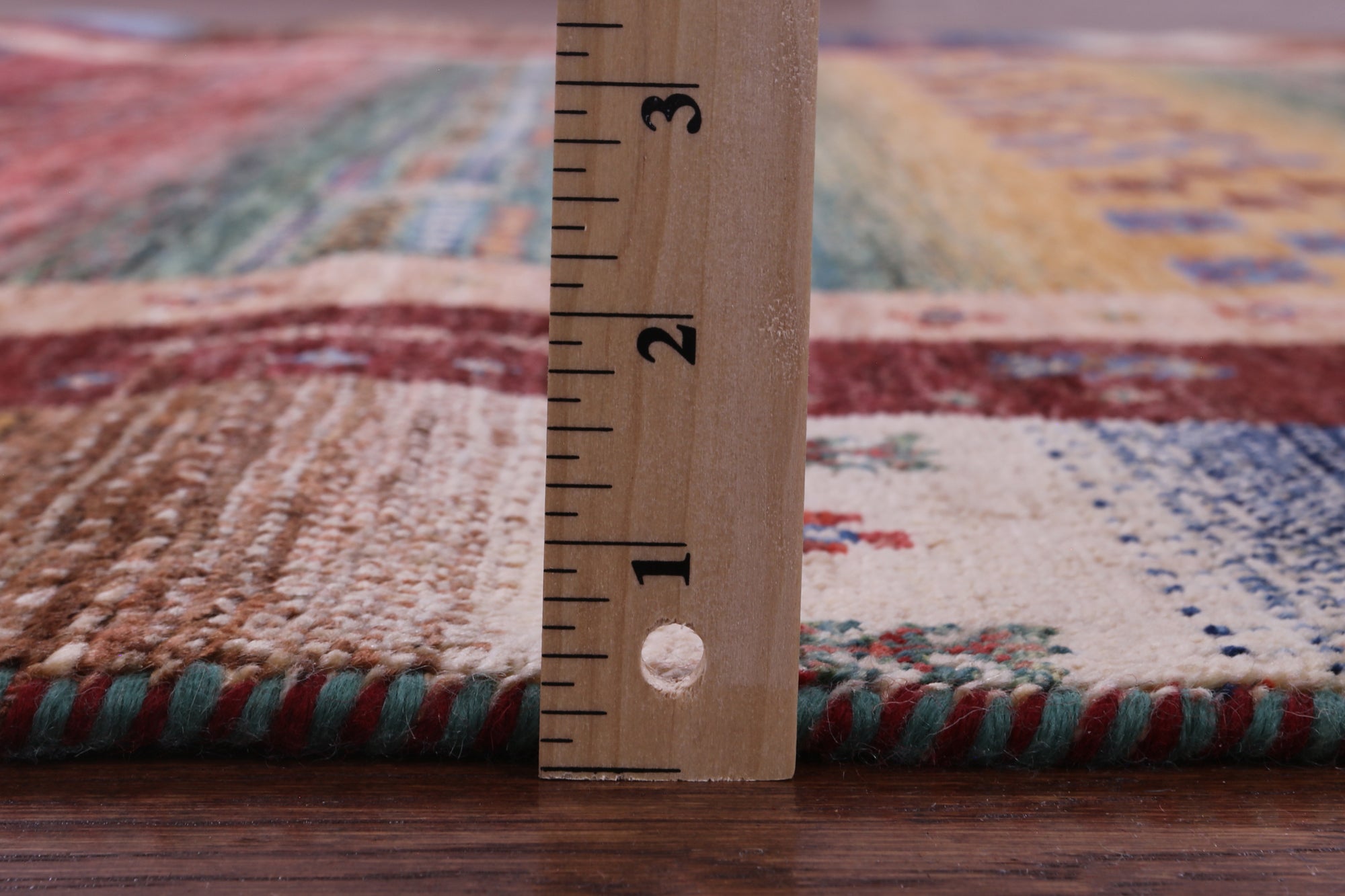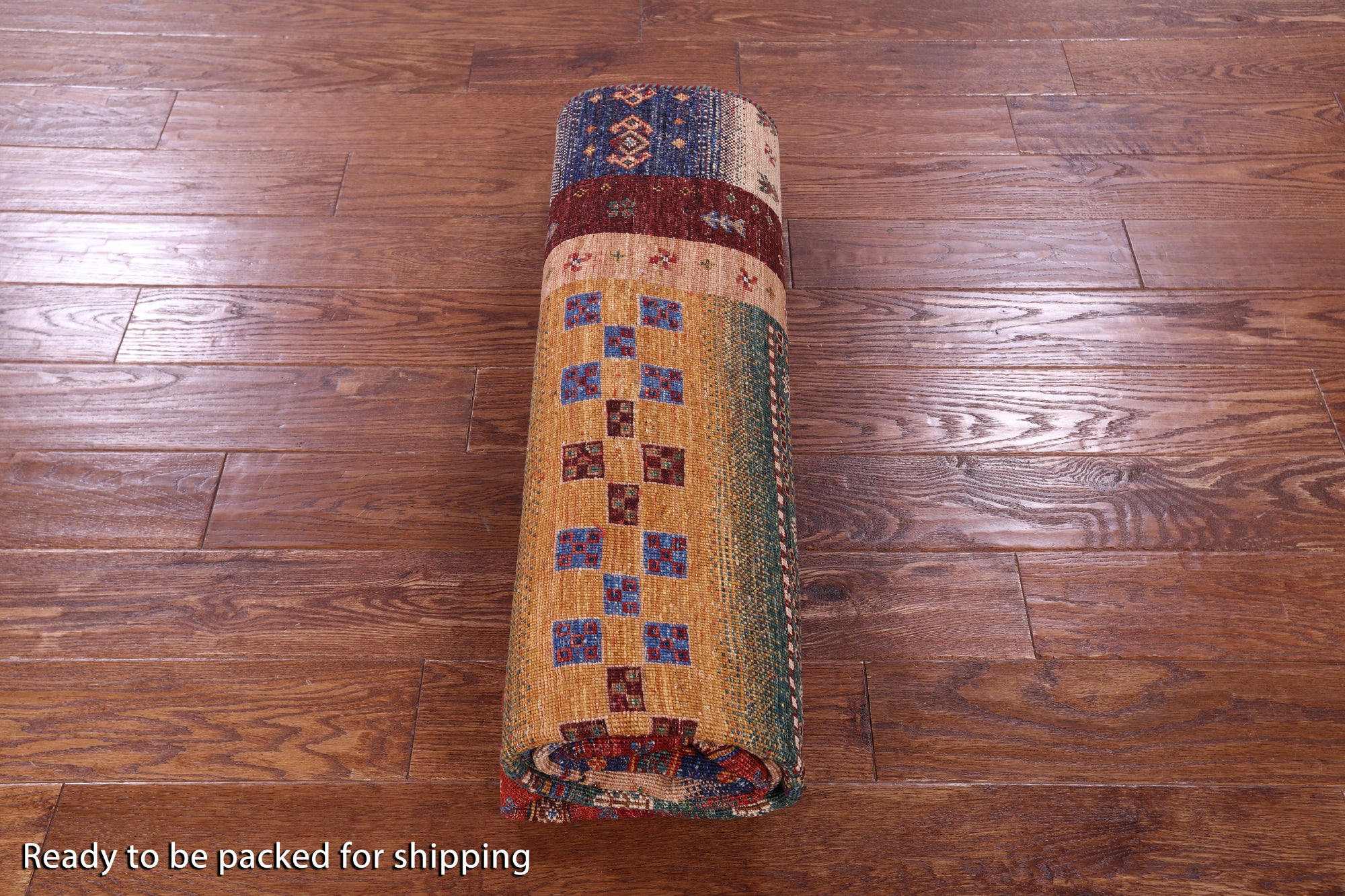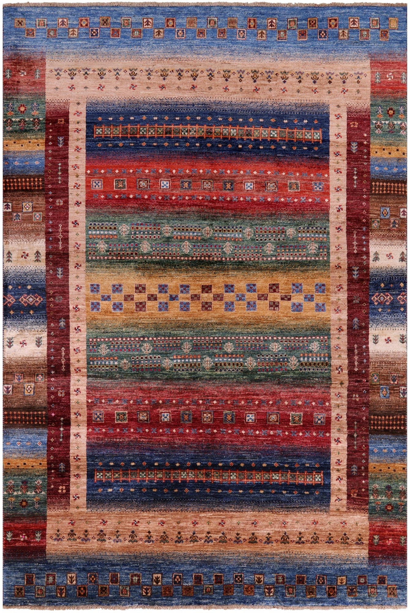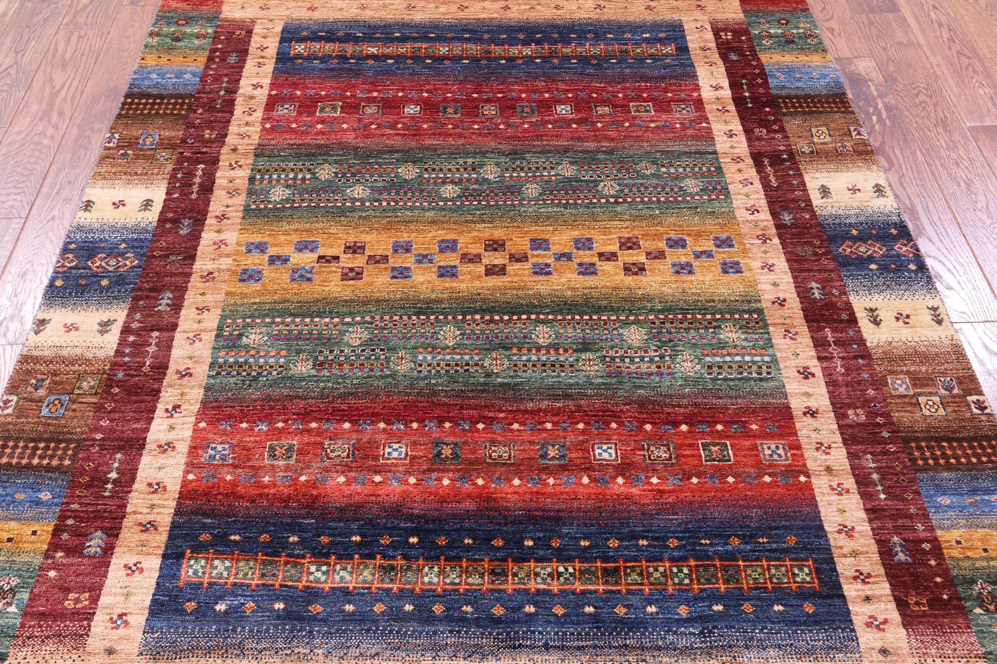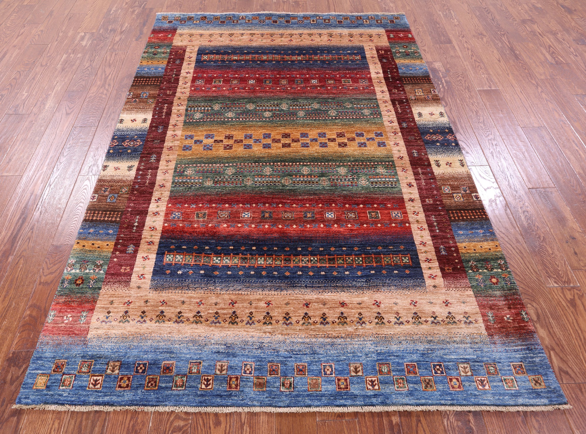 Gabbeh Rugs originate from South-Central Iran, and feature hand-spun wool in both the pile and foundation as well as all natural dyes. Gabbeh patterns are very basic, mostly consisting of colorful rectangular objects resembling animals, or people, abstract scenery used to tell a story, depict a person or place. They contain soft lustrous wool, and emphasizes color on design detail. These Classic Persian Rugs are popular in homes with contemporary & modern interior.