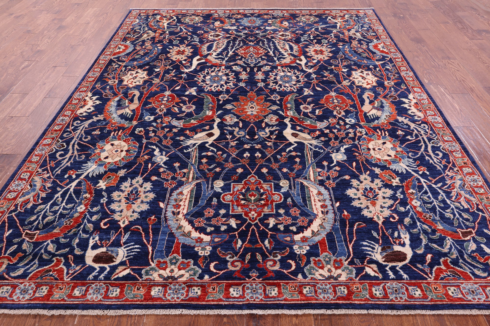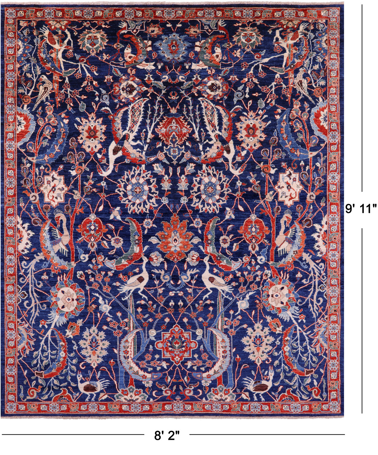 Blue Exotic Birds Persian Fine Serapi Hand Knotted Wool Rug - 8' 2" X 9' 11"