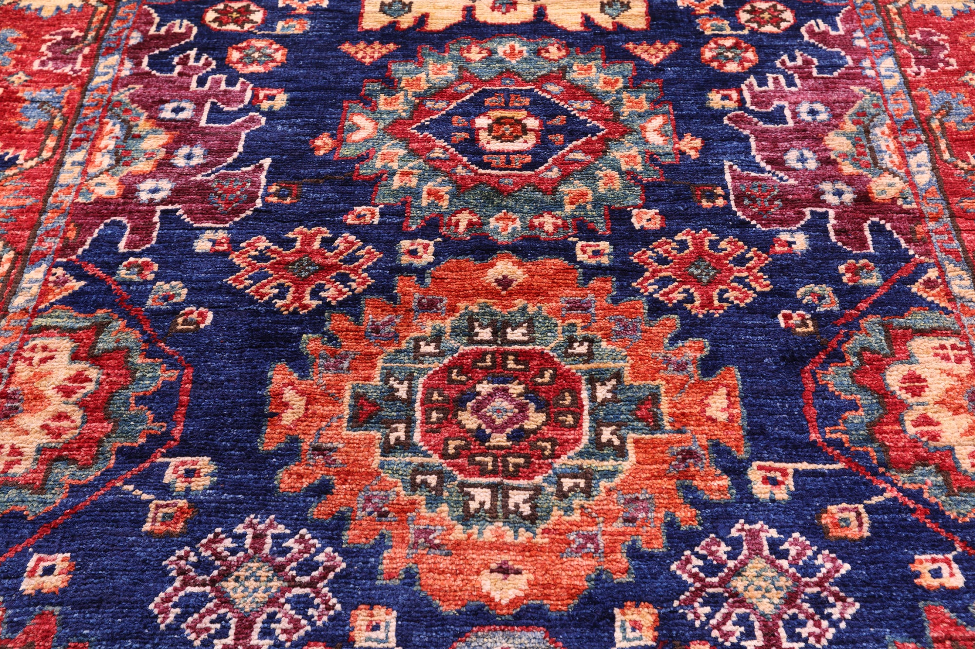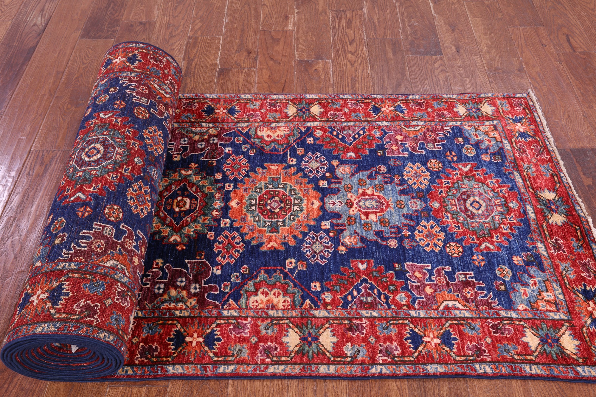 Heriz Serapi rugs are commonly known to be highly durable and are great for high traffic areas. Their medallions can be seen as large and angular, surrounded by more rigid lines and flowy floral patterns or they can also come in strictly geometric floral designs all symmetrically placed. The colors are elegant reds and indigos set against creamy ivory.