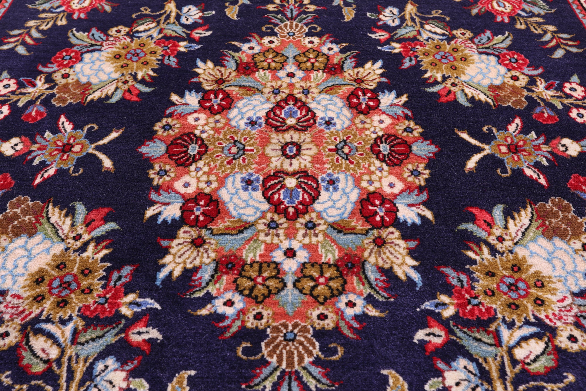 Qum Rugs known for their delicate patterns and refined craftsmanship, Qum rugs feature elegant designs woven from fine wool or silk. Their rich colors and detailed motifs bring timeless beauty and sophistication to any room.