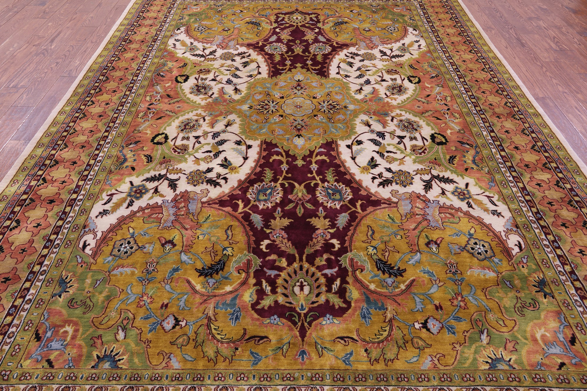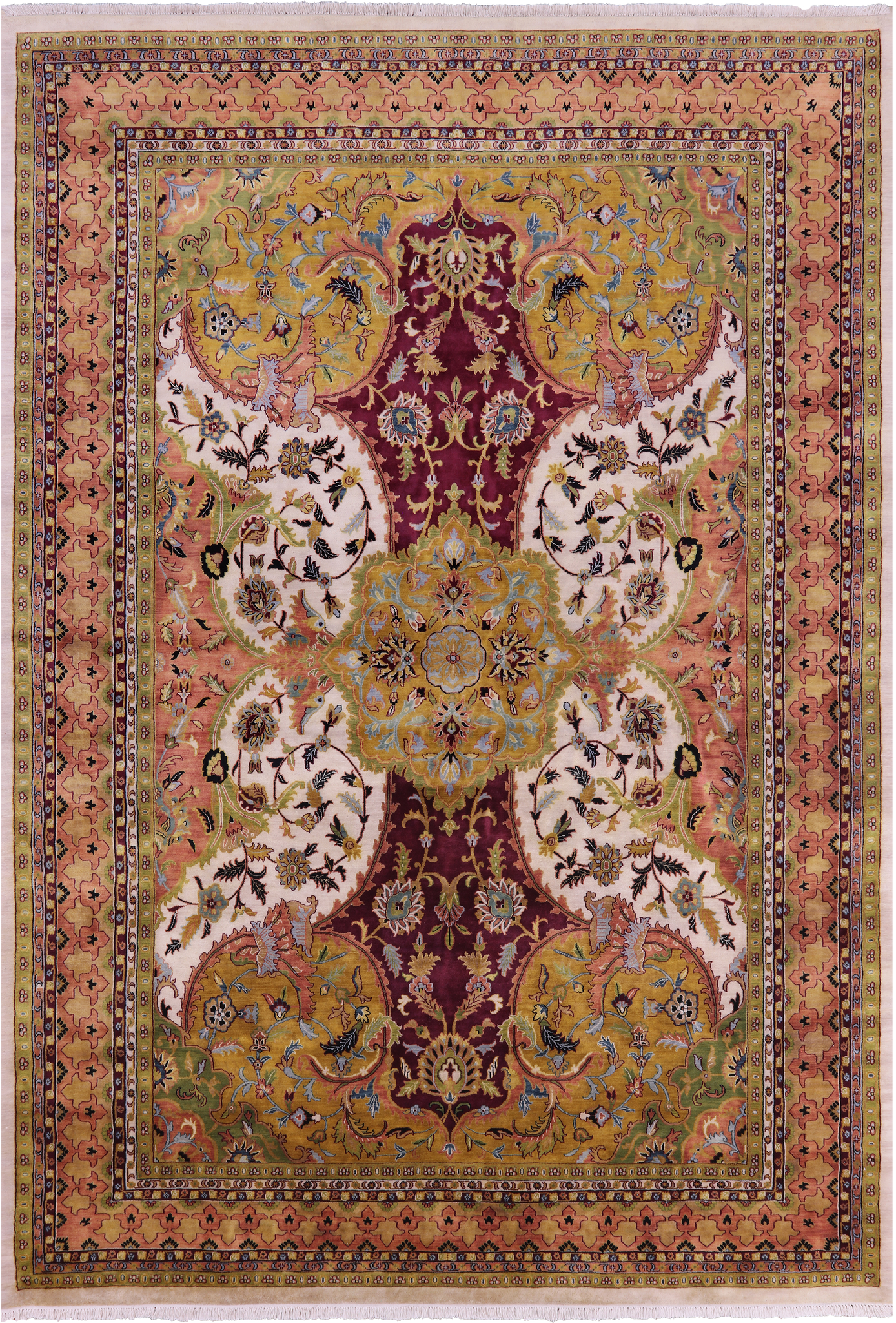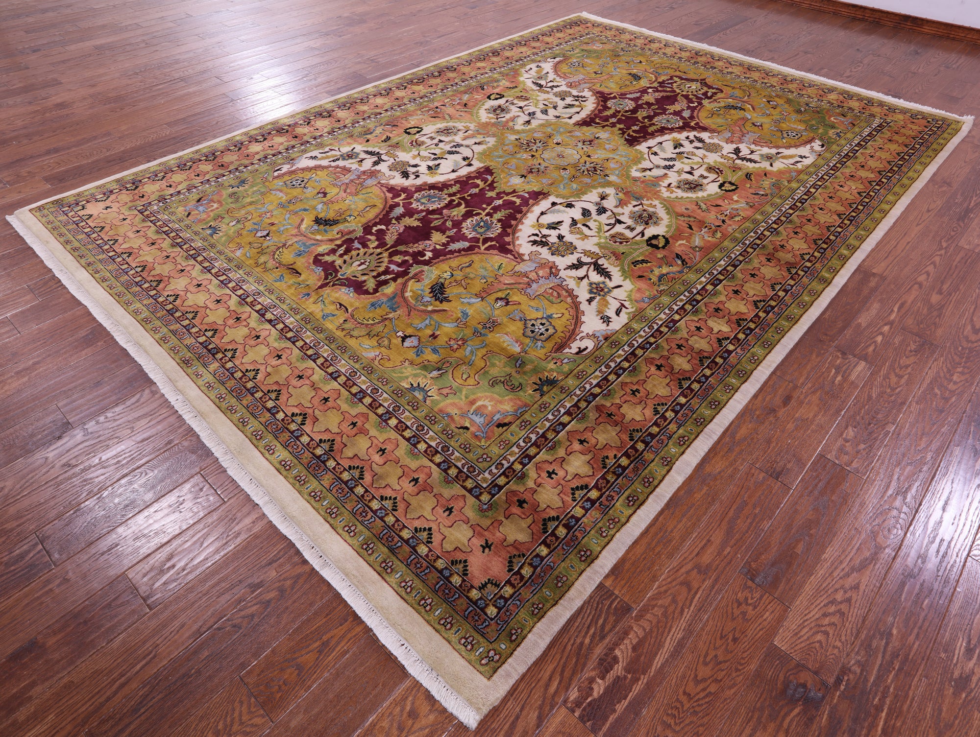 Tabriz Rugs are the most diverse and innovative in Persia due to its high-quality. Tabriz designs are hand-knotted with fine soft wool or silk, on a silk or cotton foundation, and may have either a thin silk, or wool pile. Their patterns consists of medallions surrounded by weeping willows, a cluster of trees and/or cypresses, arabesques (ornamental designs), and most popular, the four seasons used to depict the life of the Persian farmer. Their rich colors consist of red & blue with an ivory background, while newer Tabriz Rugs have softer colors such as green, blue and brown to correspond with modern interiors.