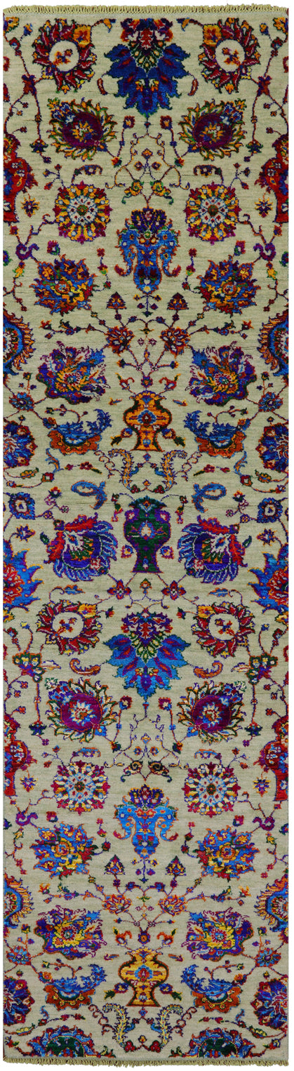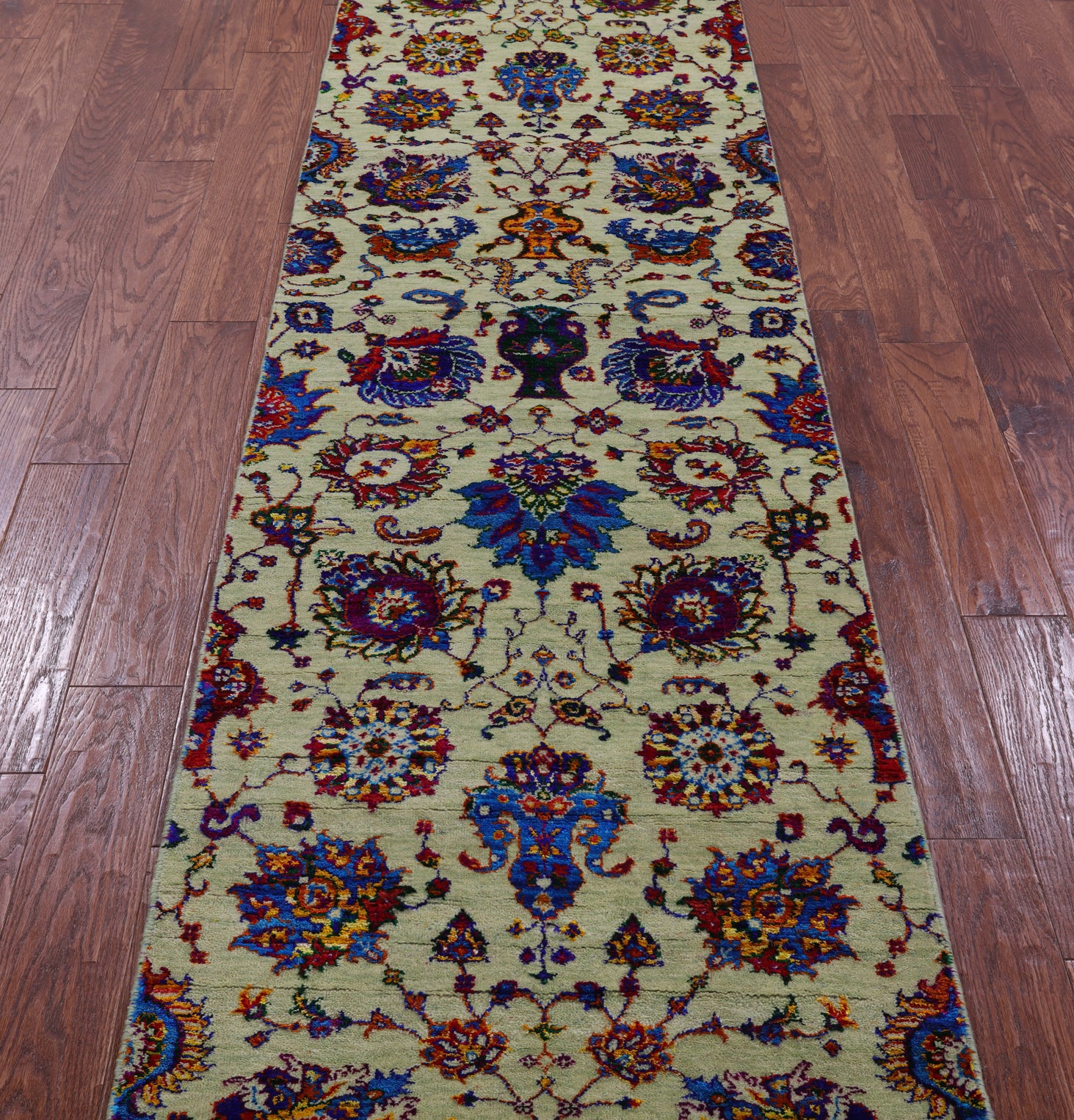 Green Persian Tabriz Hand Knotted Wool & Silk Runner Rug - 2' 7" X 9' 10"