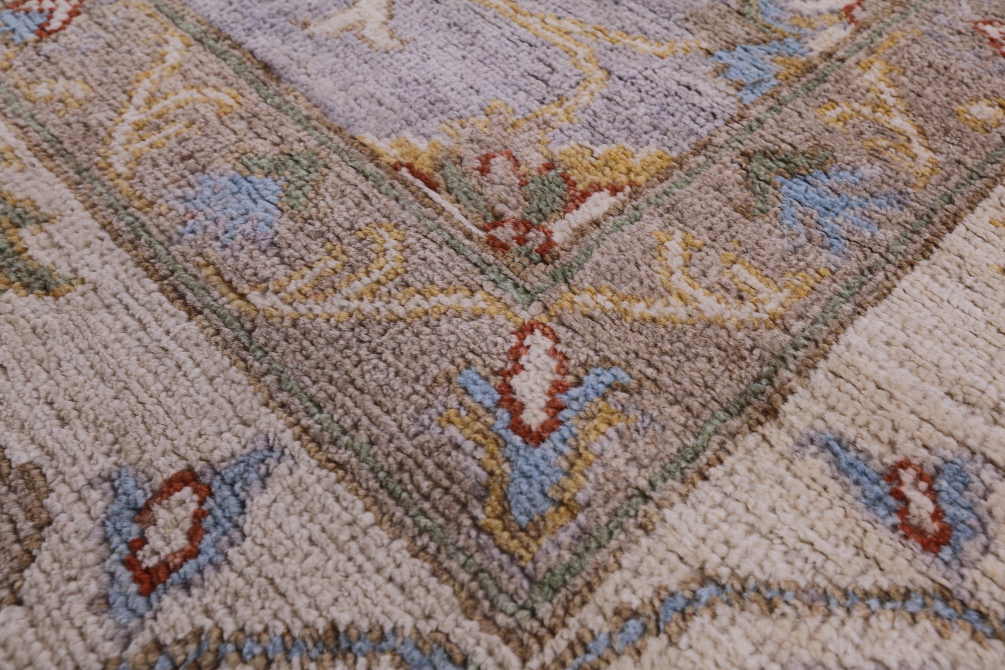 Oushak Rugs are distinctive in both pattern and color palette. Most have a blue, green, dark ivory, or gold & their designs are typically based on geometric motifs and vine / leave motifs. All colors are created with natural vegetable dyes, and the hushed tones are enhanced by the soft, lustrous wool texture. The foundation of an Oushak is cotton while the pile is wool. Oushak rugs are also double-knotted for durability.