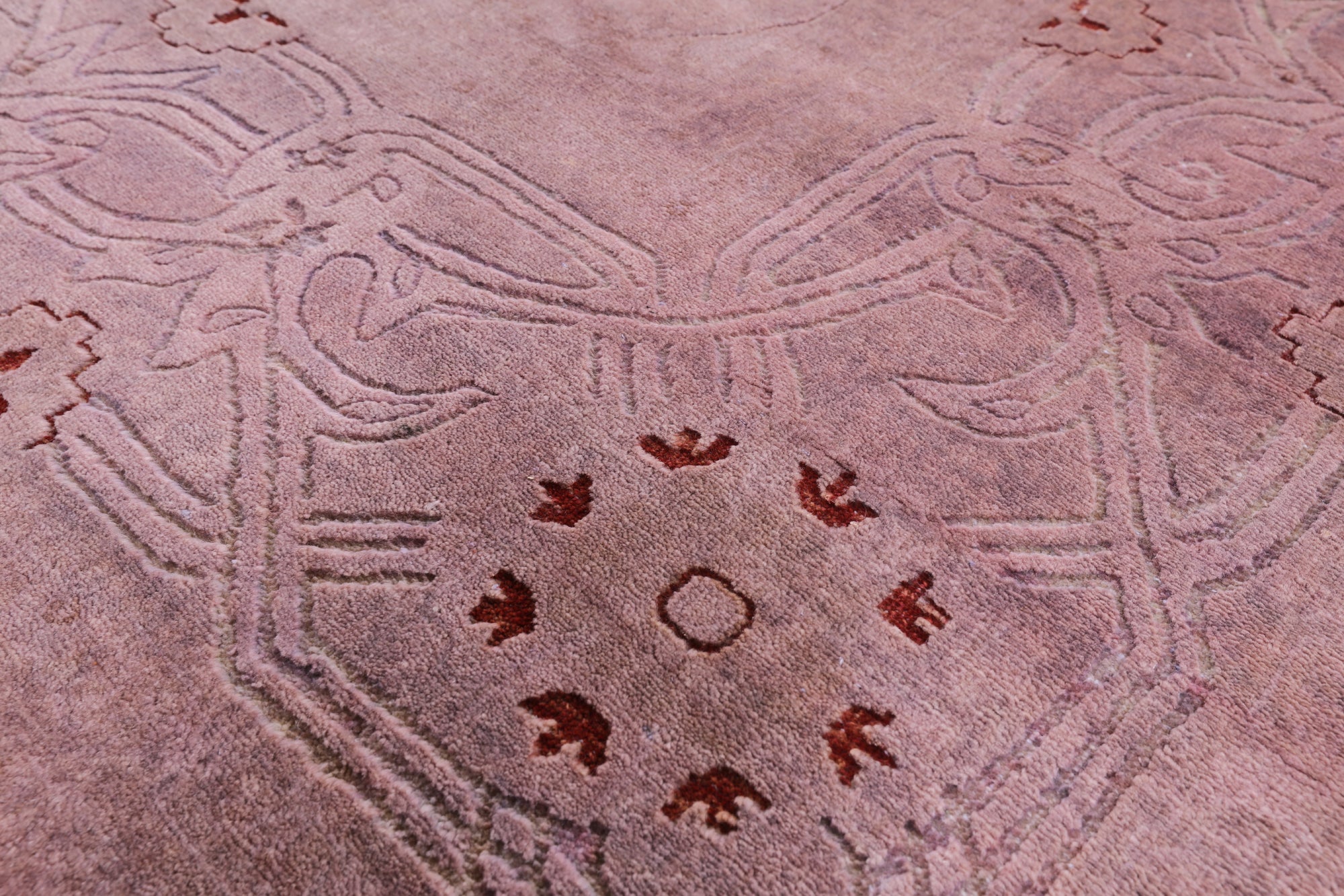 Overdyed rugs undergo a series of processes to neutralize & lift the original color of the rug. This includes a mixture of chemical washes & natural sun bleaching. During this process, the pattern is not removed, but instead the outline of the design is left, creating a foundation ready to be re-imagined. The carpets are then dyed in one color, sometimes repeatedly in order to reach the desired saturation level.
