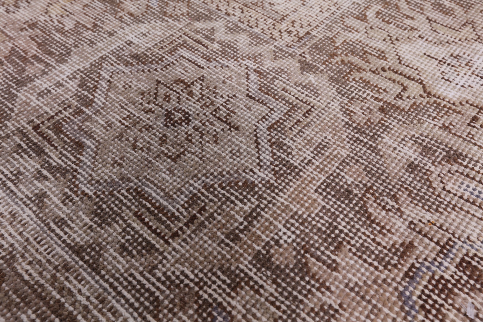 White wash rugs undergo a series of processes to neutralize & lift the original color of the rug. This includes a mixture of washes & natural sun bleaching. During this process, the pattern is not removed, but instead the outline of the design is left, creating a foundation ready to be re-imagined. This piece has the charming white washed light colors palette that gives it the highly appreciated vintage look, plus the density quality of a high number of knots per square inch.
