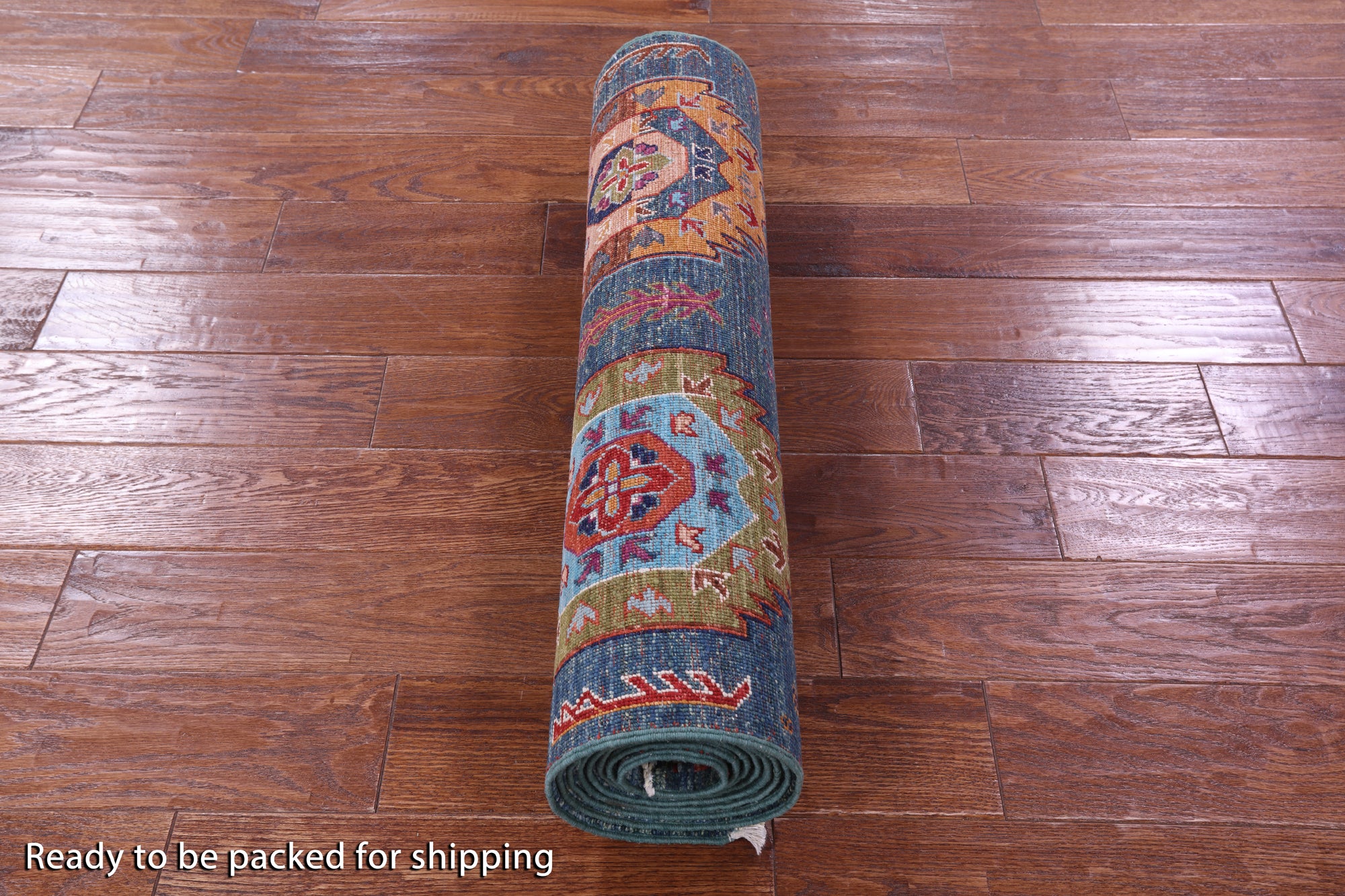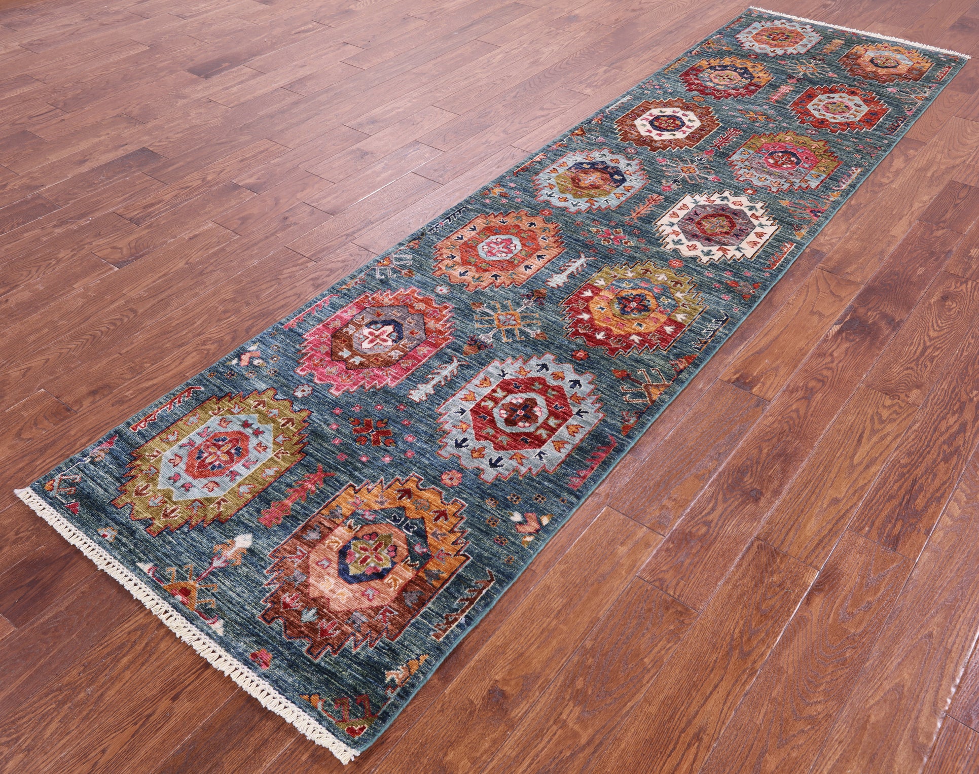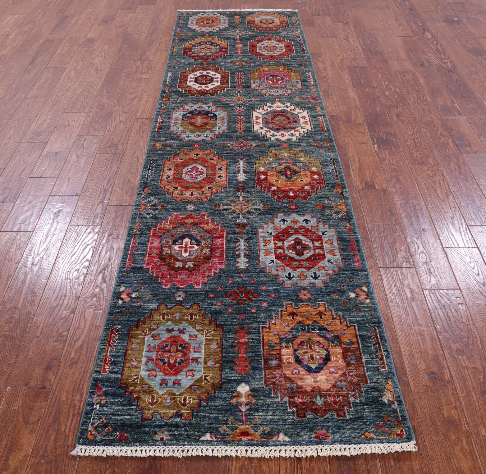 Green Turkmen Ersari Hand Knotted Wool Runner Rug - 2' 10" X 10' 7"