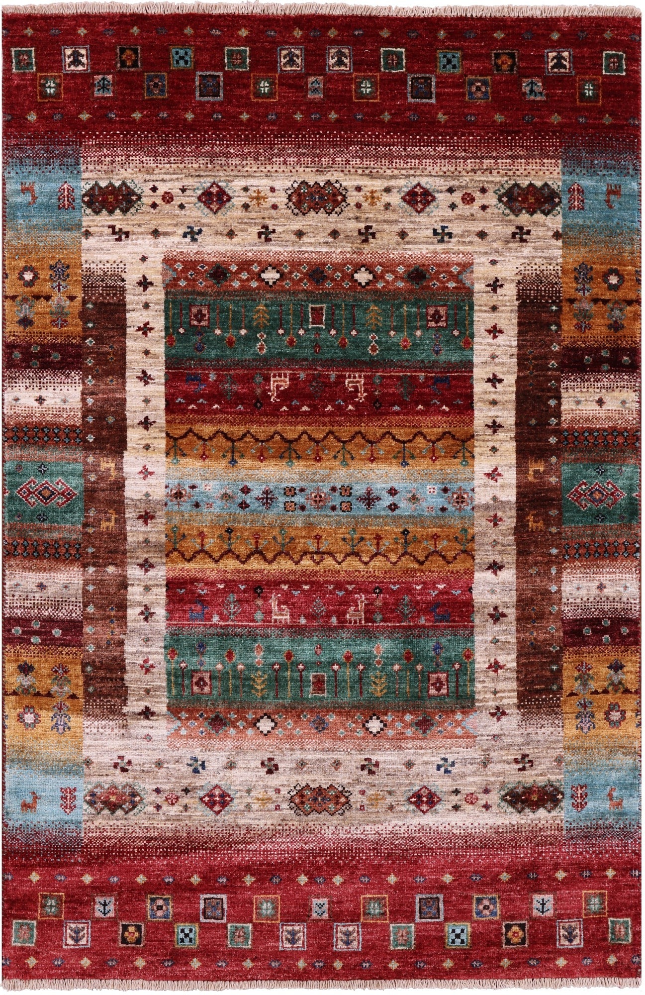 Gabbeh Rugs feature hand-spun wool in both the pile and foundation. These rugs are characterized by their abstract designs that relies upon open fields of color and a playfulness with geometric figures used to depict a story, person, or event. Gabbeh Rugs are popular in a contemporary or modern setting and are extremely durable, usually small to medium size.