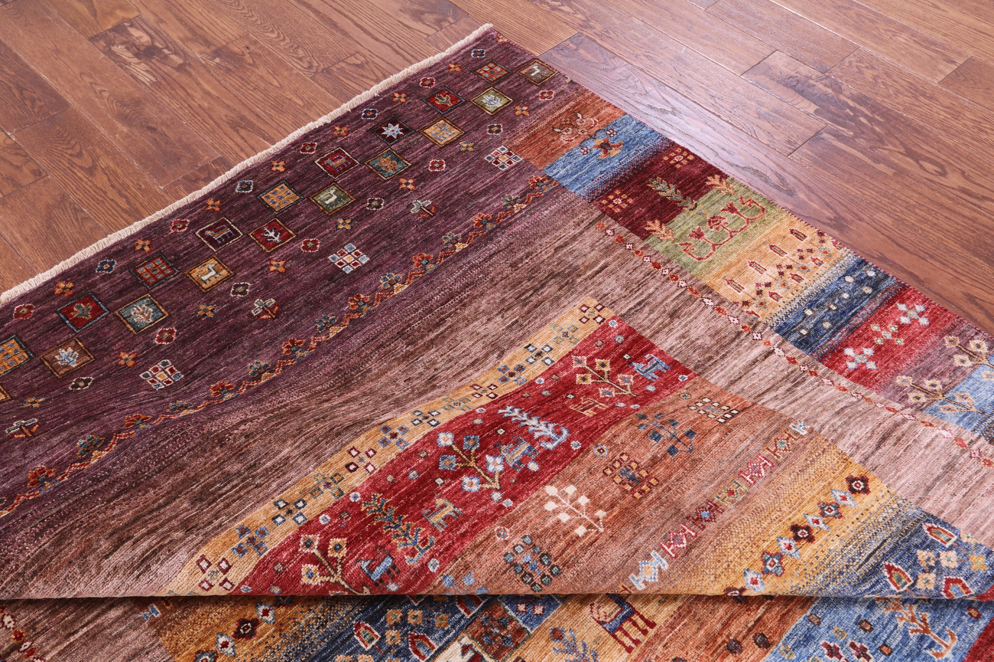 Gabbeh Rugs feature hand-spun wool in both the pile and foundation. These rugs are characterized by their abstract designs that relies upon open fields of color and a playfulness with geometric figures used to depict a story, person, or event. Gabbeh Rugs are popular in a contemporary or modern setting and are extremely durable, usually small to medium size.