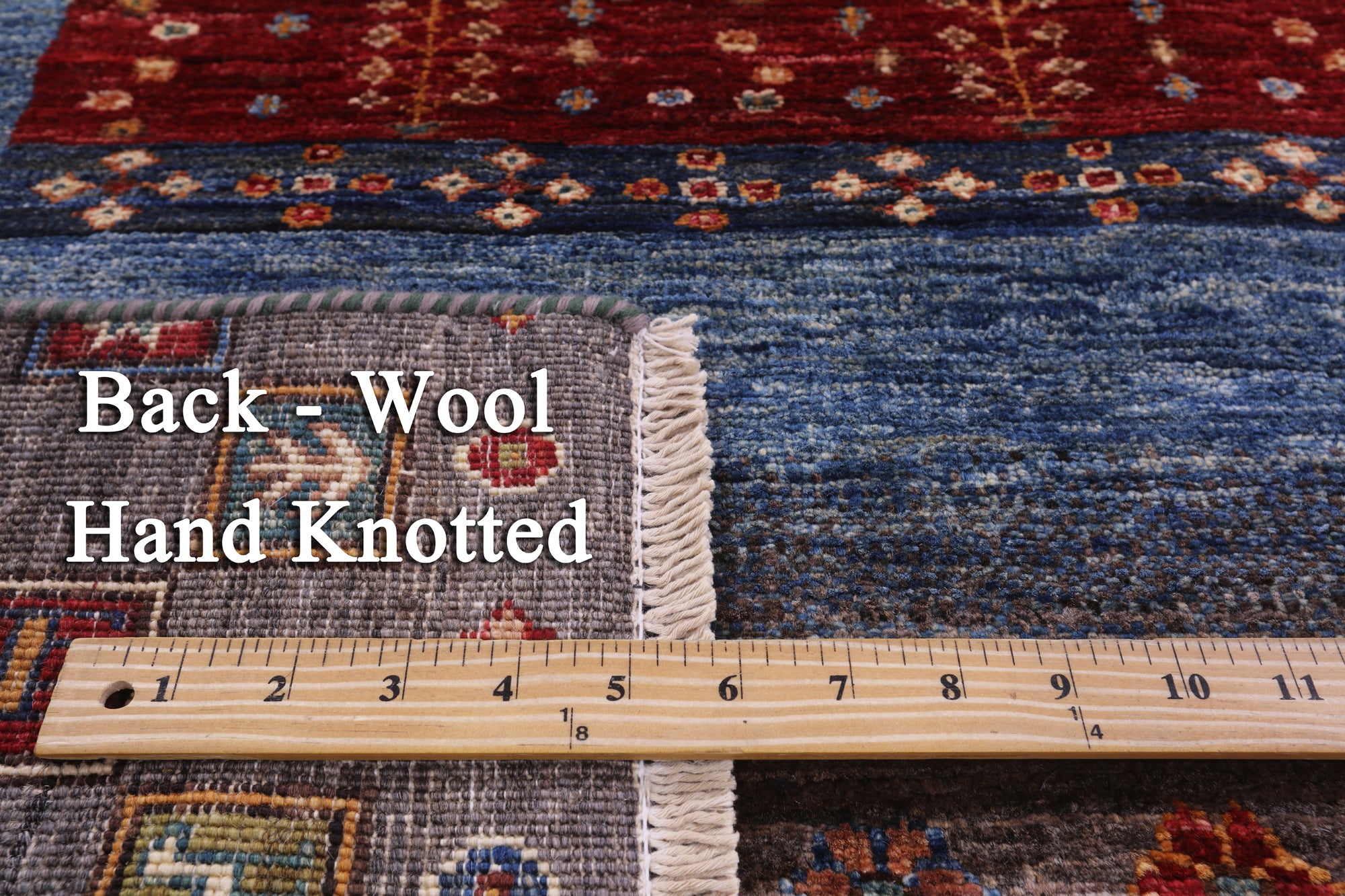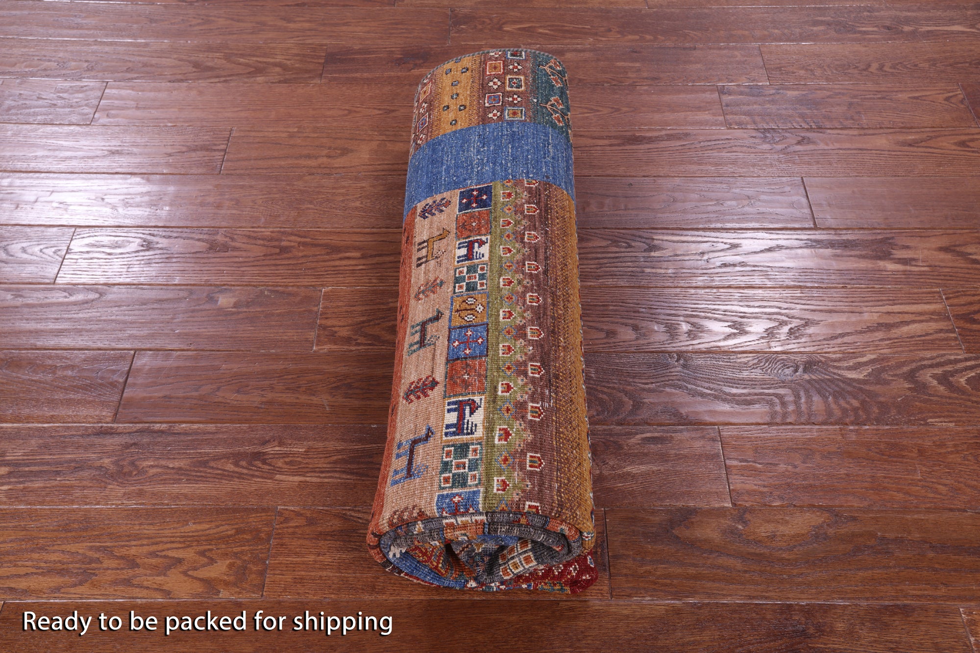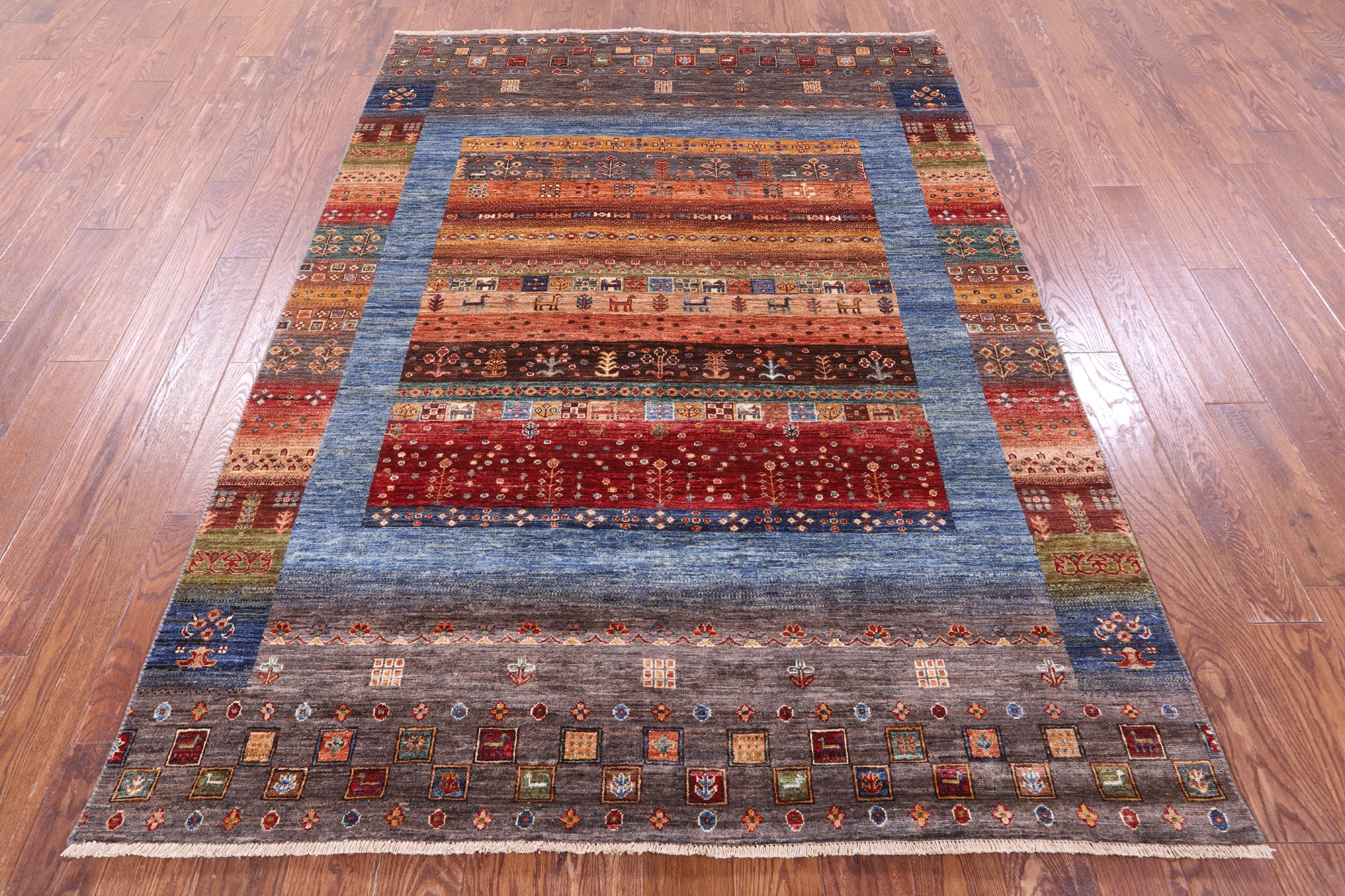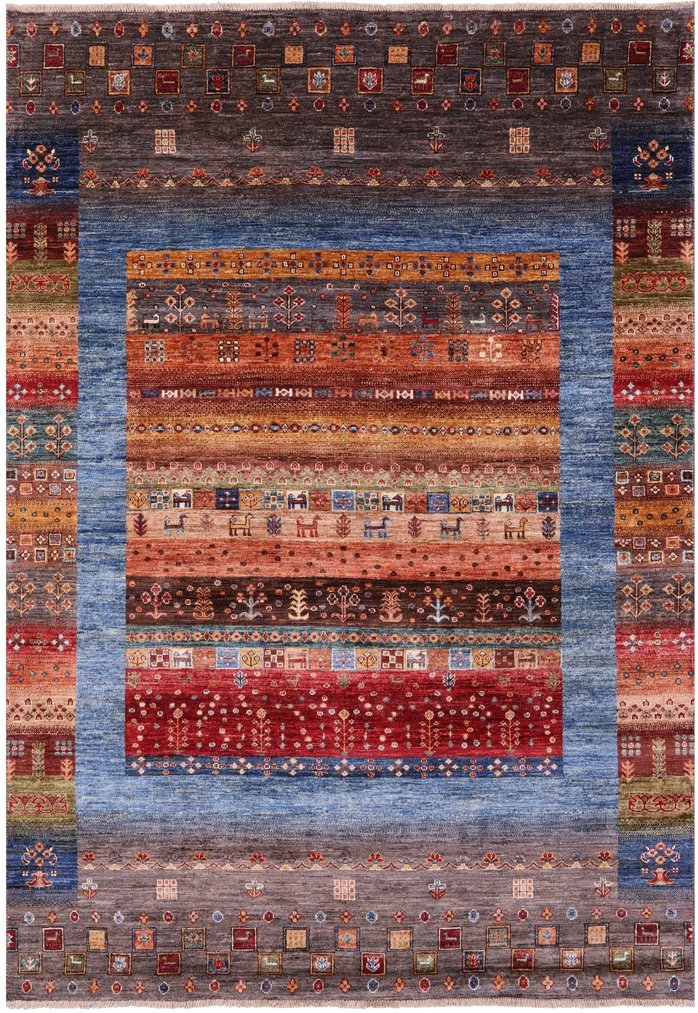 Gabbeh Rugs originate from South-Central Iran, and feature hand-spun wool in both the pile and foundation as well as all natural dyes. Gabbeh patterns are very basic, mostly consisting of colorful rectangular objects resembling animals, or people, abstract scenery used to tell a story, depict a person or place. They contain soft lustrous wool, and emphasizes color on design detail. These Classic Persian Rugs are popular in homes with contemporary & modern interior.