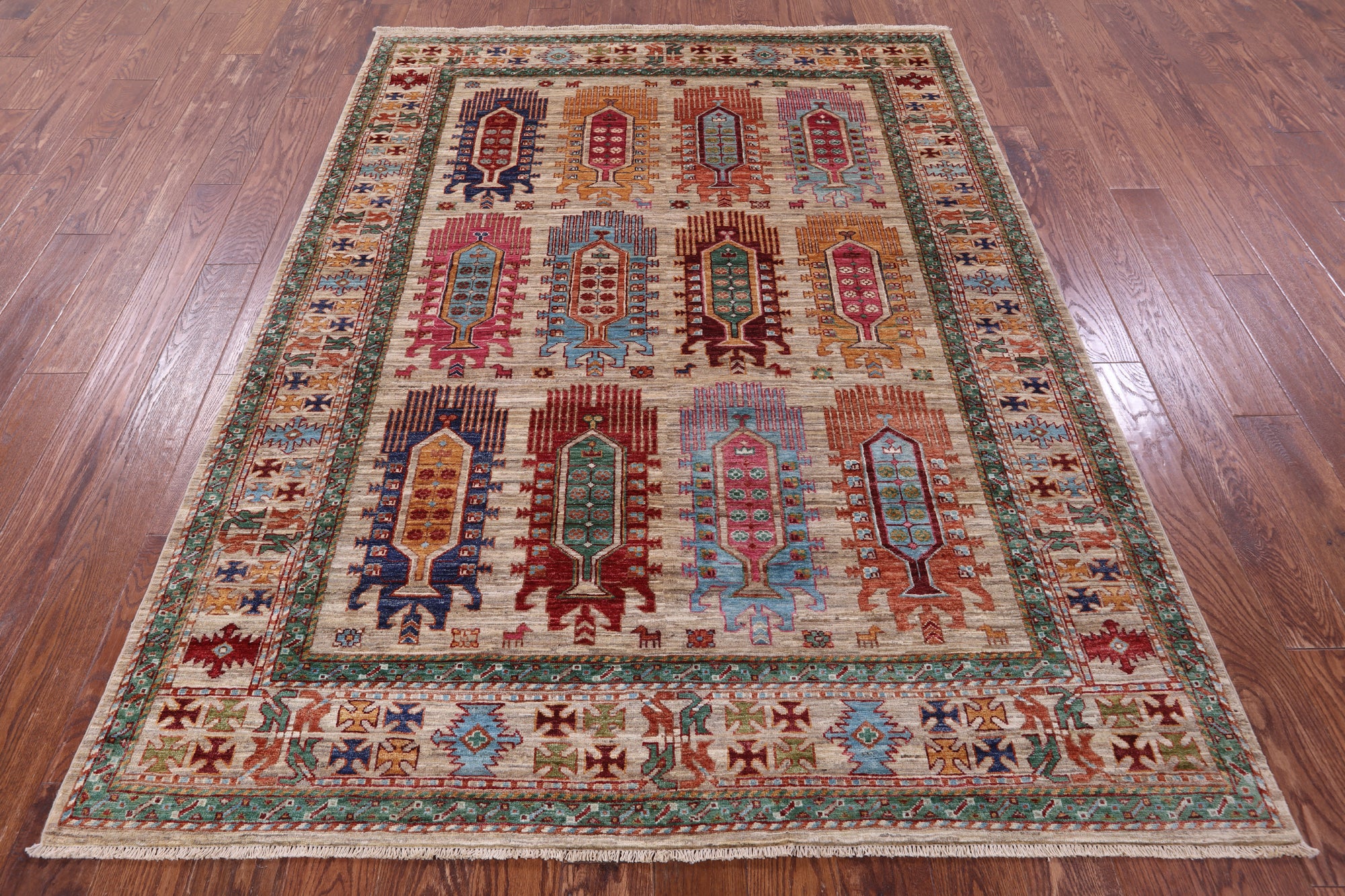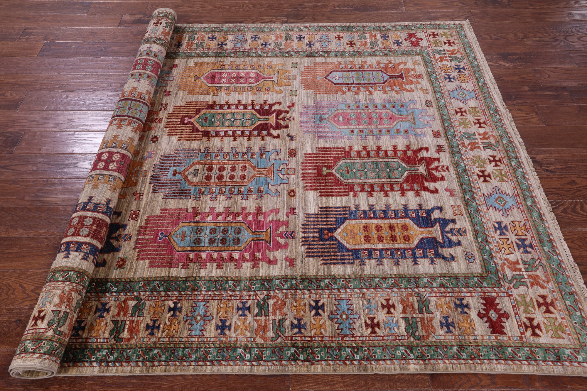 These tribal inspired rugs originated in central Asia, and are distinctive for their dominating color scheme with dark reds, blues, black and at times ivory. These rugs do tend to be small or midsized and have soft wool, but have a hard pile that is cut thin, which makes them quite durable. Turkman rugs are the finest of the tribal rugs that have been produced to date.