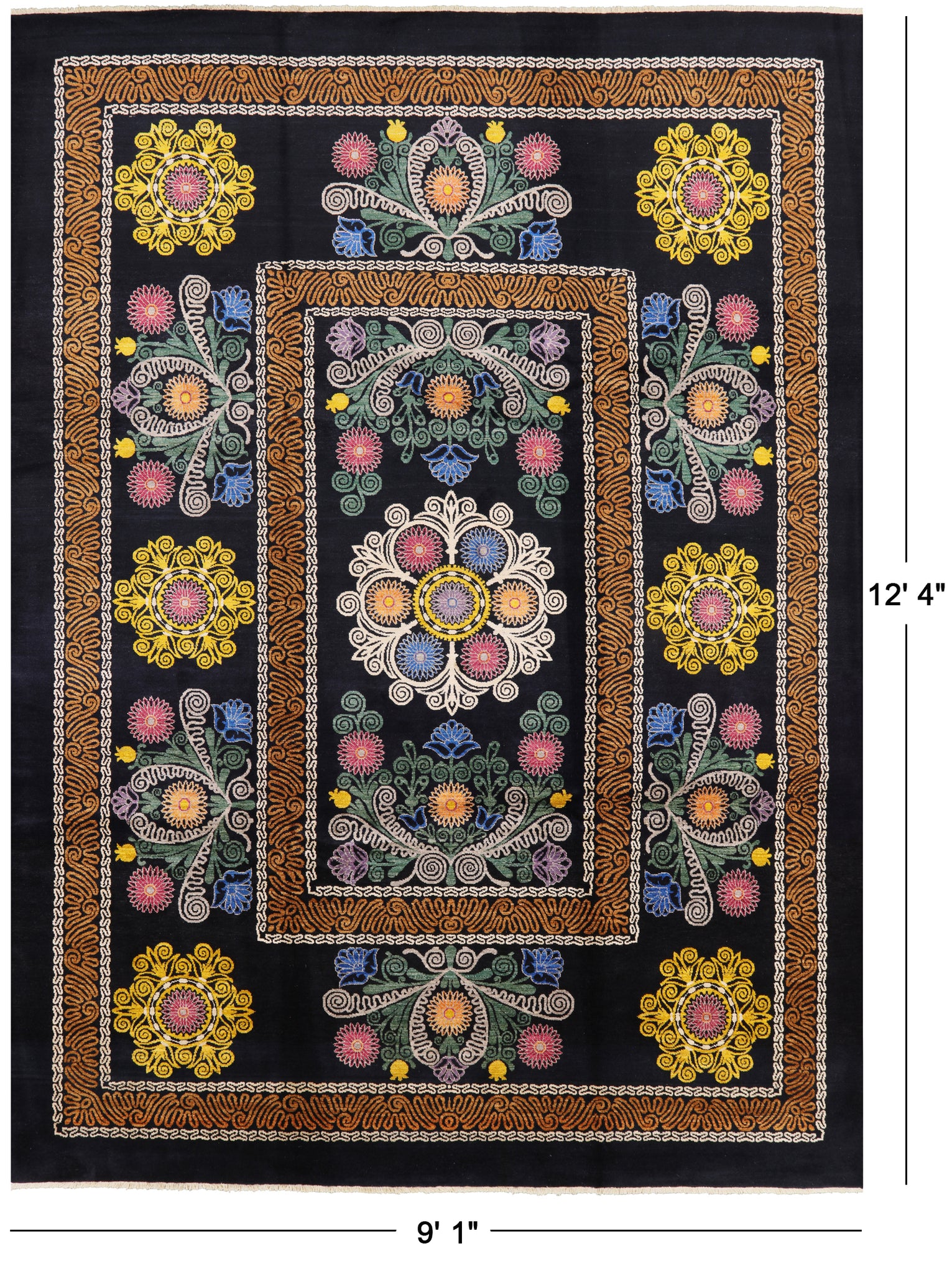 Black William Morris Hand Knotted Wool Area Rug - 9' 1" X 12' 4"