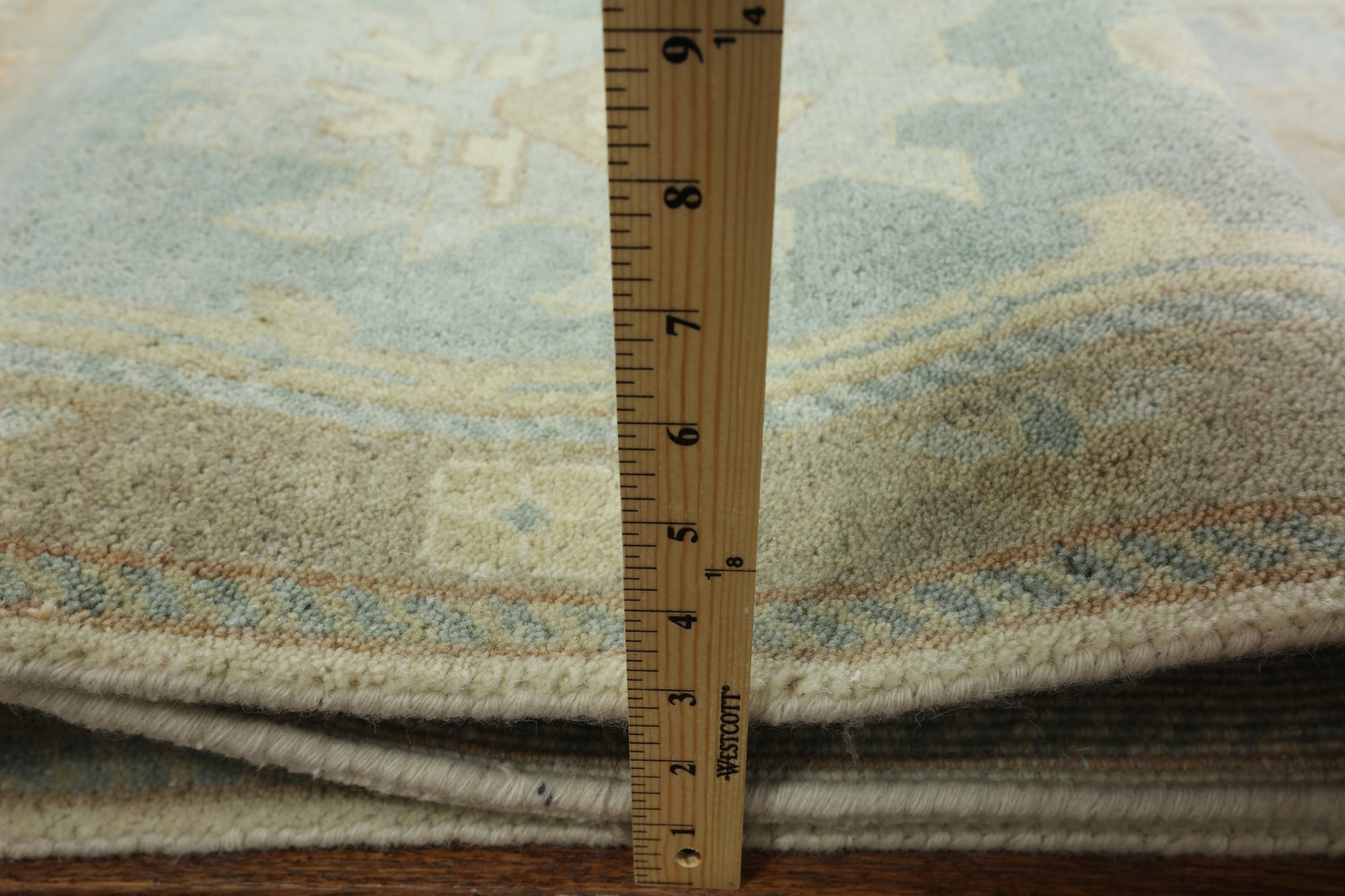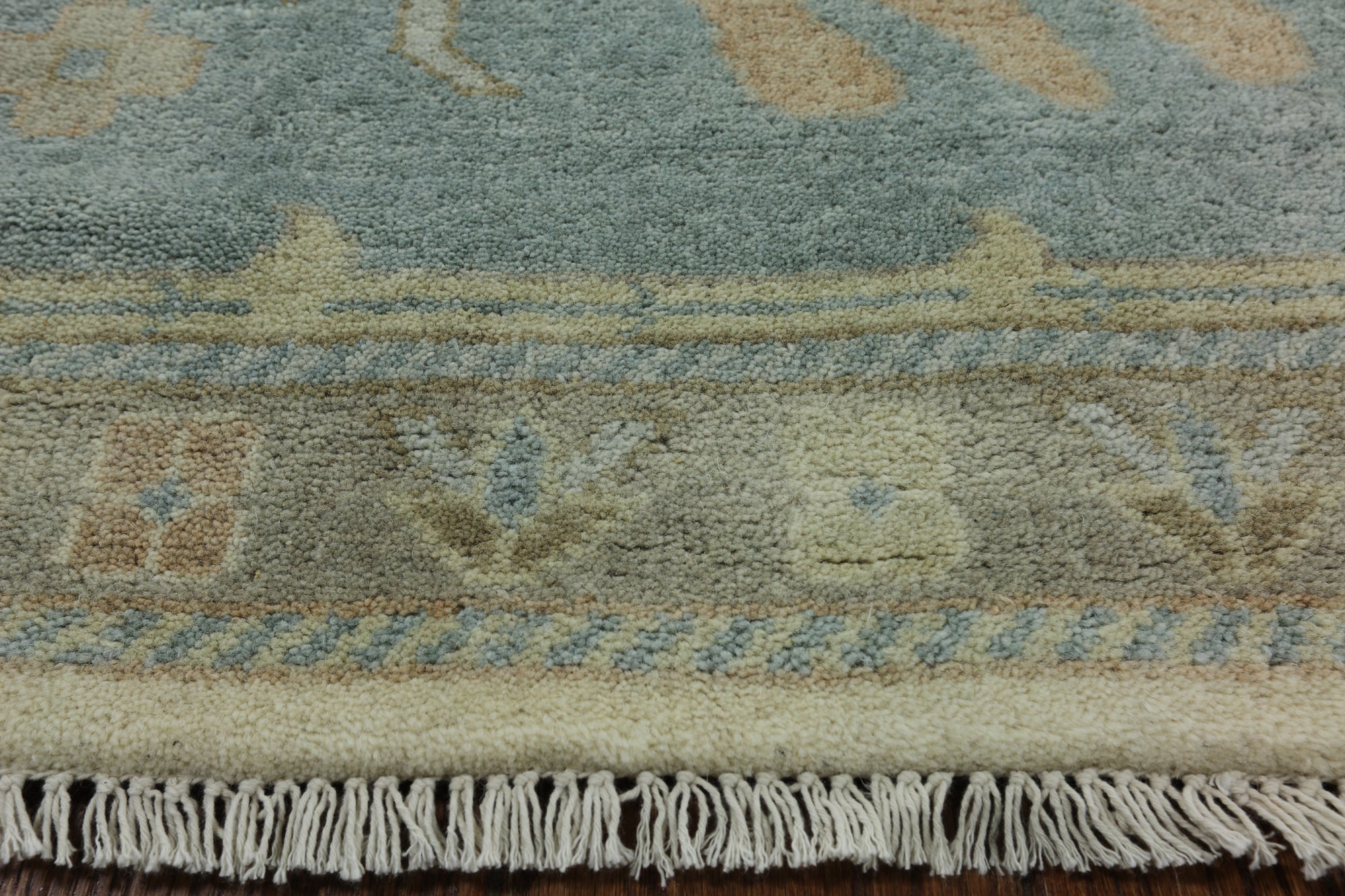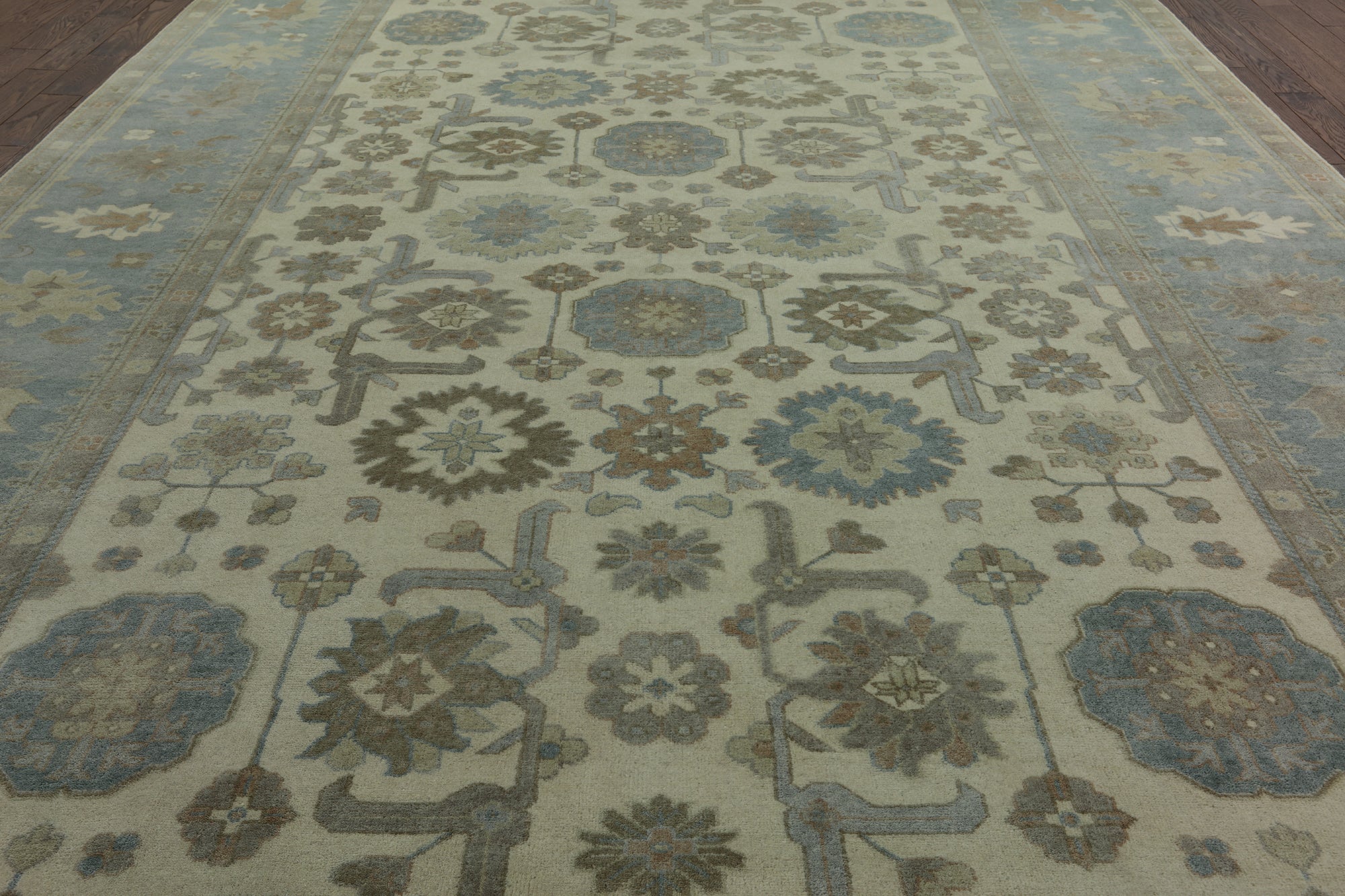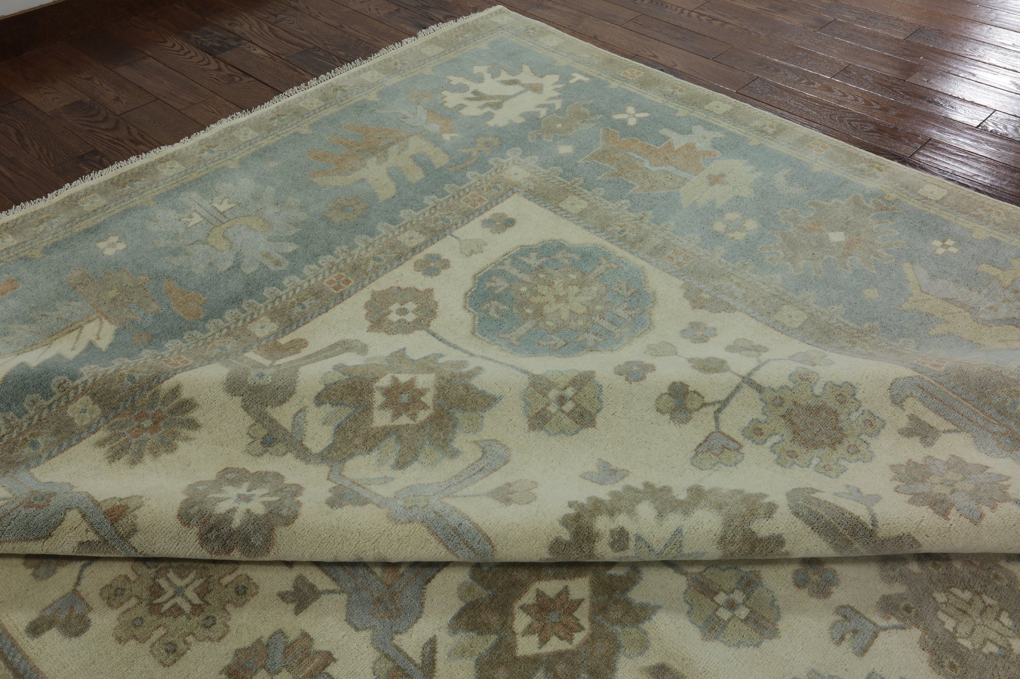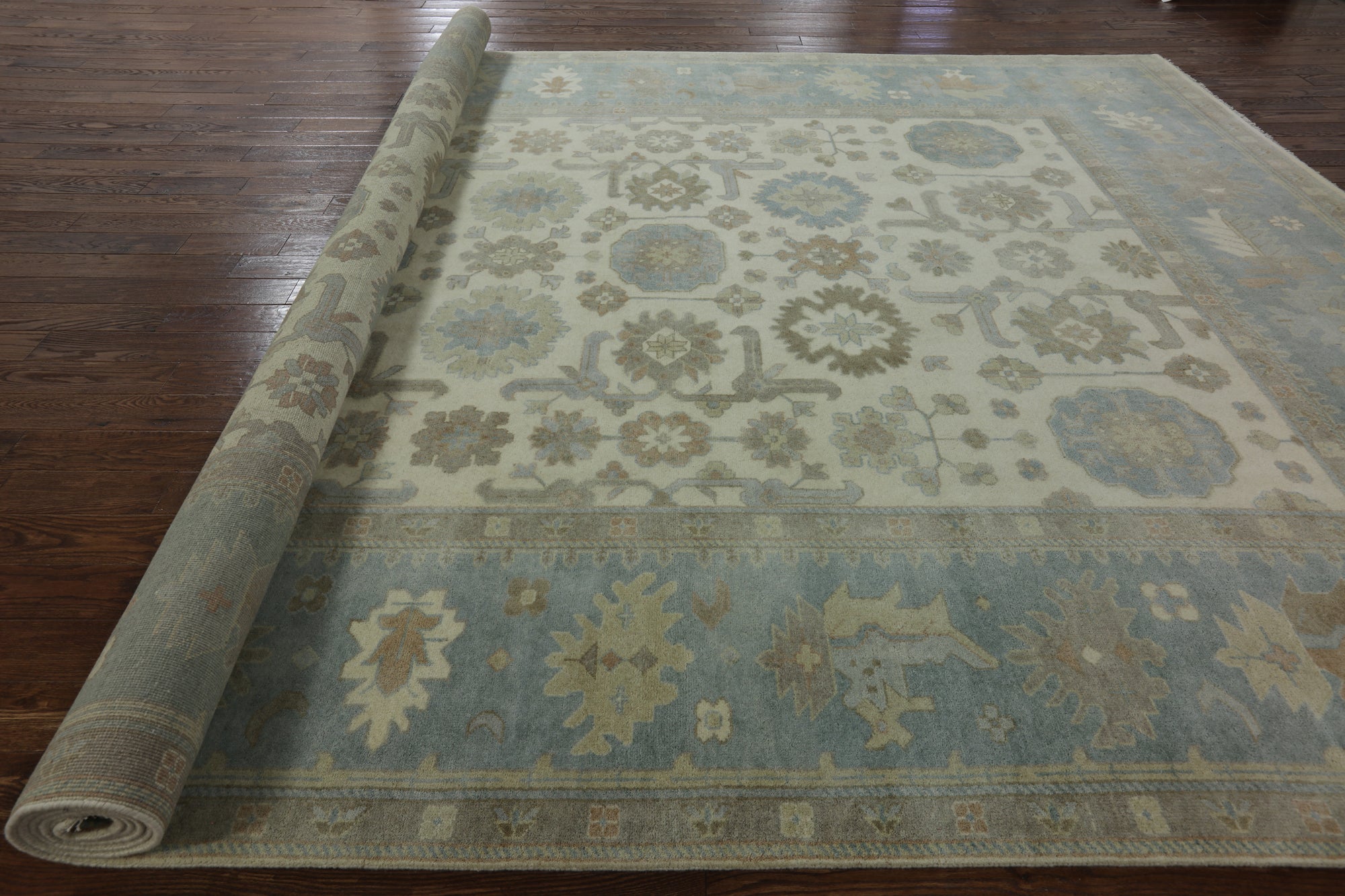 Oushak Rugs are distinctive in both pattern and color palette. Most have a blue, green, dark ivory, or gold & their designs are typically based on geometric motifs and vine / leave motifs. All colors are created with natural vegetable dyes, and the hushed tones are enhanced by the soft, lustrous wool texture. The foundation of an Oushak is cotton while the pile is wool. Oushak rugs are also double-knotted for durability.
