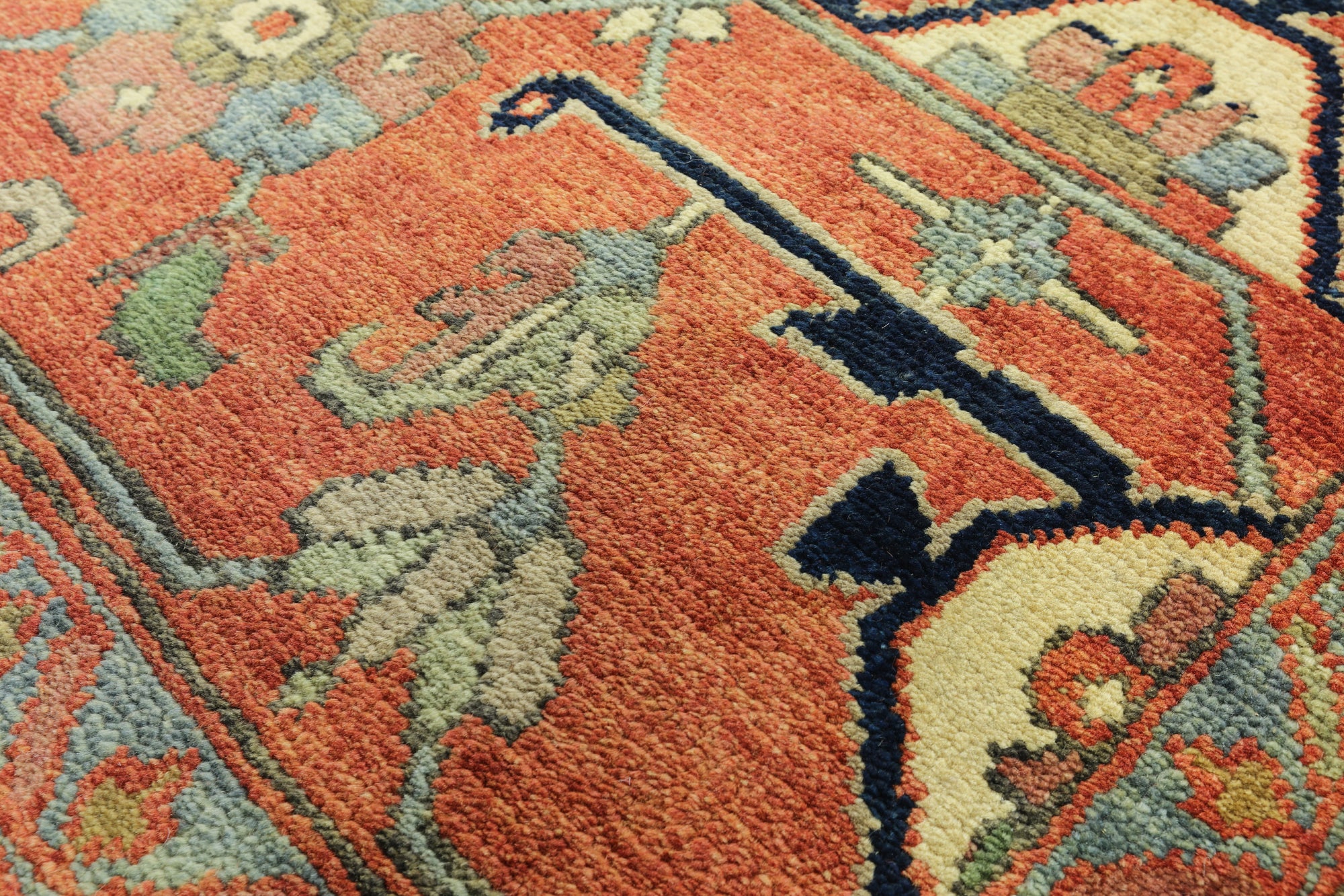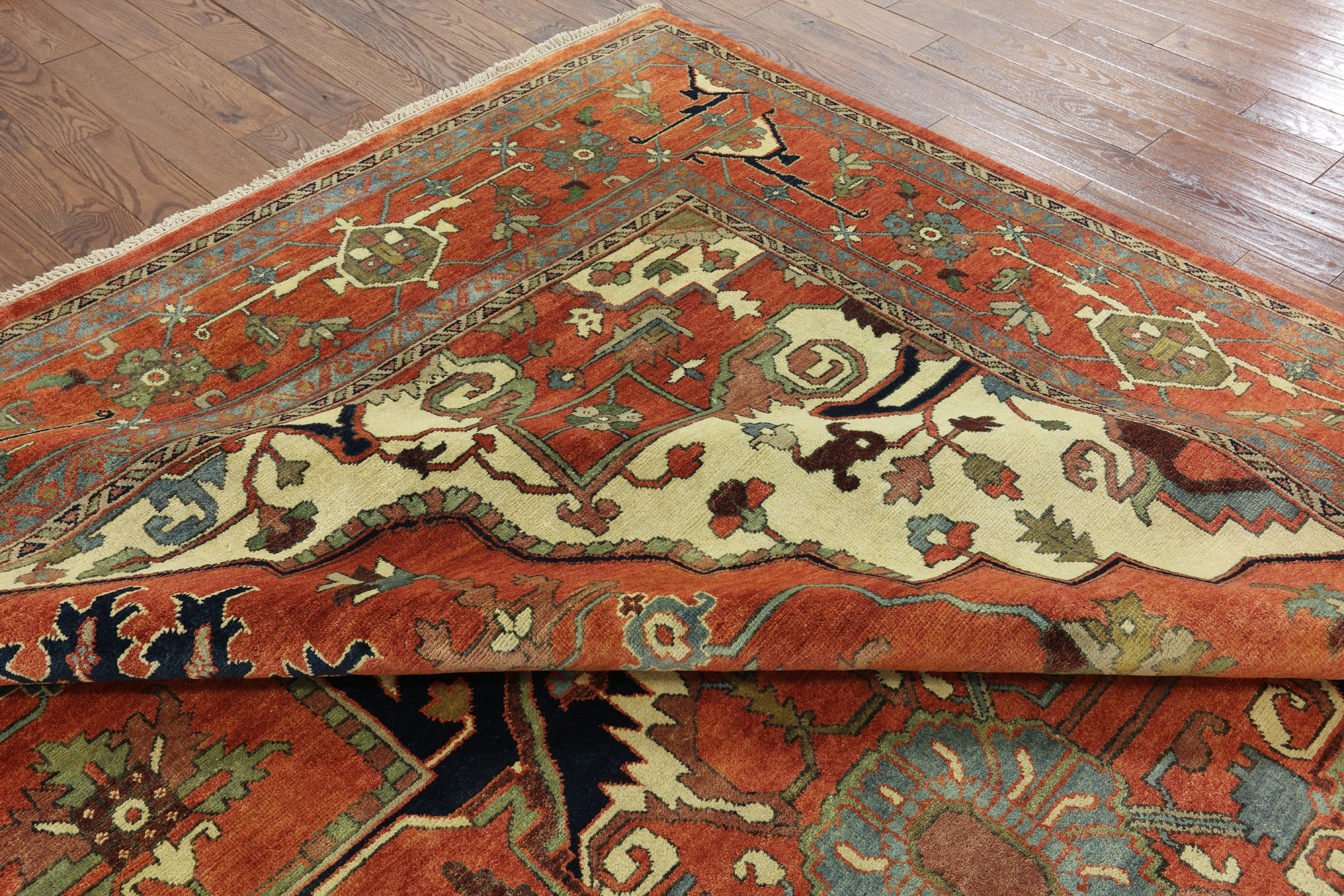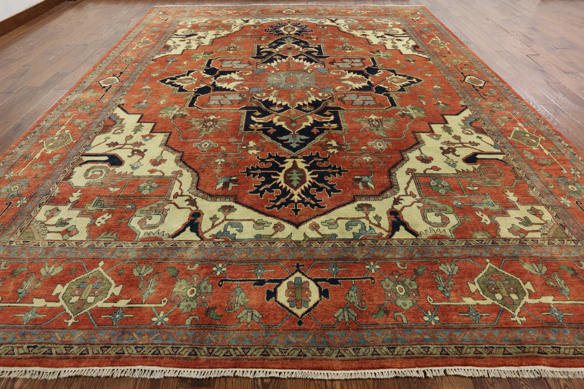 Heriz/Serapi Rugs are hand-knotted with a thick, heavy pile and a rich color palette. Most designs are large geometric medallions or an all over highly stylized floral motif design. Serapi‰Ϋͺs are made with pure natural vegetable dyes, hand-spun wool, graphic designs and inspired artistry. Traditional Heriz colors are red, black, blues, & ivory.