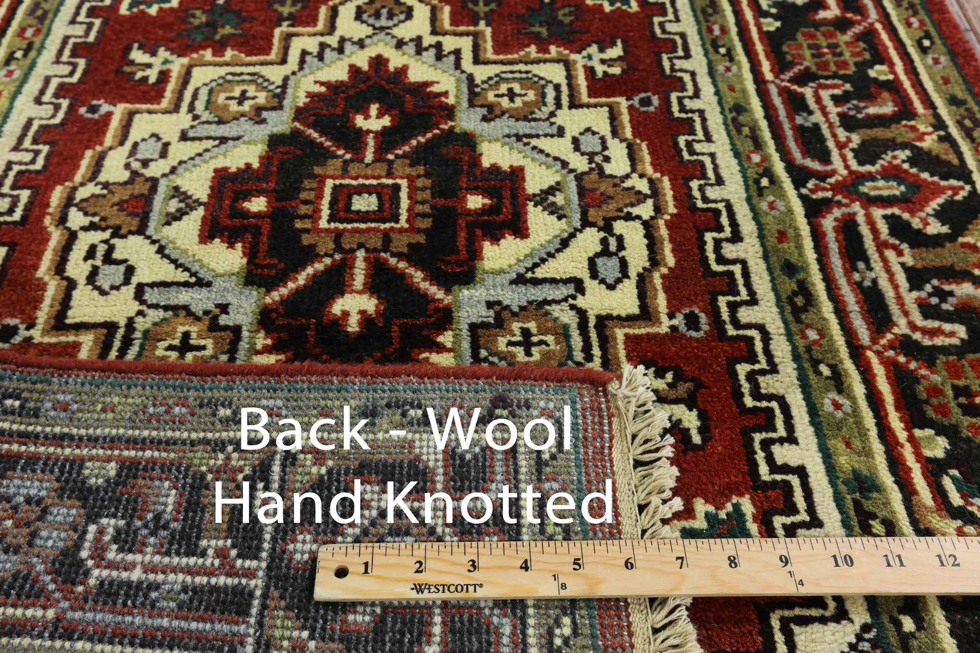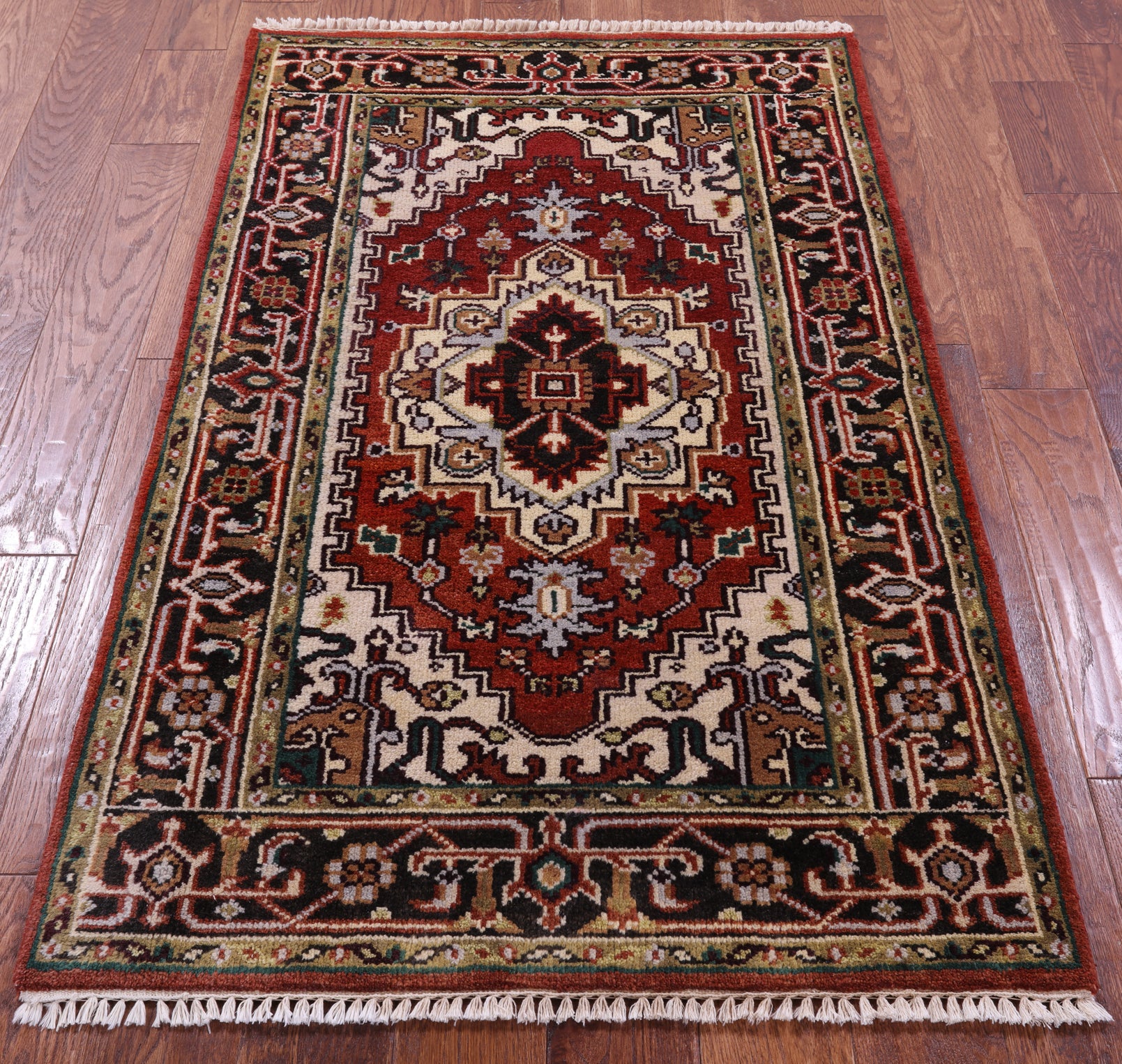 Heriz/Serapi Rugs are hand-knotted with a thick, heavy pile and a rich color palette. Most designs are large geometric medallions or an all over highly stylized floral motif design. Serapiโ€™s are made with pure natural vegetable dyes, hand-spun wool, graphic designs and inspired artistry. Traditional Heriz colors are red, black, blues, & ivory.