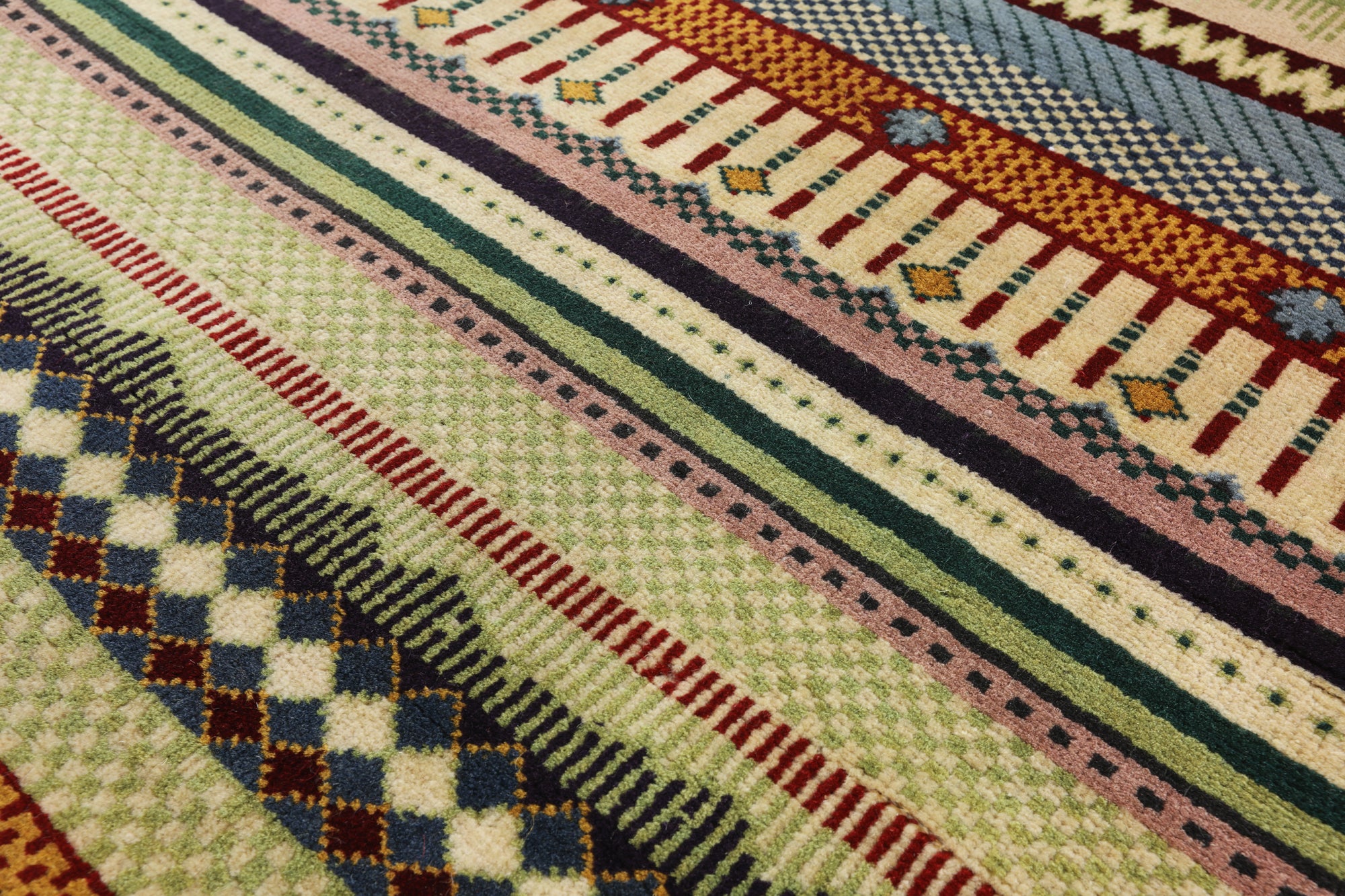 Gabbeh Rugs feature hand-spun wool in both the pile and foundation. These rugs are characterized by their abstract designs that relies upon open fields of color and a playfulness with geometric figures used to depict a story, person, or event. Gabbeh Rugs are popular in a contemporary or modern setting and are extremely durable, usually small to medium size.