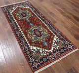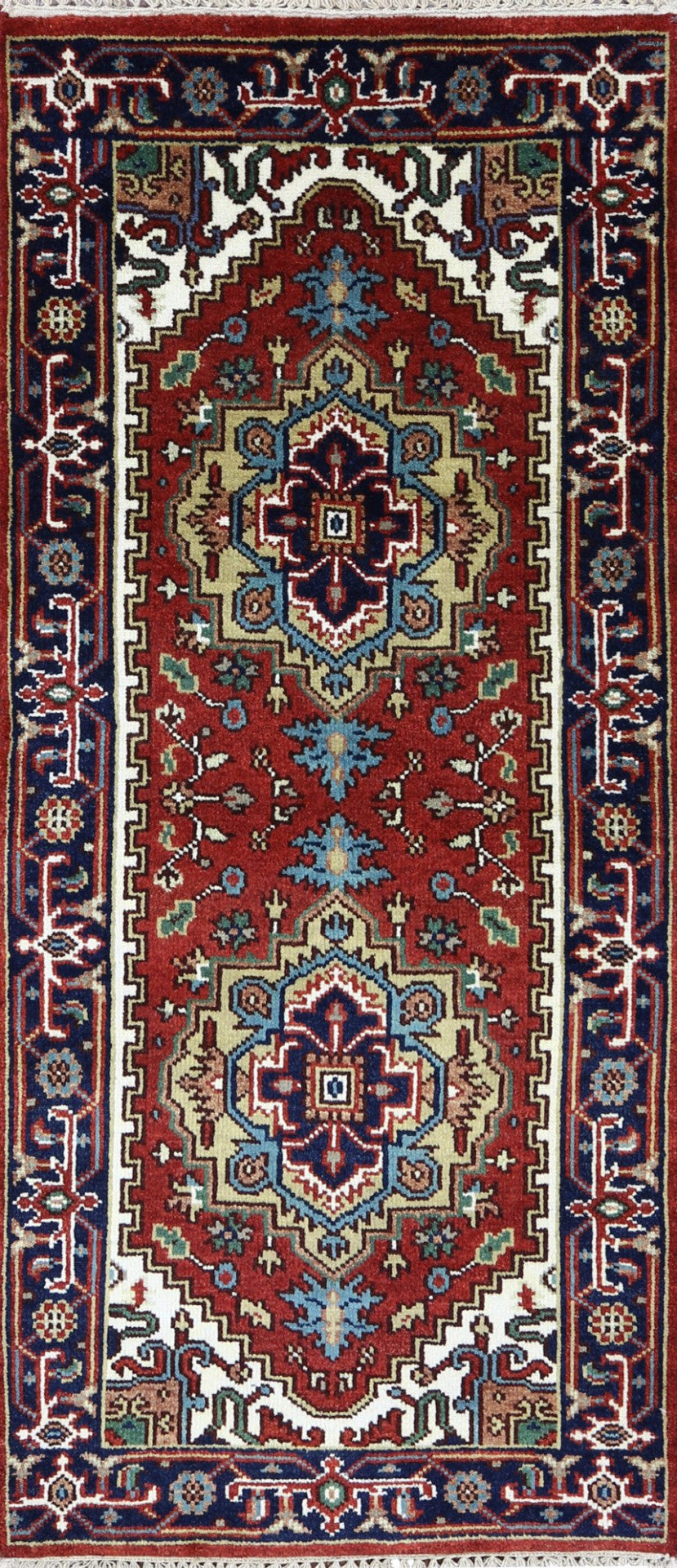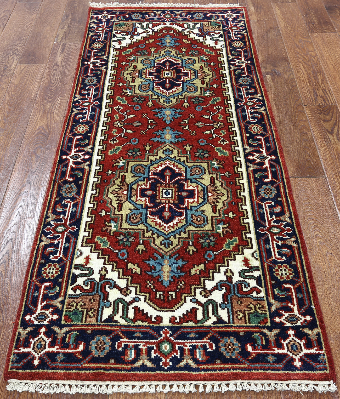Heriz/Serapi Rugs are hand-knotted with a thick, heavy pile and a rich color palette. Most designs are large geometric medallions or an all over highly stylized floral motif design. Serapi’s are made with pure natural vegetable dyes, hand-spun wool, graphic designs and inspired artistry. Traditional Heriz colors are red, black, blues, & ivory.