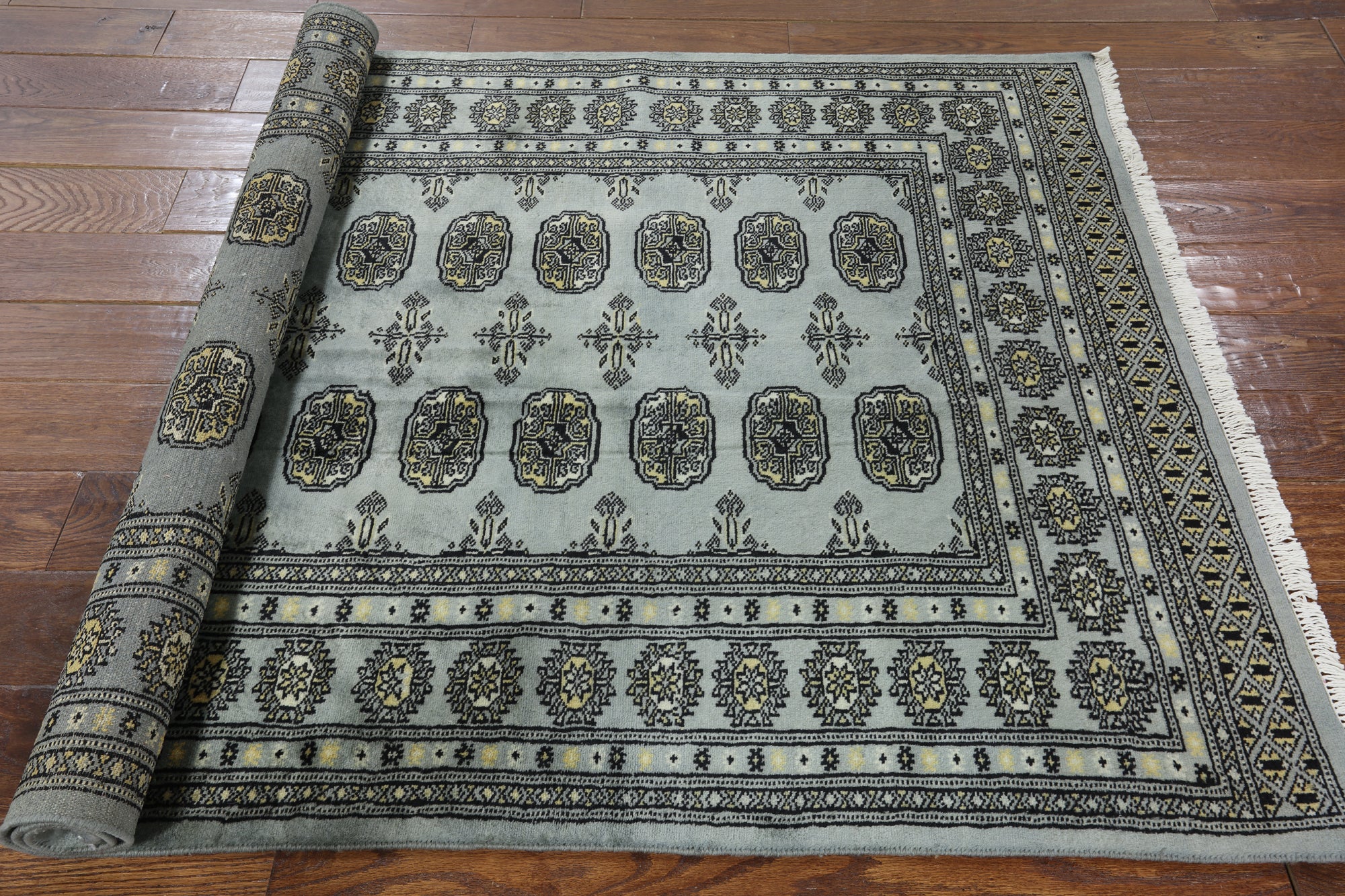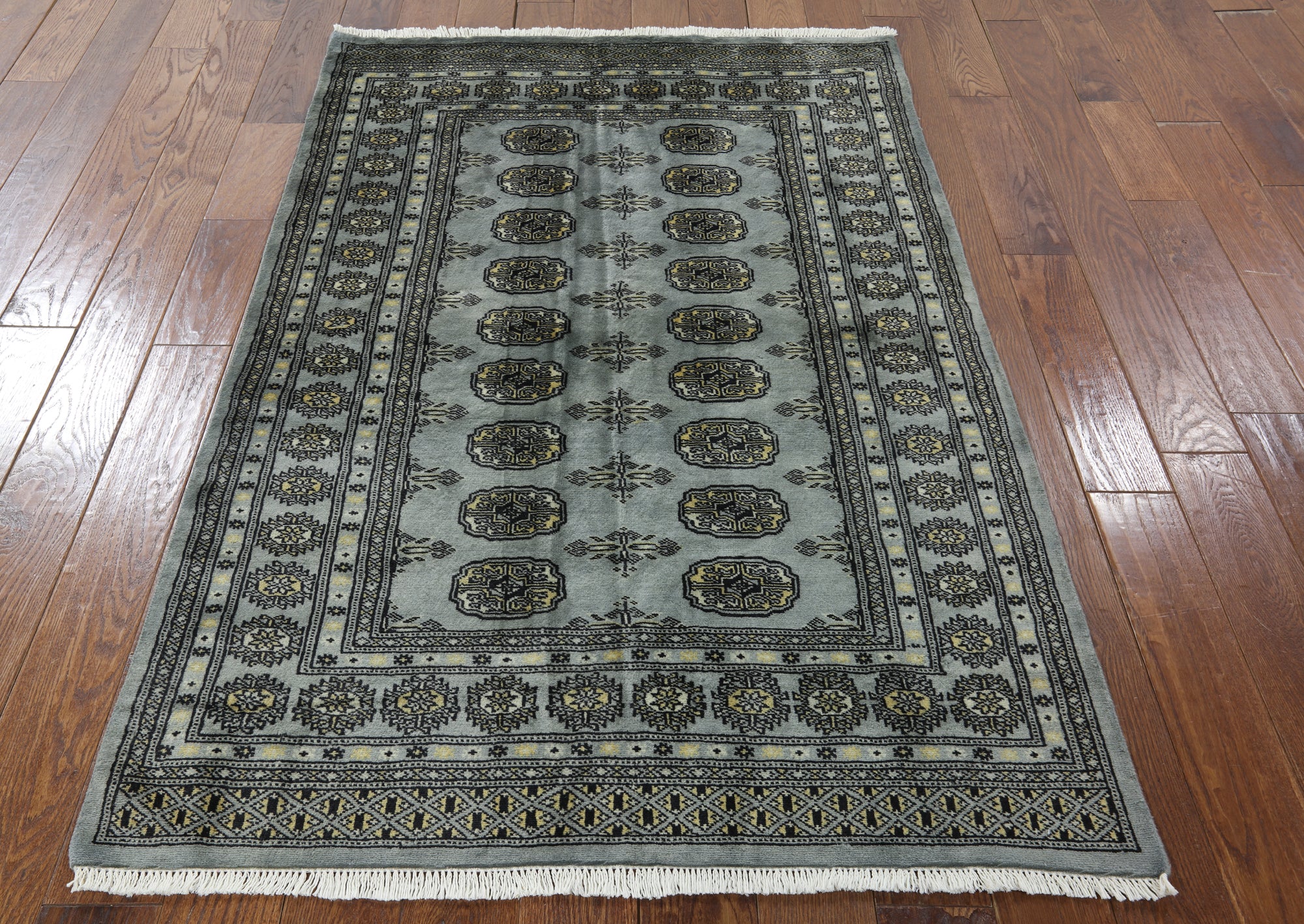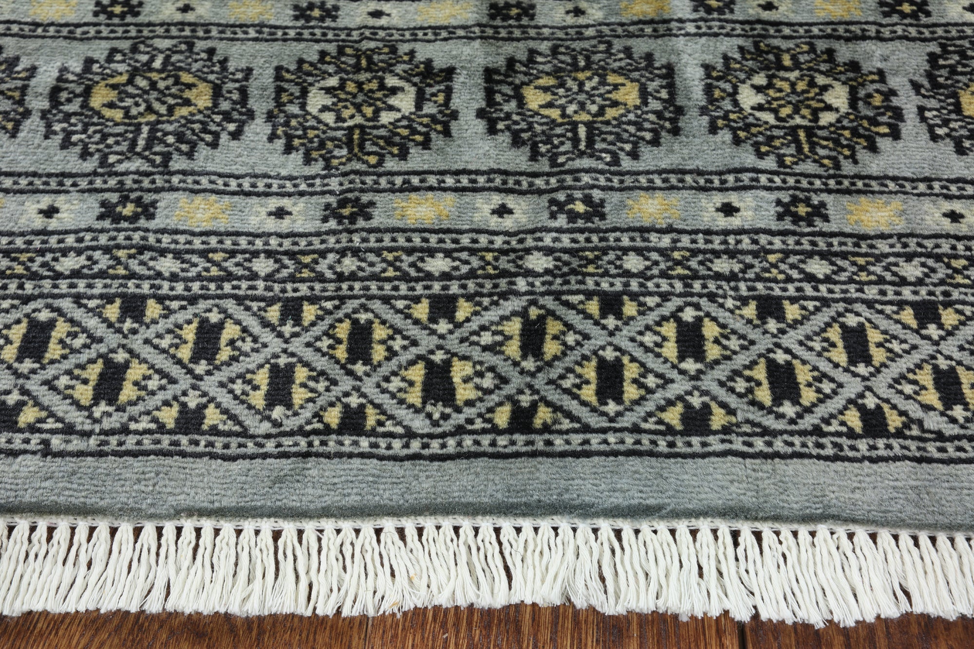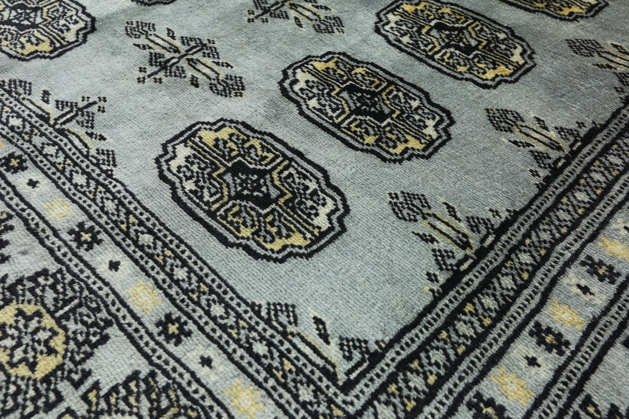 Bokhara Rugs are classic Turkoman designs originally created by nomadic tribes in India. Bokhara Rugs are among the most popular handmade rugs widely produced in Pakistan, India & Afghanistan. There foundation and heavy pile consist of wool, and have a soft luxurious feel. There unique designs consist of repeating geometric designs and vary from one tribe to another. Designs are commonly dark blue/navy, black, brown, or red with ivory accents