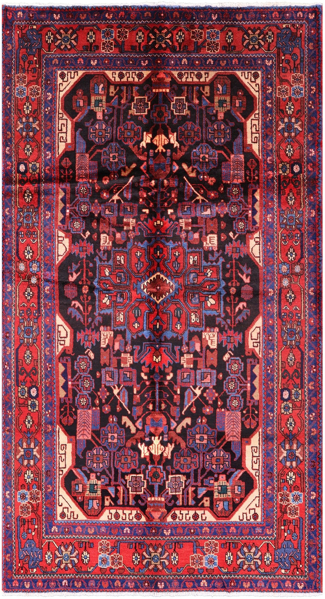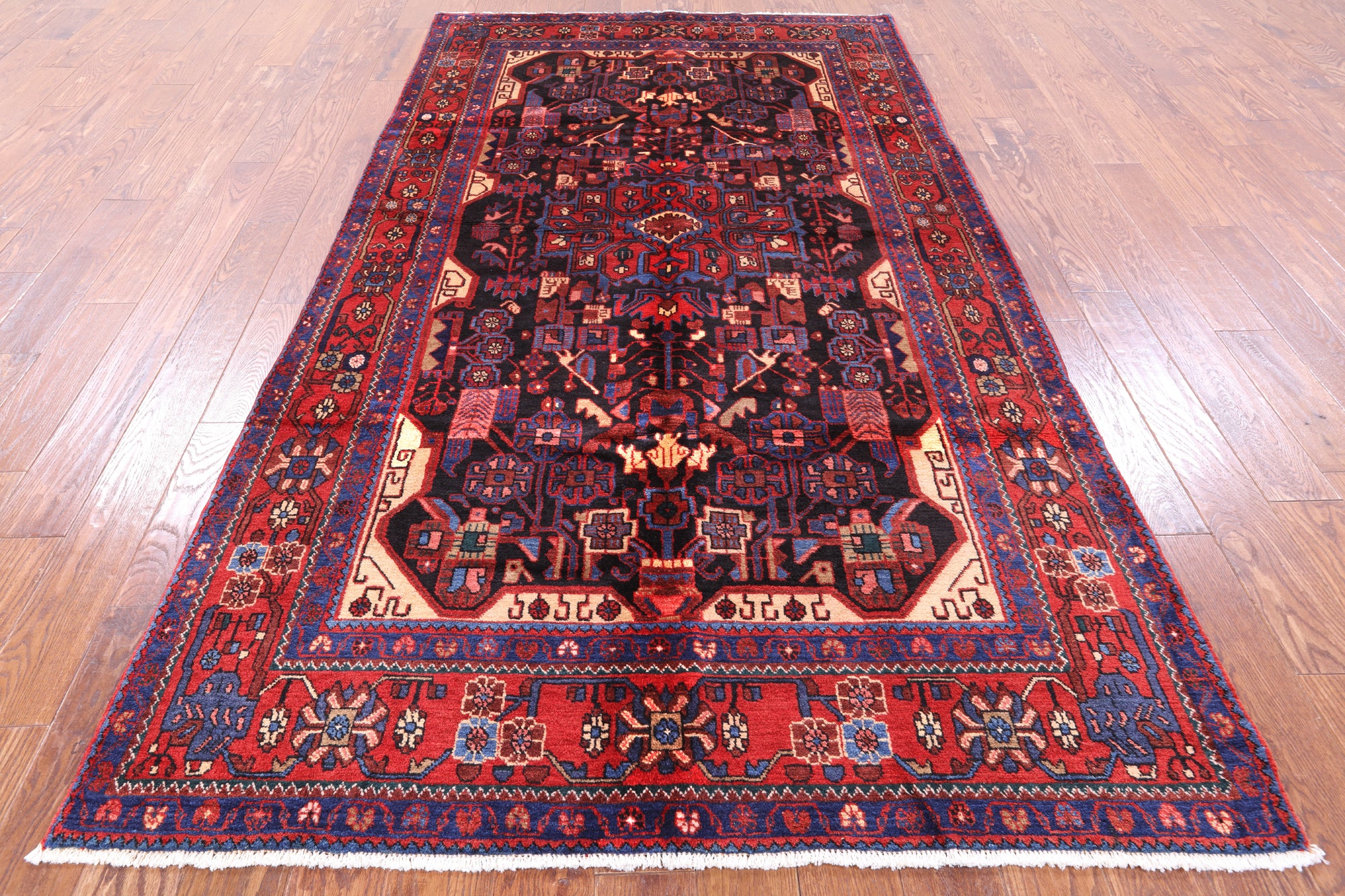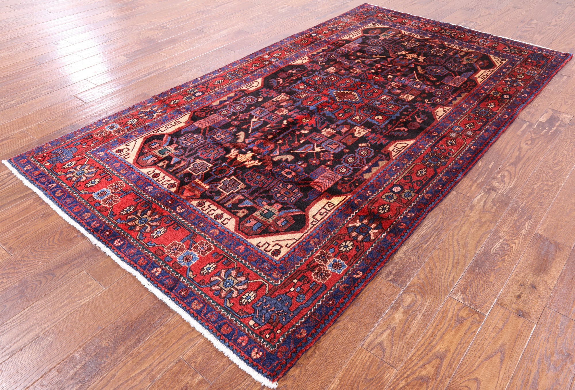 The quality of Nahavand rugs is very high this is thanks to the wool that is used to create these beautiful durable rugs. Most of the design elements in the Nahavand rugs are geometrical motifs. They often have β€œleaf’ like medallions in the center with flowers and twigs all around the background. The dominating colors for these rugs are often pale rust reds, beige, and many more.