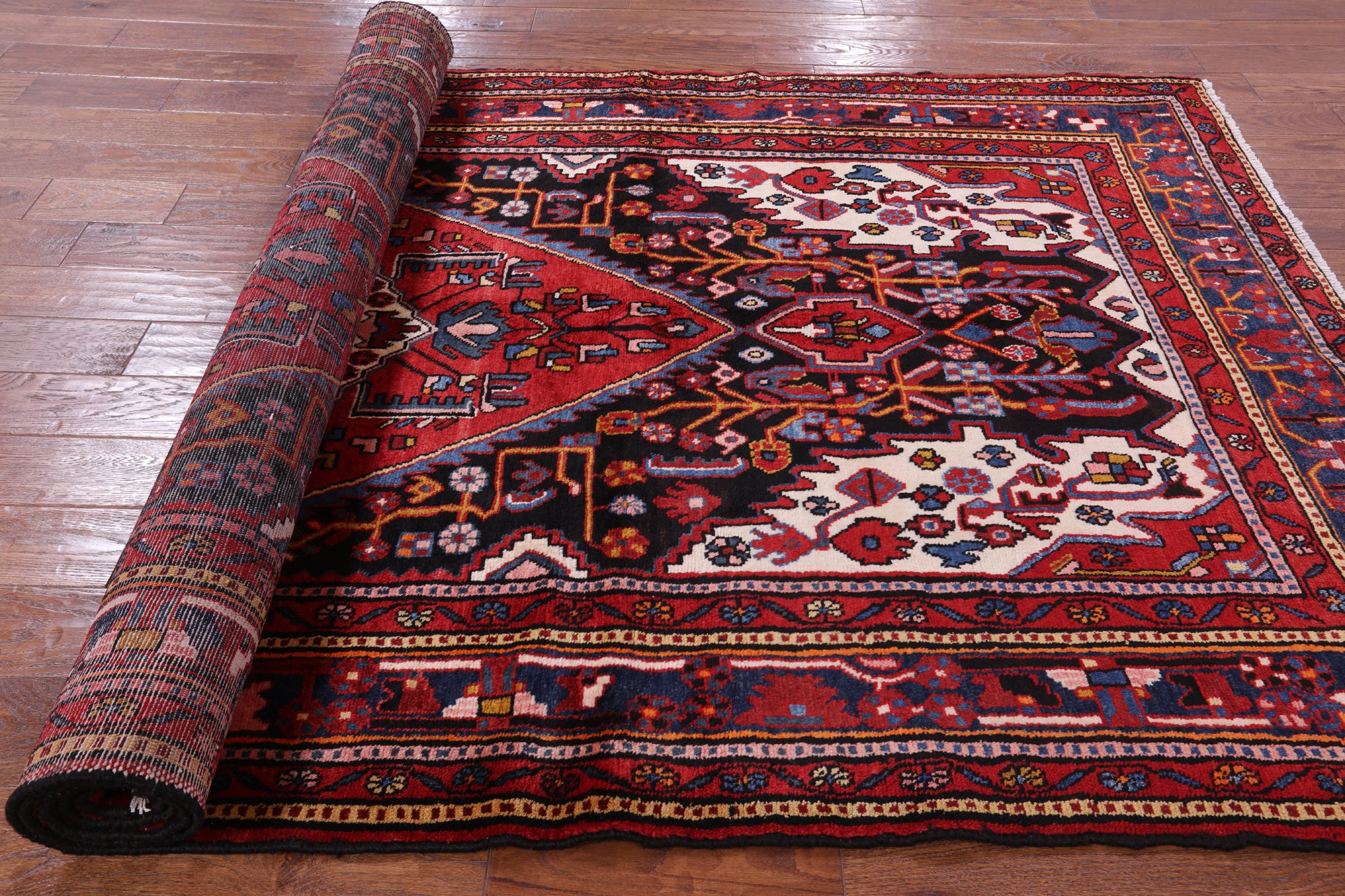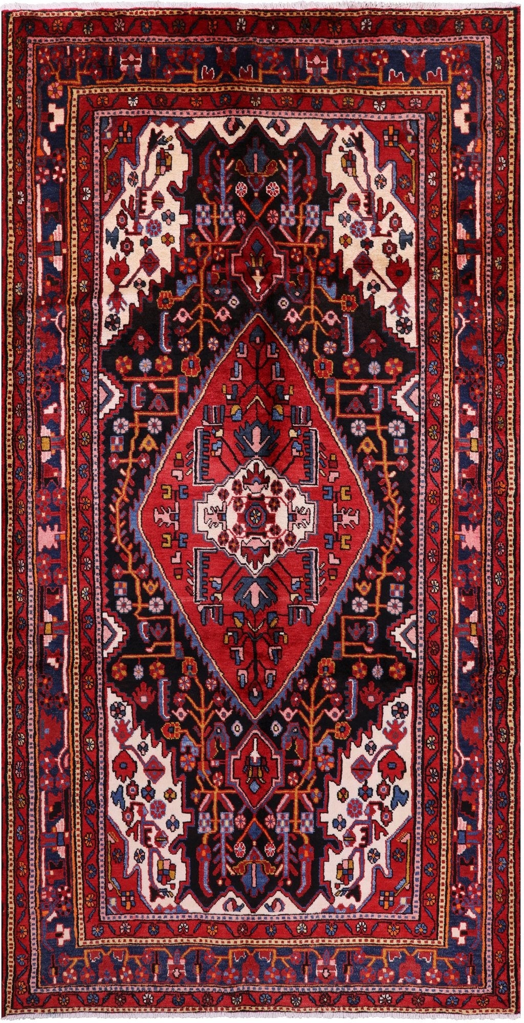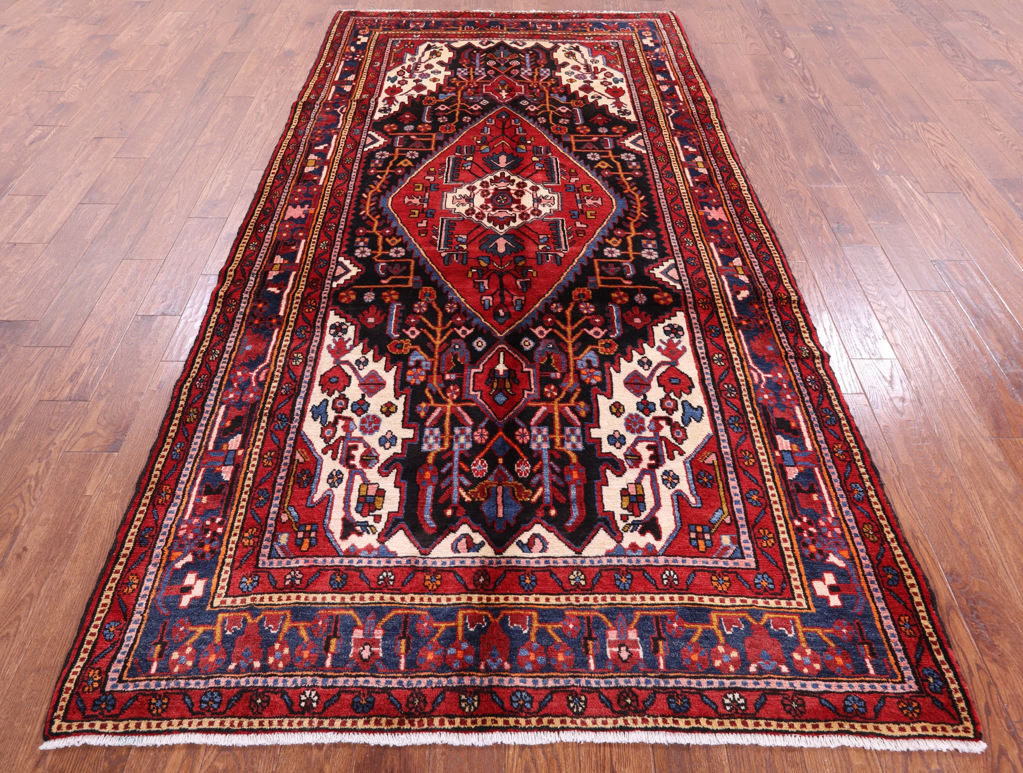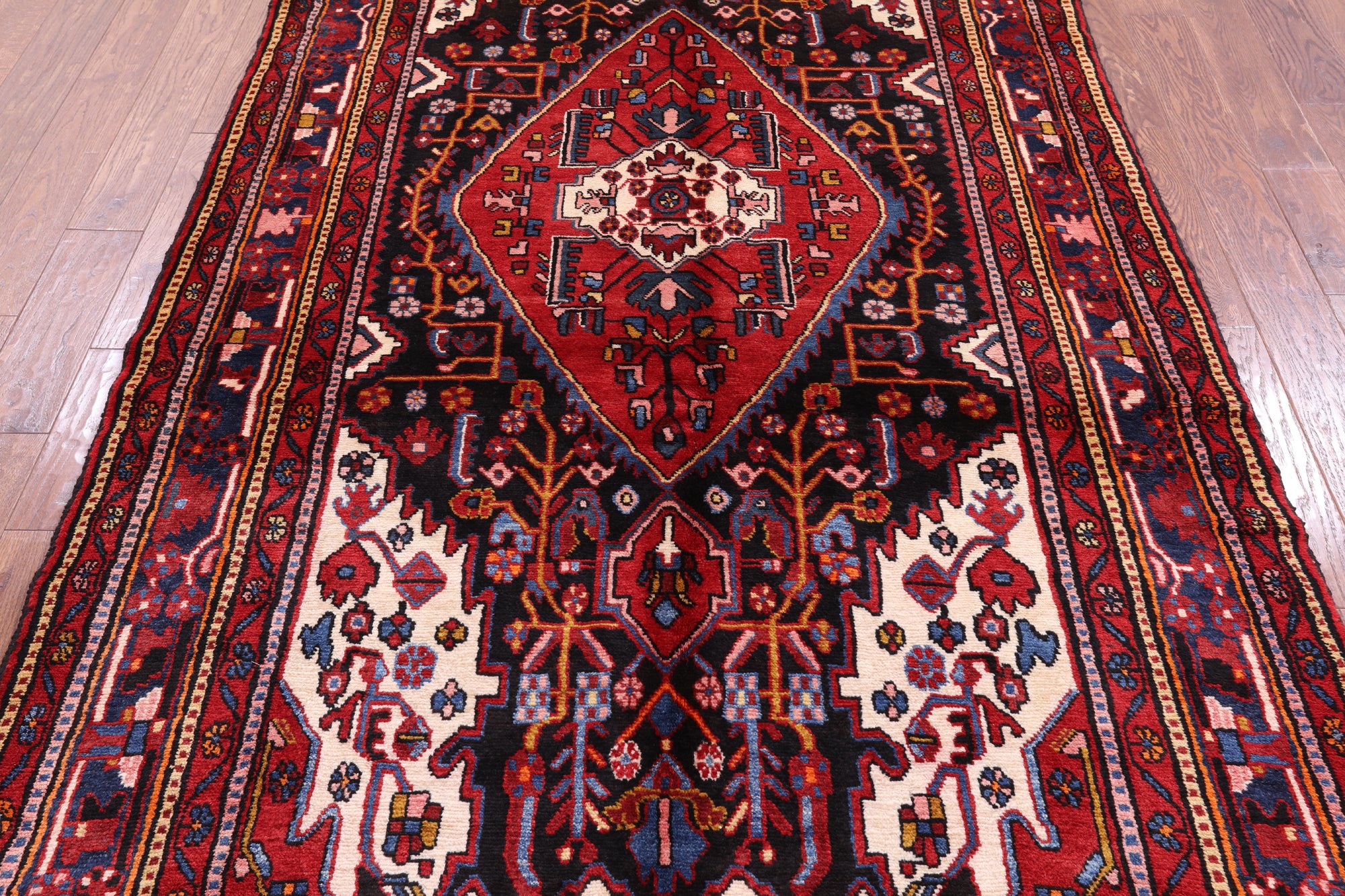 The quality of Nahavand rugs is very high this is thanks to the wool that is used to create these beautiful durable rugs. Most of the design elements in the Nahavand rugs are geometrical motifs. They often have β€œleaf’ like medallions in the center with flowers and twigs all around the background. The dominating colors for these rugs are often pale rust reds, beige, and many more.