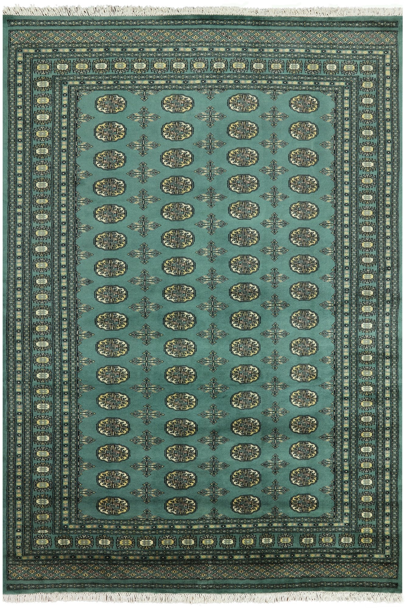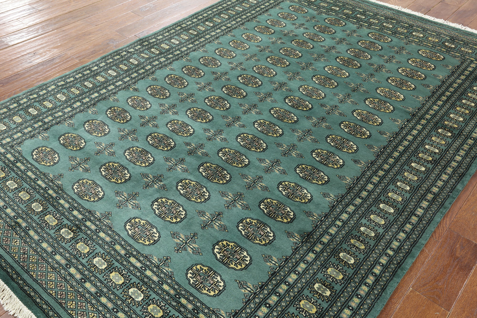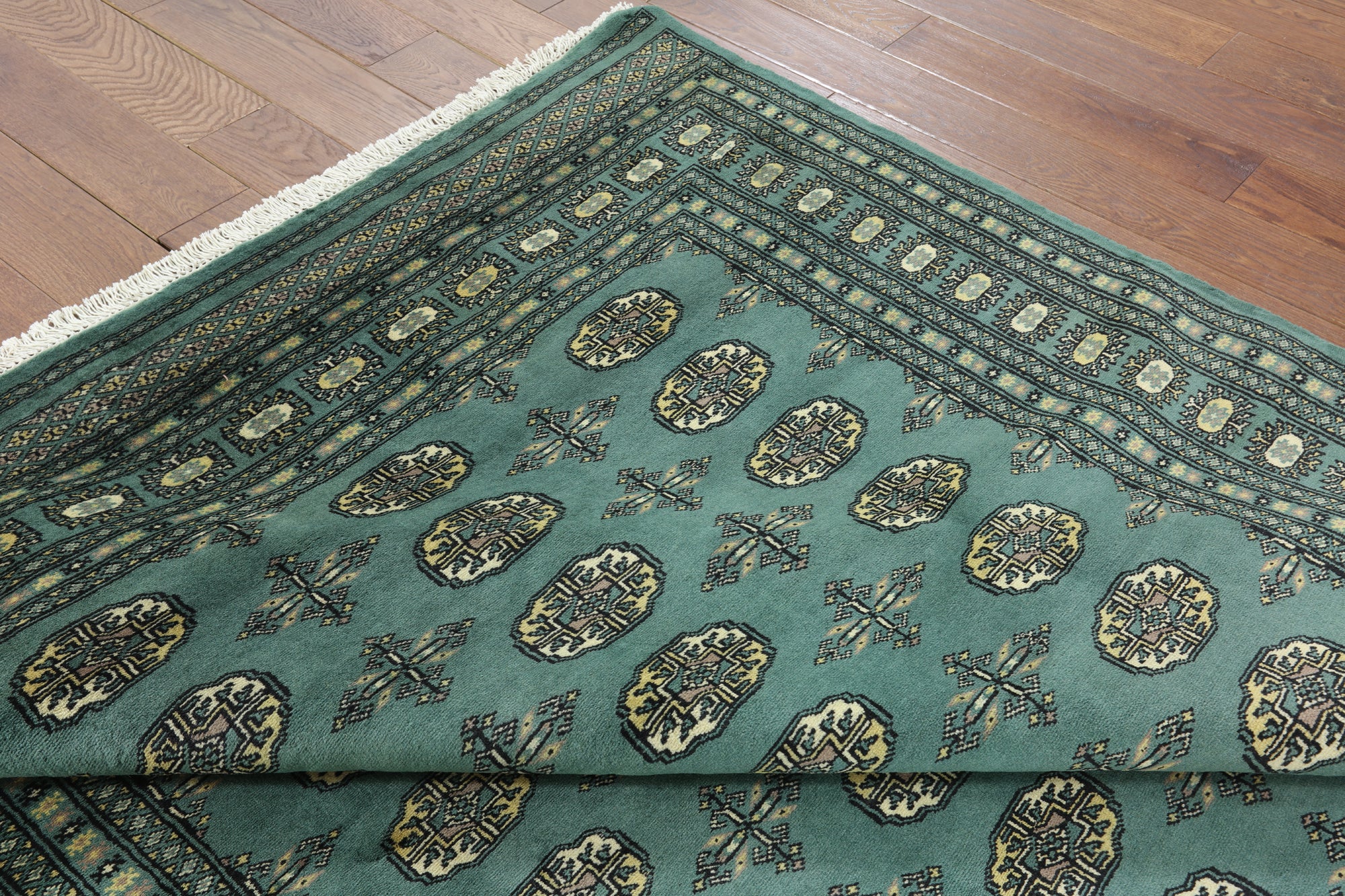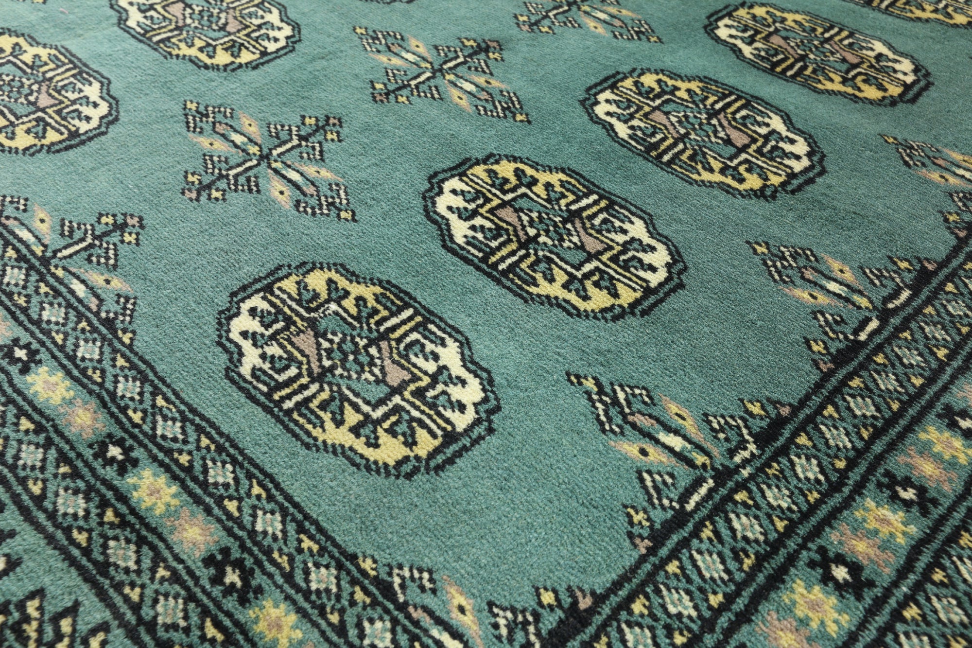 Bokhara Rugs are classic Turkoman designs originally created by nomadic tribes in India. Bokhara Rugs are among the most popular handmade rugs widely produced in Pakistan, India & Afghanistan. There foundation and heavy pile consist of wool, and have a soft luxurious feel. There unique designs consist of repeating geometric designs and vary from one tribe to another. Designs are commonly dark blue/navy, black, brown, or red with ivory accents