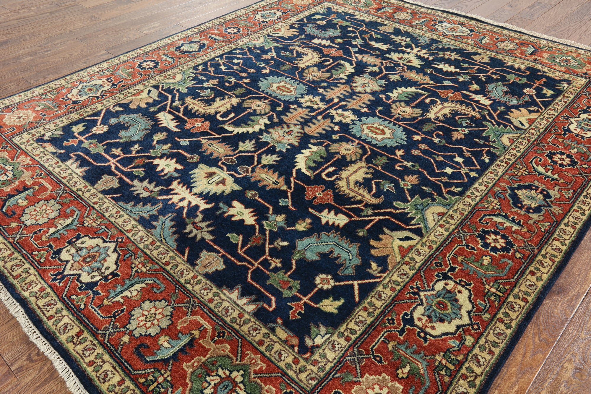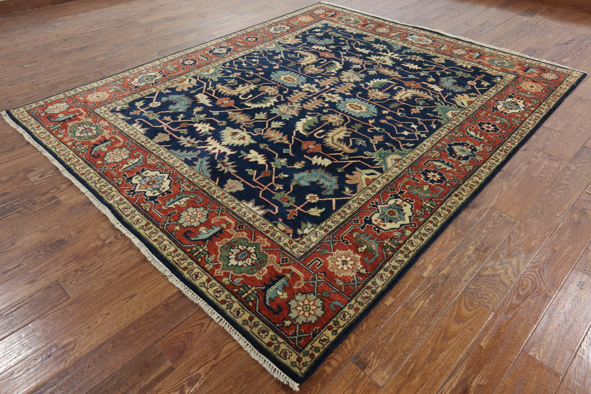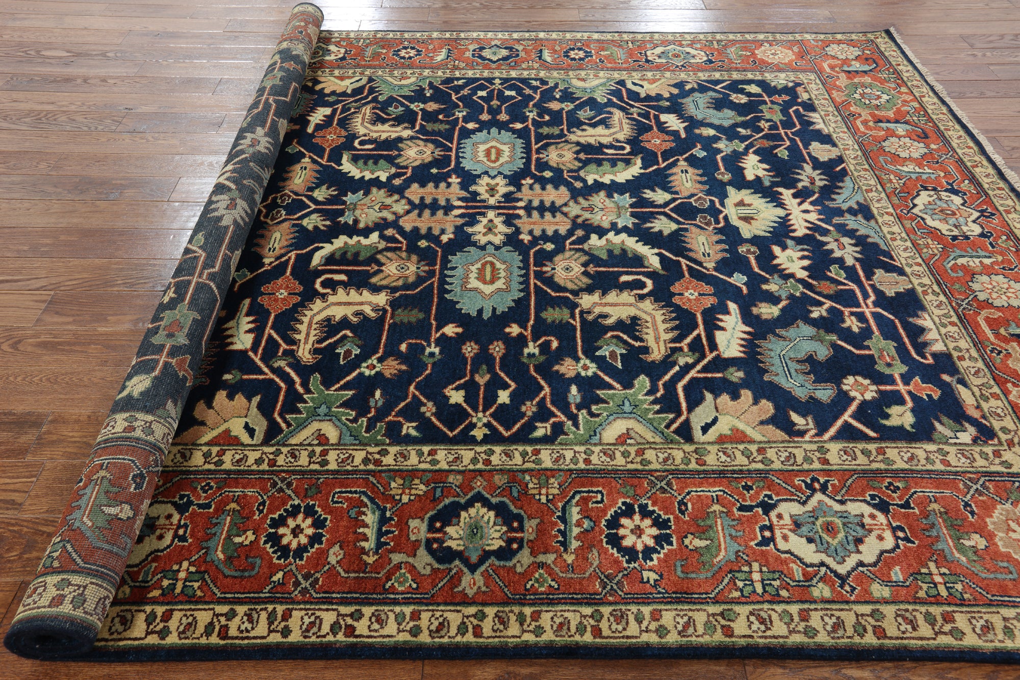 Classic Heriz/Serapi Rugs are known for their geometric figures that consist of geometric flowers, Shah Abbasi flowers, other floral elements & Islamic Arches.Β Its high quality texture is soft wool, the pile is thick, hand-knotted, and natural dyed. Colors used in Traditional Serapi Rugs include red, blue, ivory, black, & muted green.