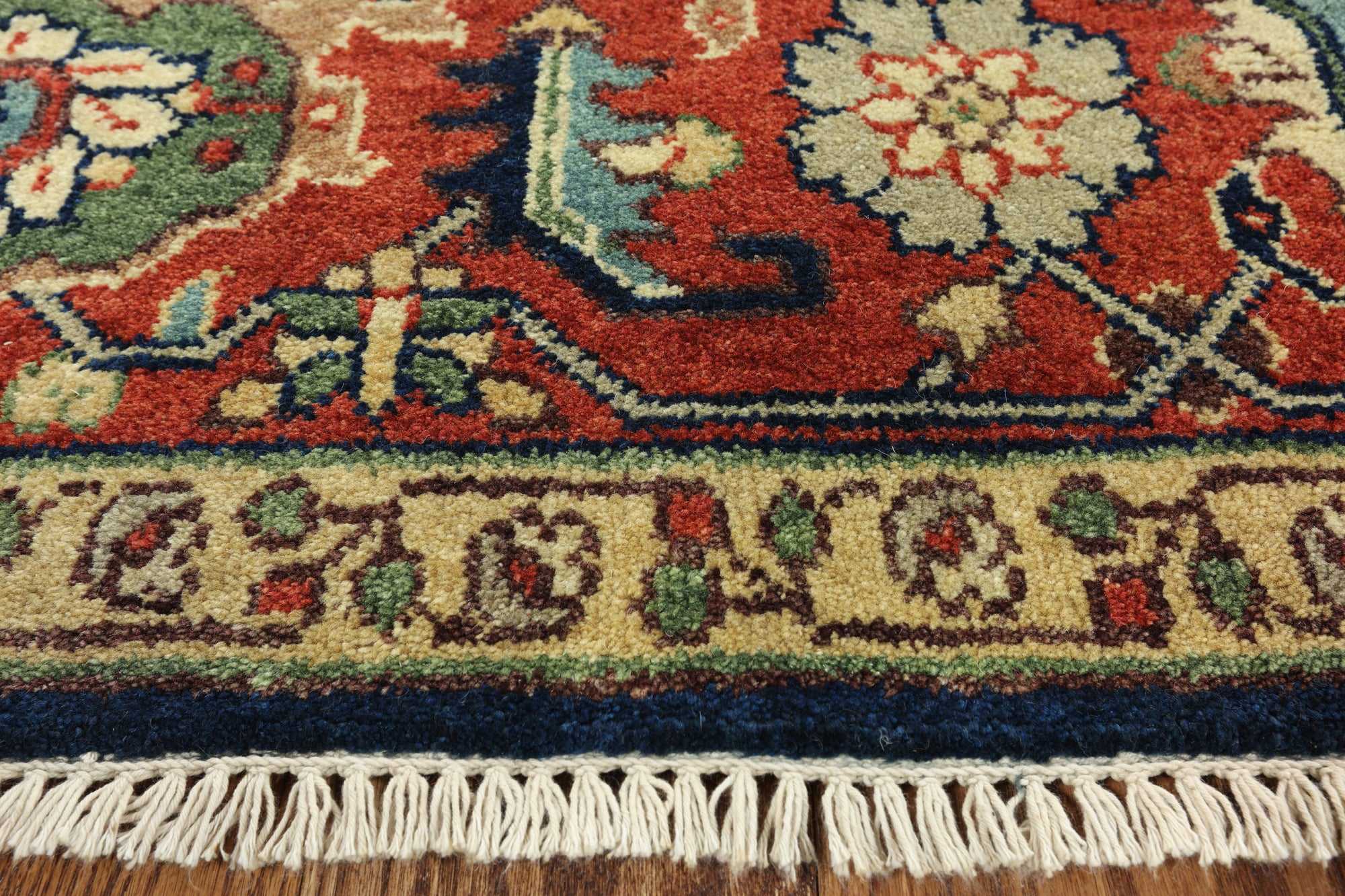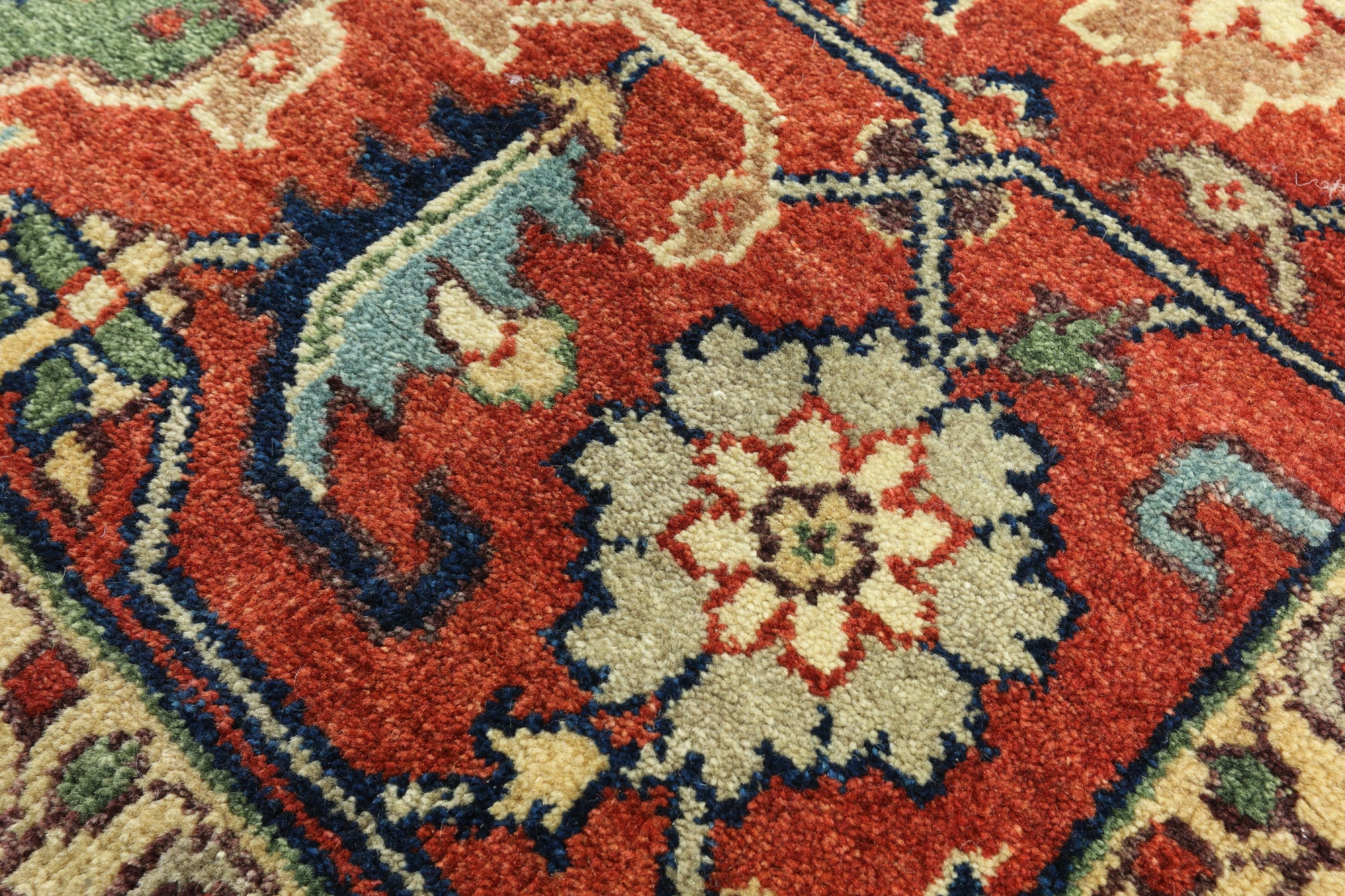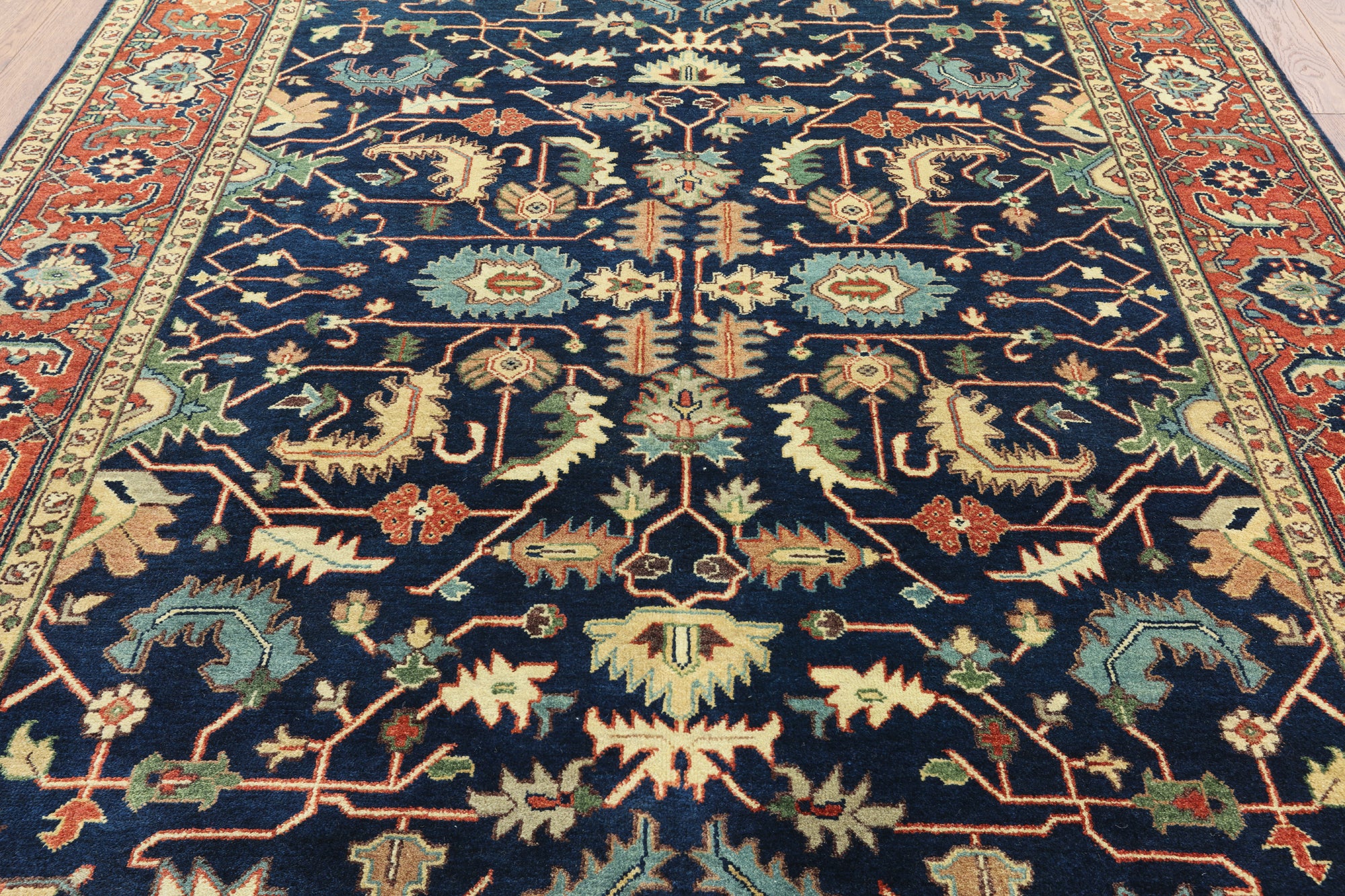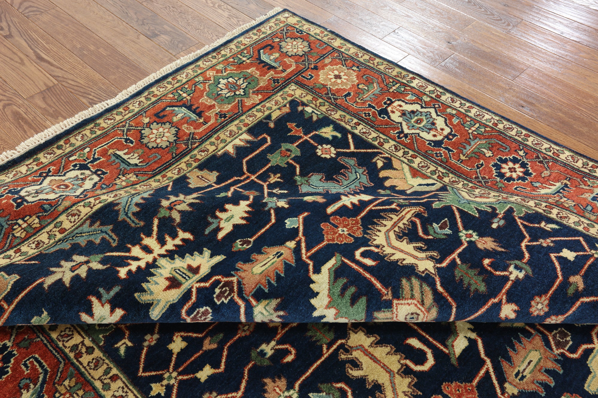 Classic Heriz/Serapi Rugs are known for their geometric figures that consist of geometric flowers, Shah Abbasi flowers, other floral elements & Islamic Arches.Β Its high quality texture is soft wool, the pile is thick, hand-knotted, and natural dyed. Colors used in Traditional Serapi Rugs include red, blue, ivory, black, & muted green.