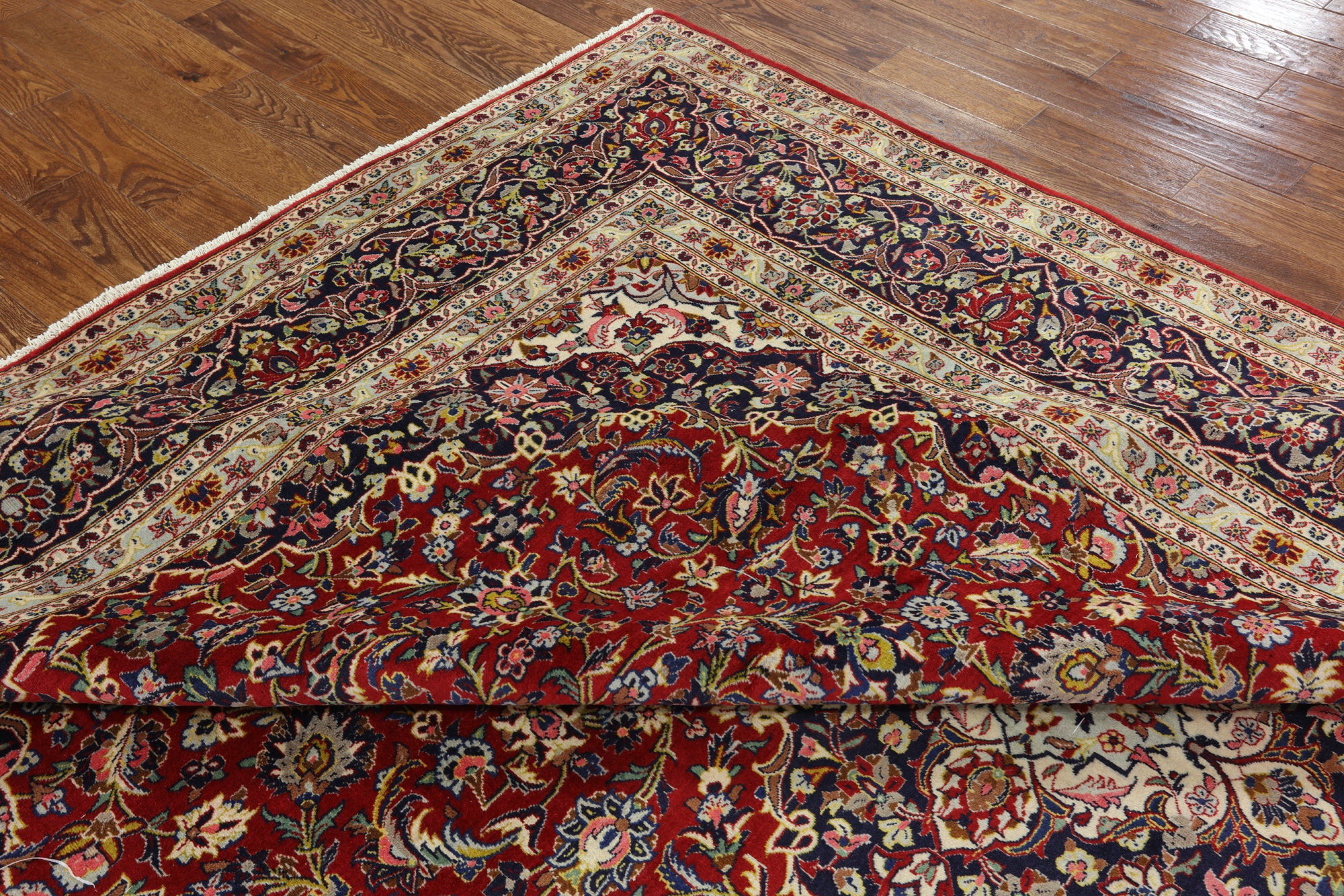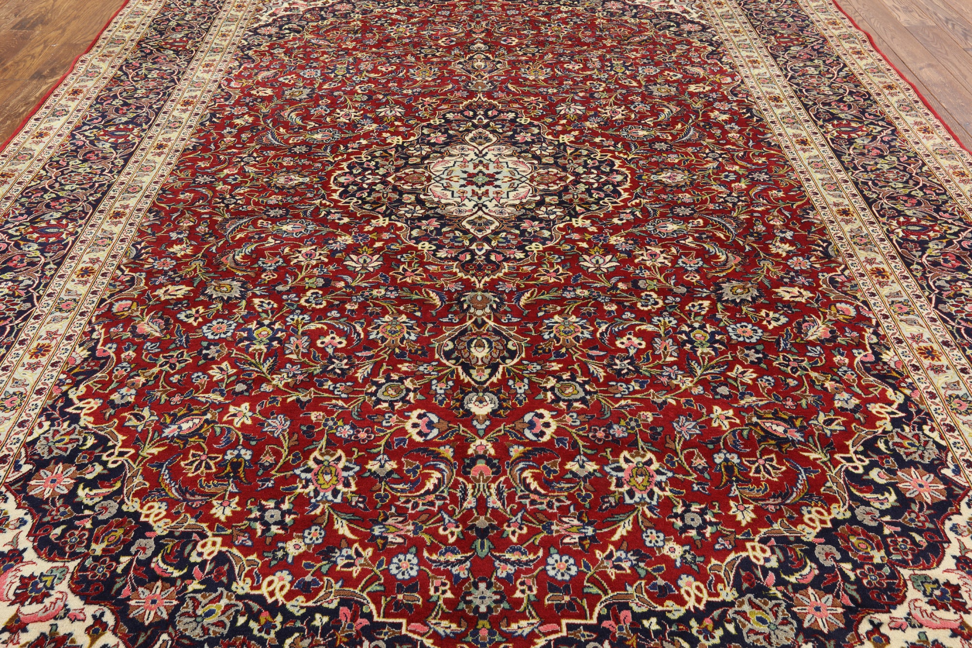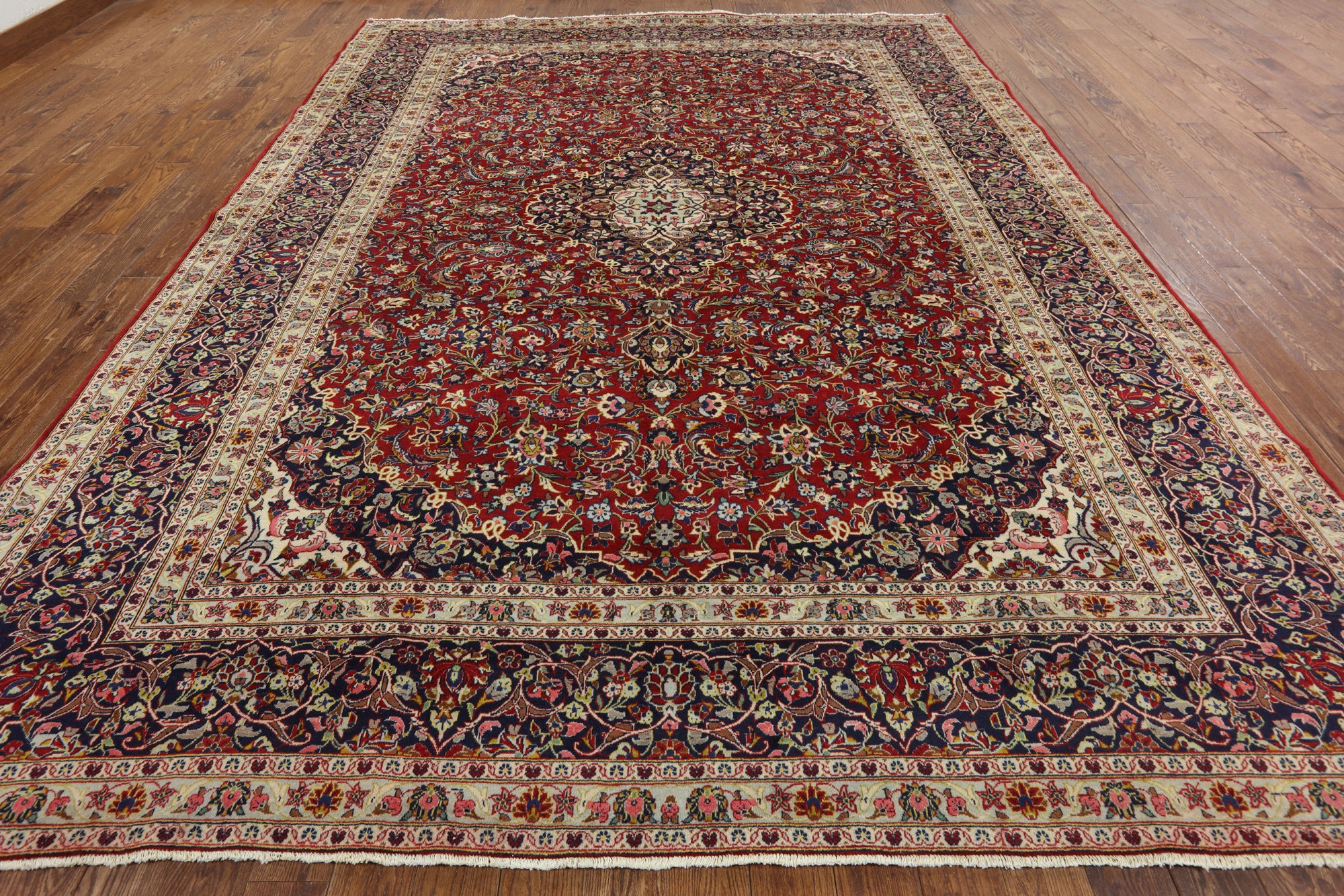Kashan rugs are amongst the most famous of all the Persian Rugs. They have high quality weaves and their knot count is extremely tight and high. Traditionally Kashan rugs have a central medallion on a red field with navy and ivory boarders. There designs do have silk incorporated into them which highlights the designs details. The wool on these rugs is soft and the pile is tightly knotted.