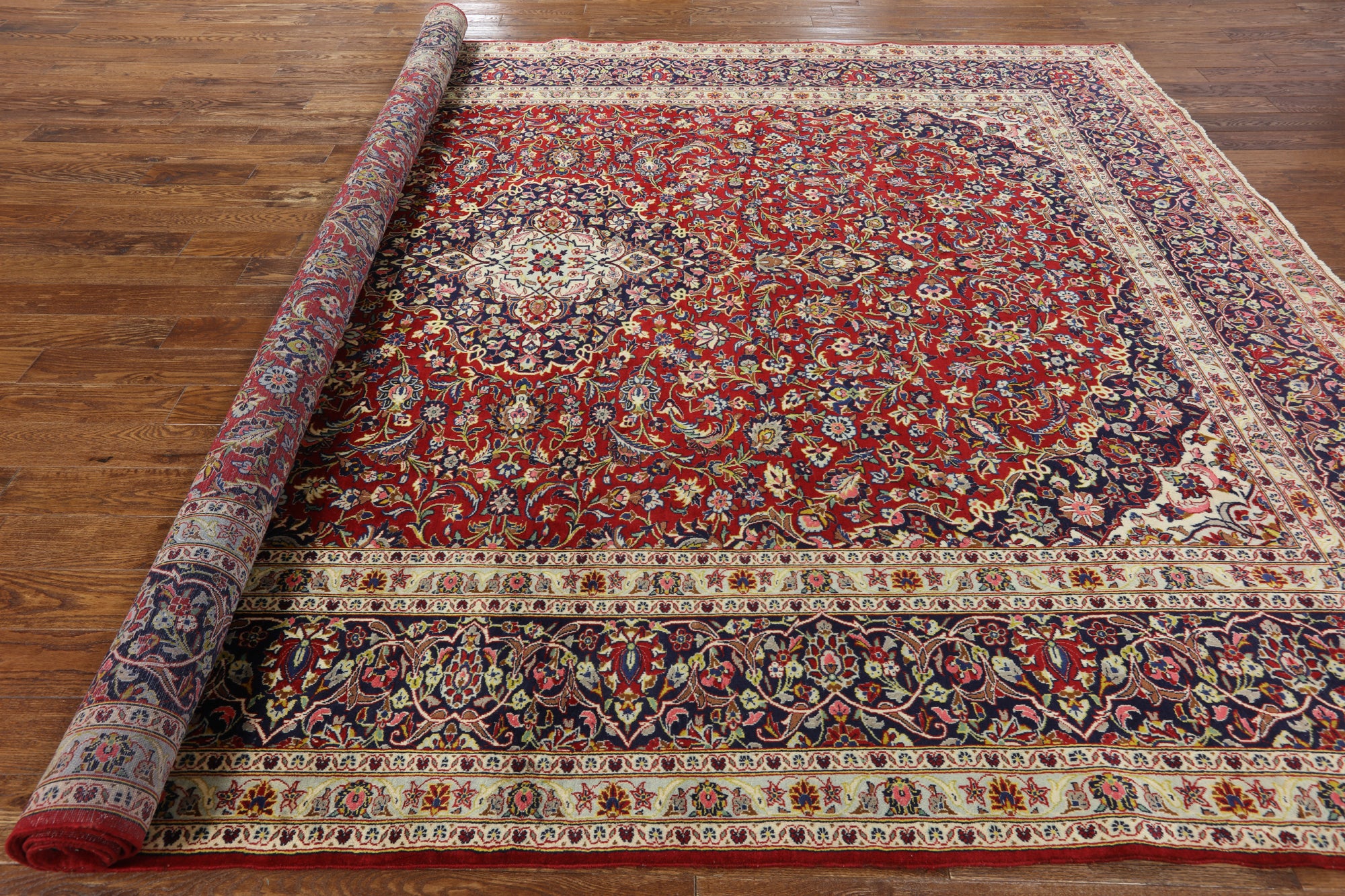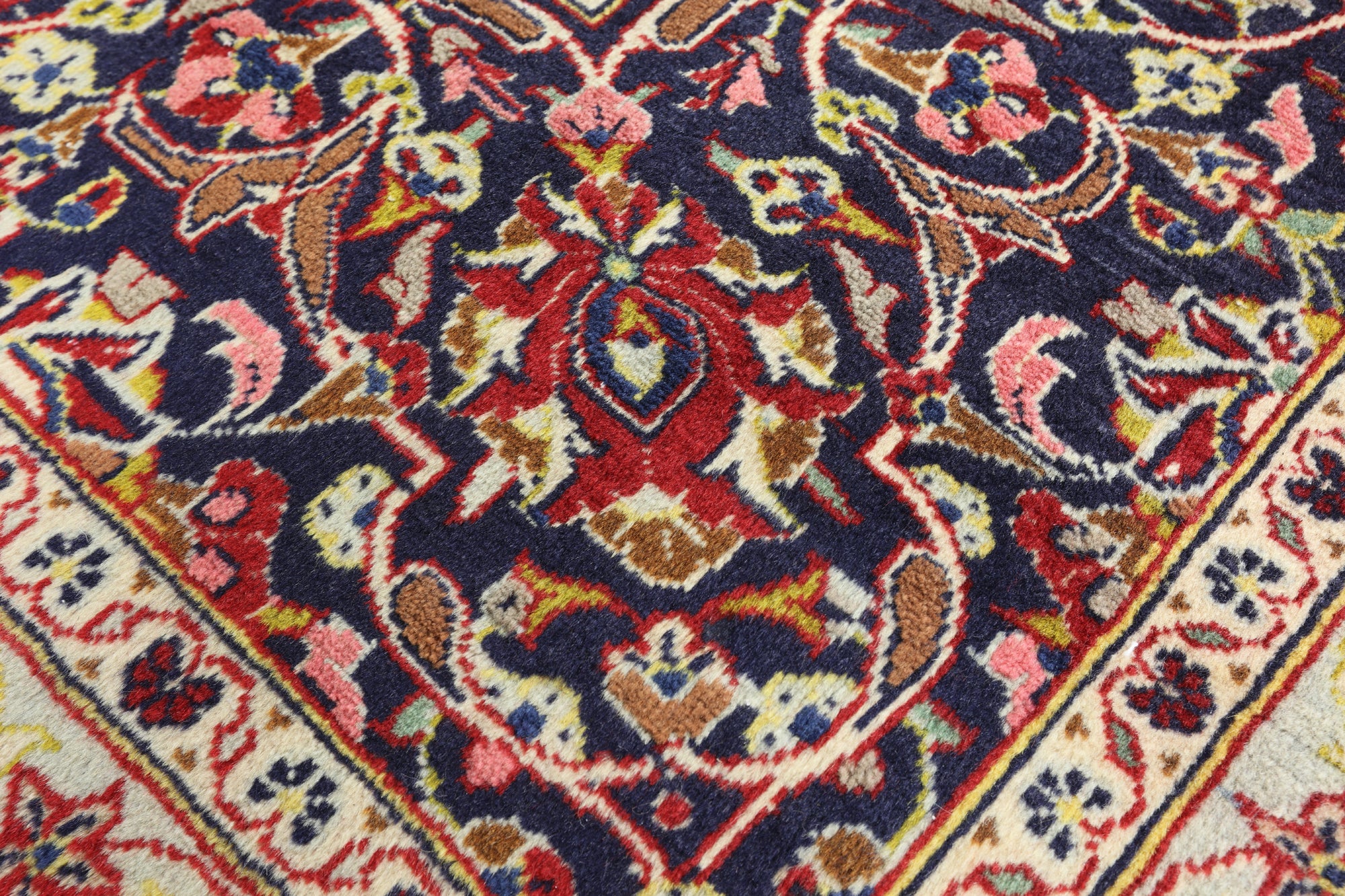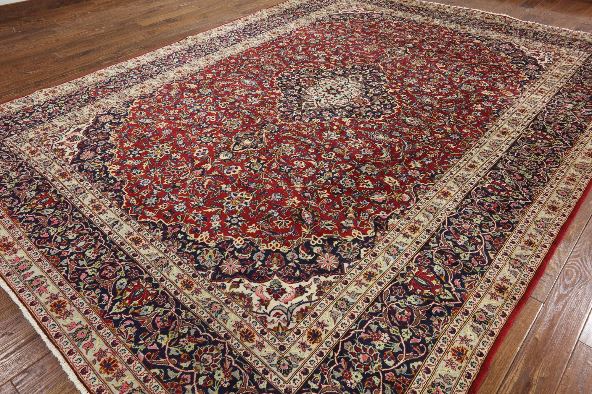 Kashan rugs are amongst the most famous of all the Persian Rugs. They have high quality weaves and their knot count is extremely tight and high. Traditionally Kashan rugs have a central medallion on a red field with navy and ivory boarders. There designs do have silk incorporated into them which highlights the designs details. The wool on these rugs is soft and the pile is tightly knotted.