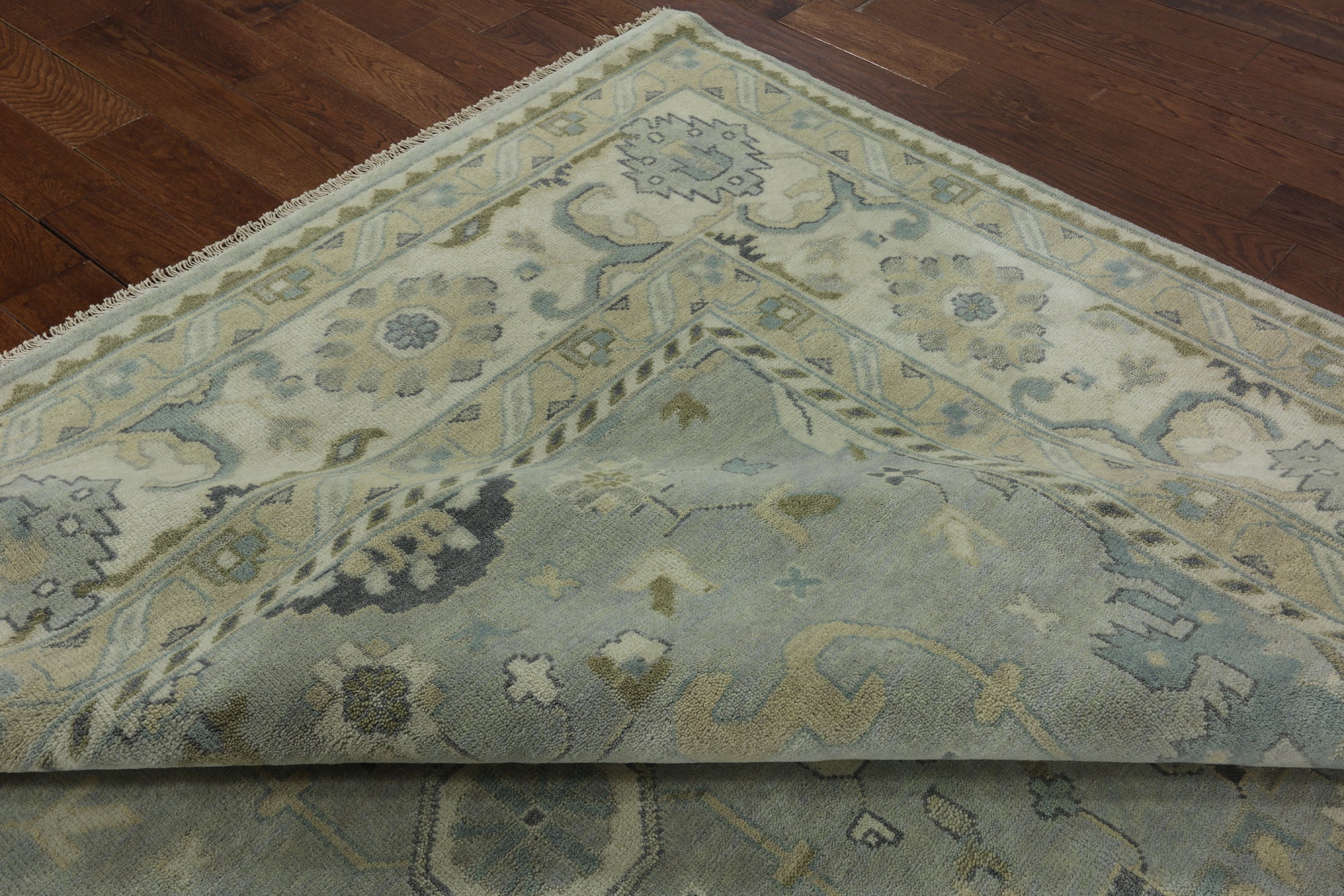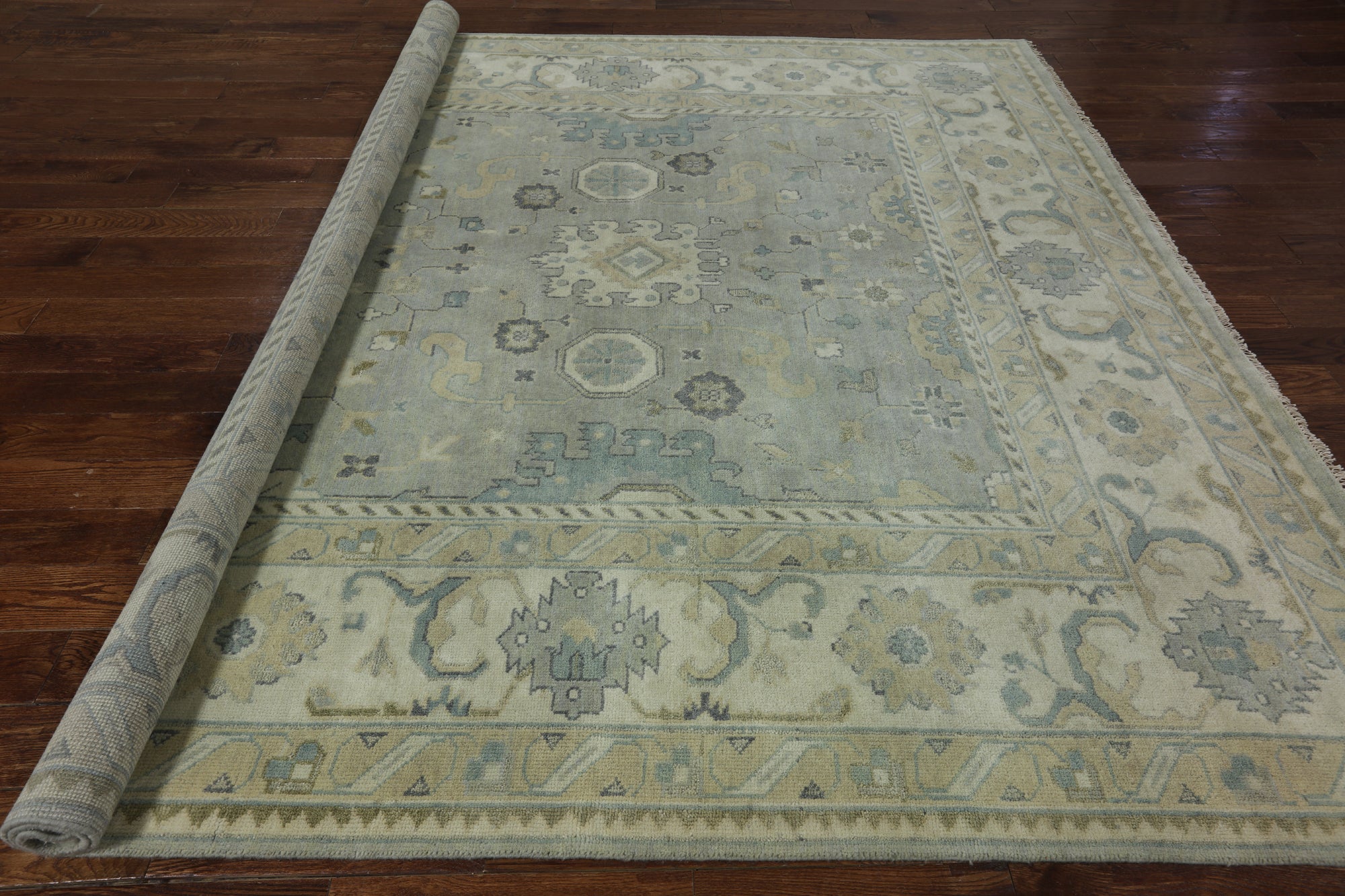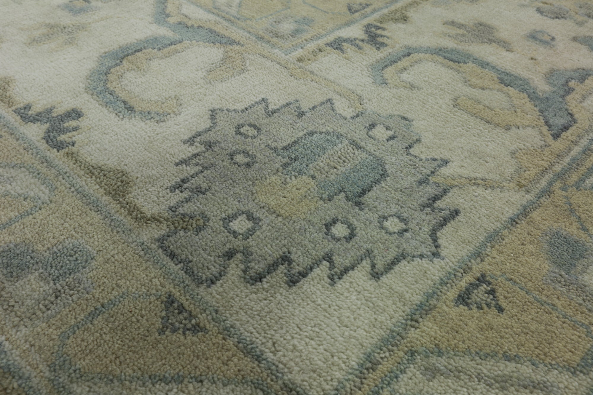 Oushak Rugs are distinctive in both pattern and color palette. Most have a blue, green, dark ivory, or gold & their designs are typically based on geometric motifs and vine / leave motifs. All colors are created with natural vegetable dyes, and the hushed tones are enhanced by the soft, lustrous wool texture. The foundation of an Oushak is cotton while the pile is wool. Oushak rugs are also double-knotted for durability.