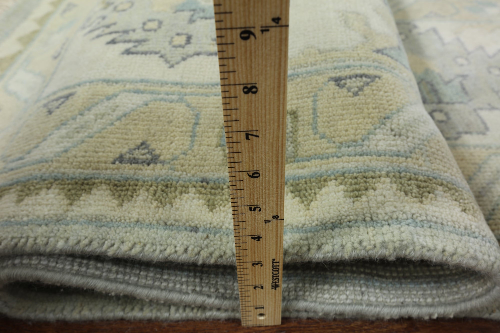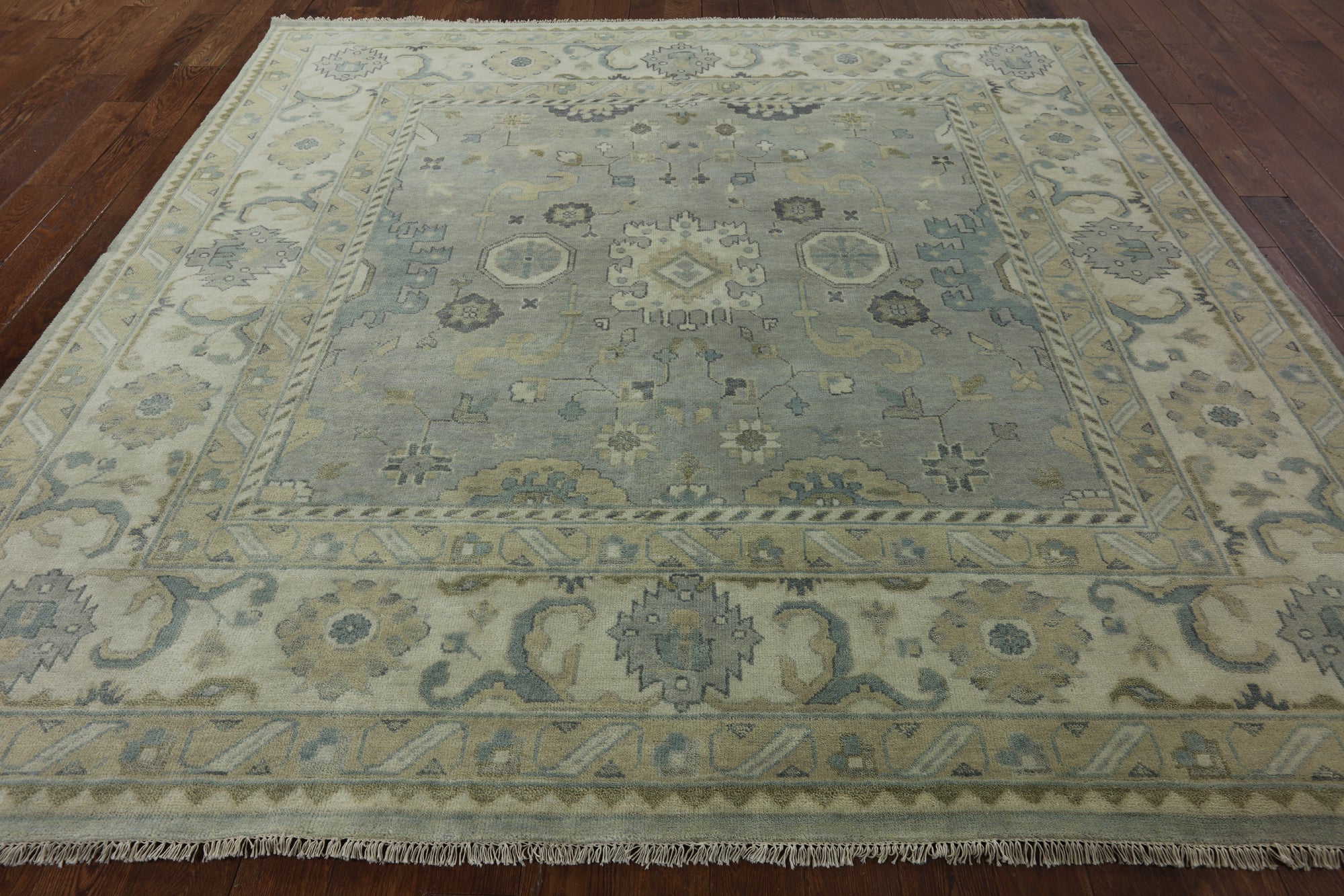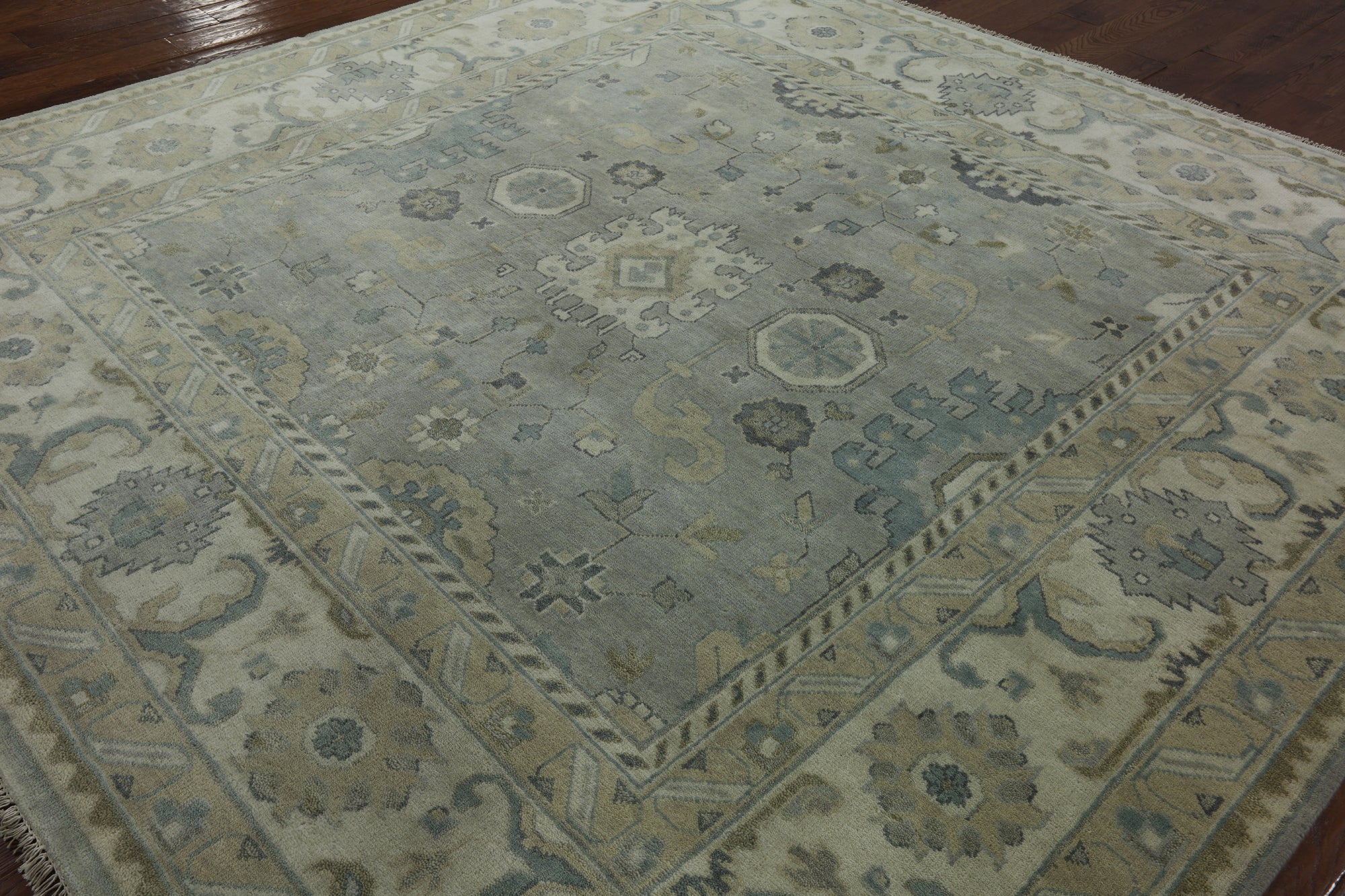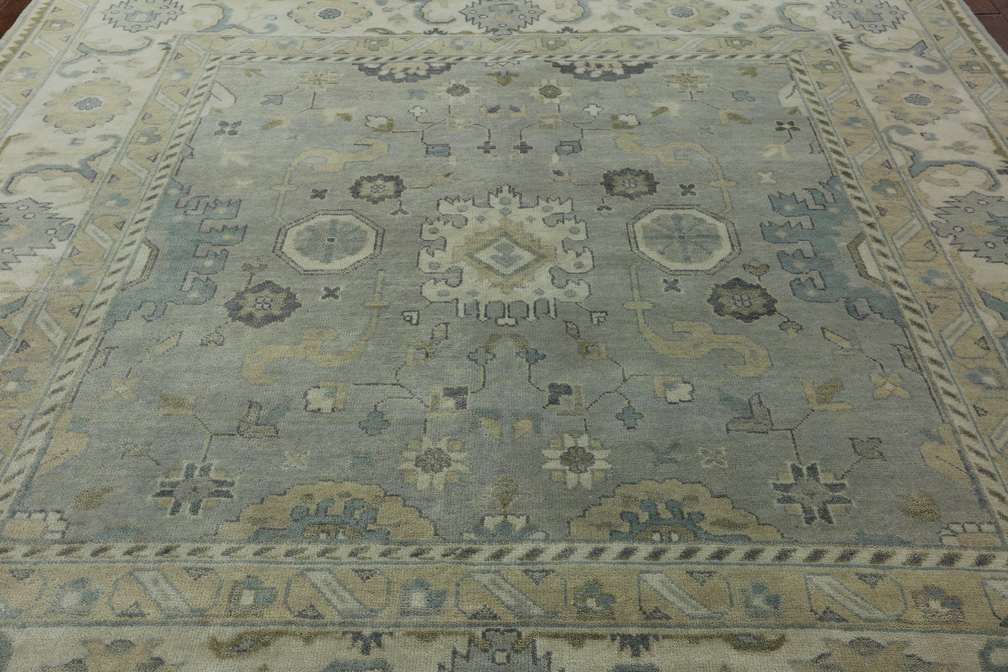 Oushak Rugs are distinctive in both pattern and color palette. Most have a blue, green, dark ivory, or gold & their designs are typically based on geometric motifs and vine / leave motifs. All colors are created with natural vegetable dyes, and the hushed tones are enhanced by the soft, lustrous wool texture. The foundation of an Oushak is cotton while the pile is wool. Oushak rugs are also double-knotted for durability.