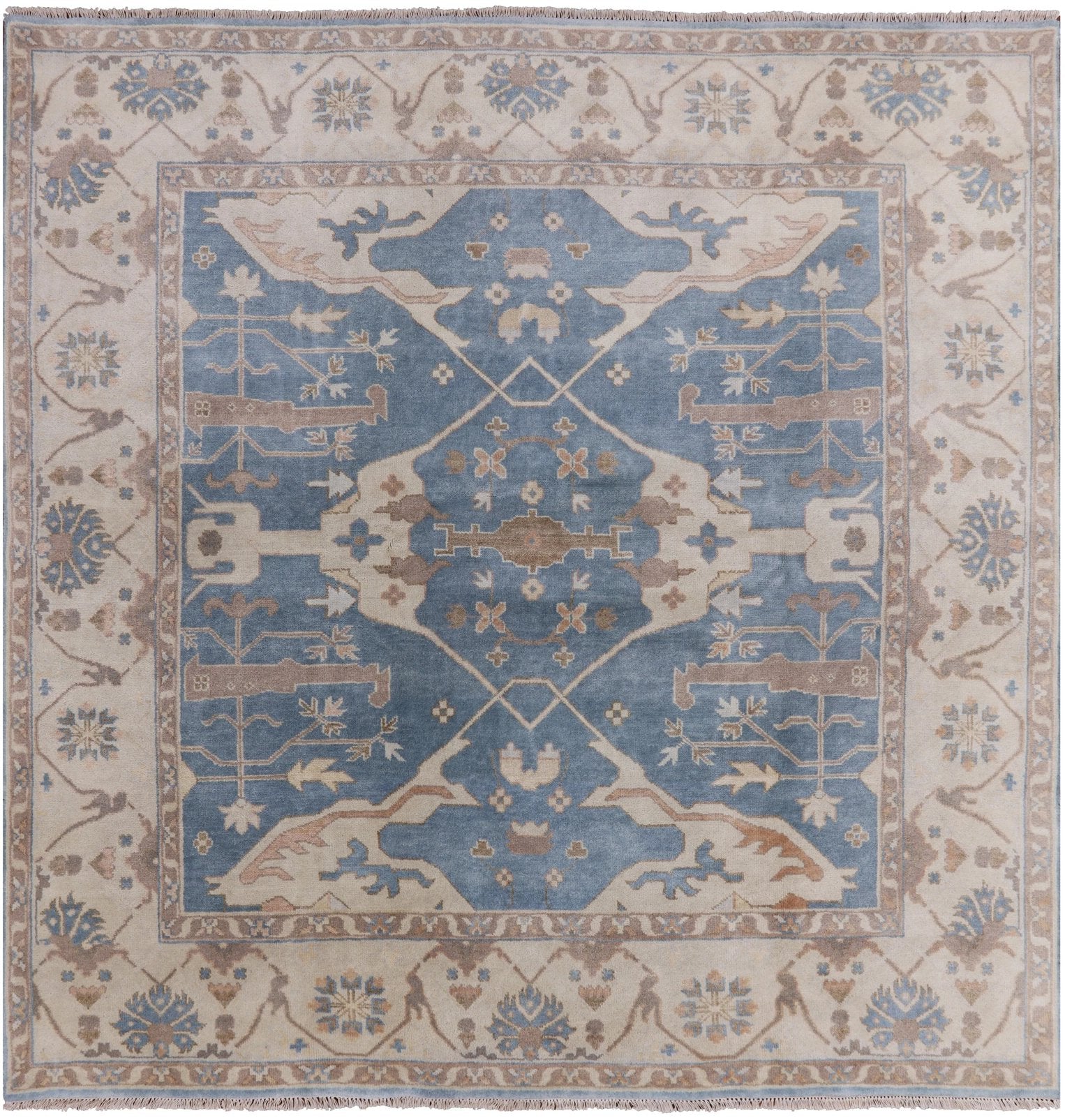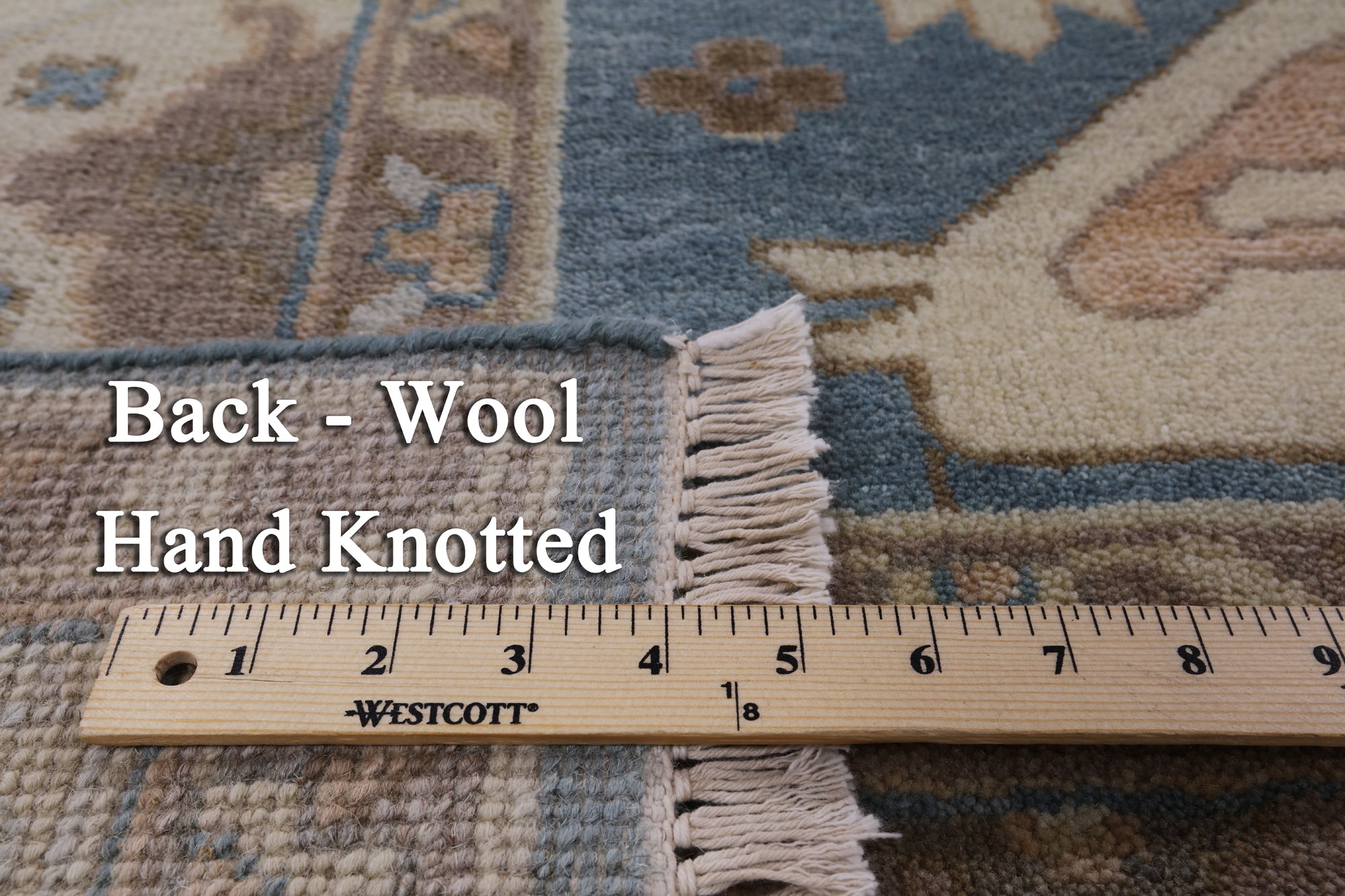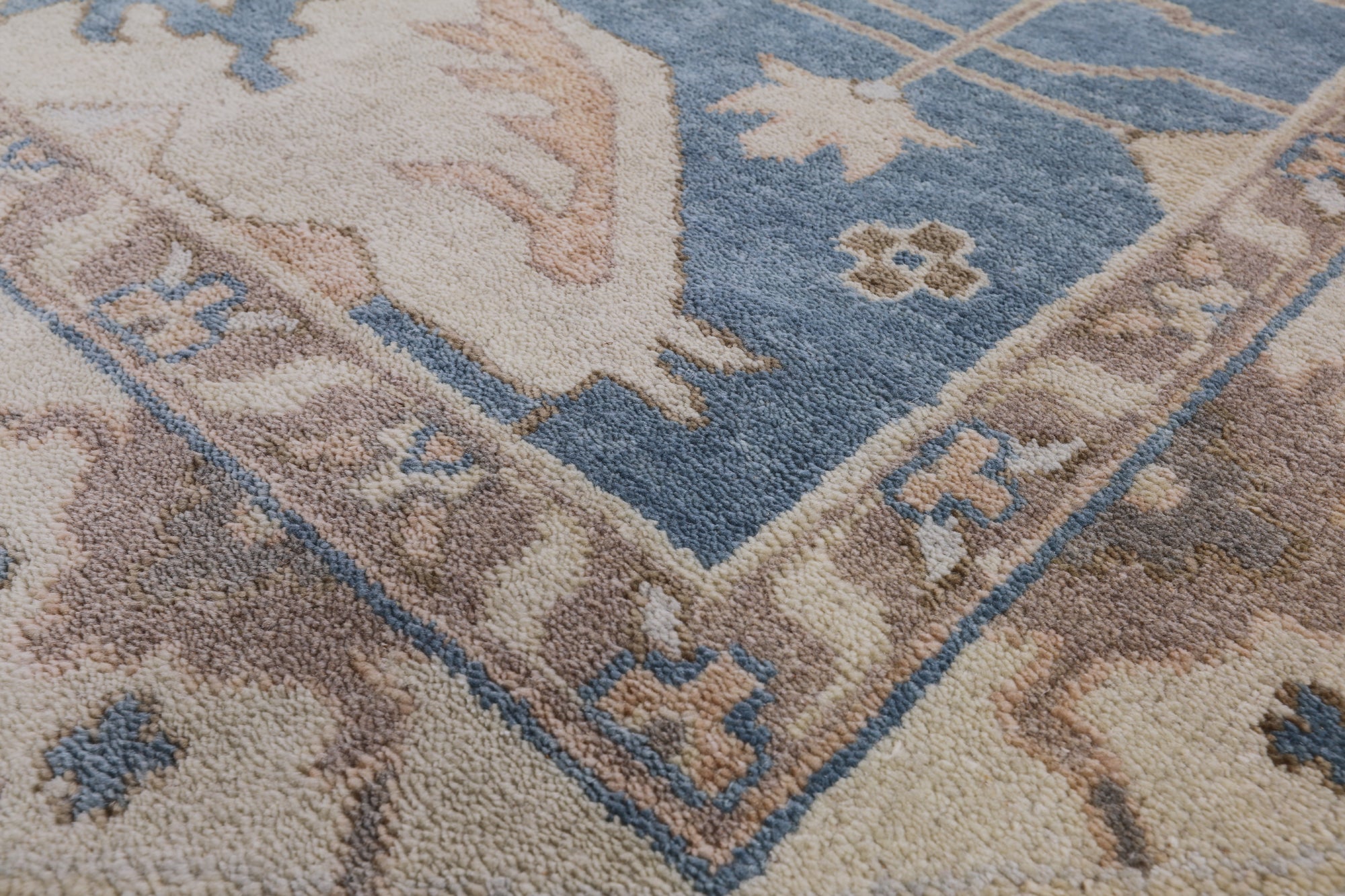 Oushak Rugs are distinctive in both pattern and color palette. Most have a blue, green, dark ivory, or gold & their designs are typically based on geometric motifs and vine / leave motifs. All colors are created with natural vegetable dyes, and the hushed tones are enhanced by the soft, lustrous wool texture. The foundation of an Oushak is cotton while the pile is wool. Oushak rugs are also double-knotted for durability.