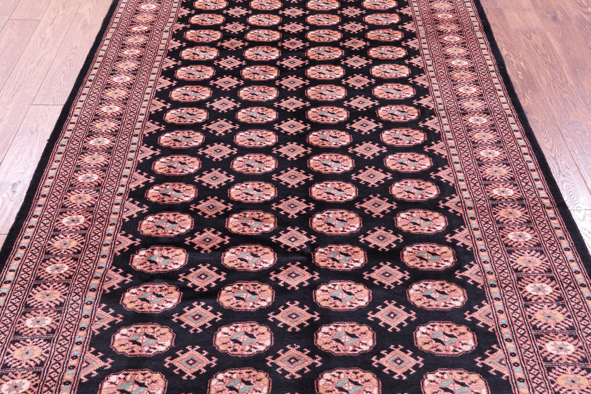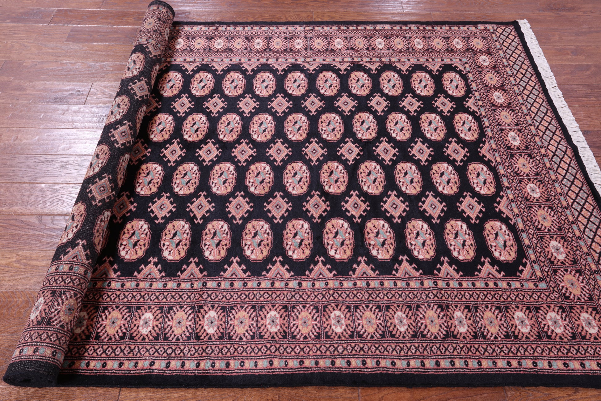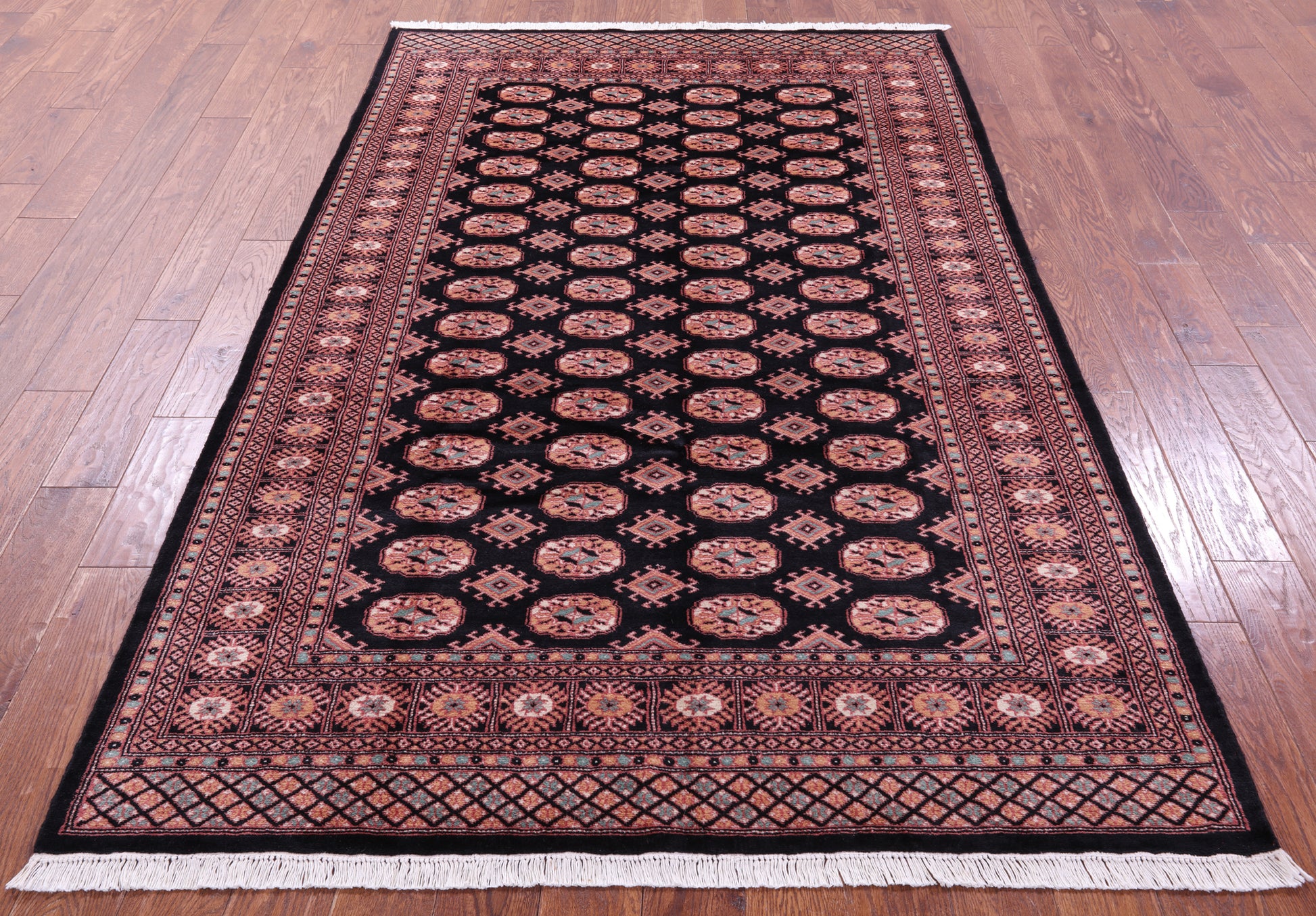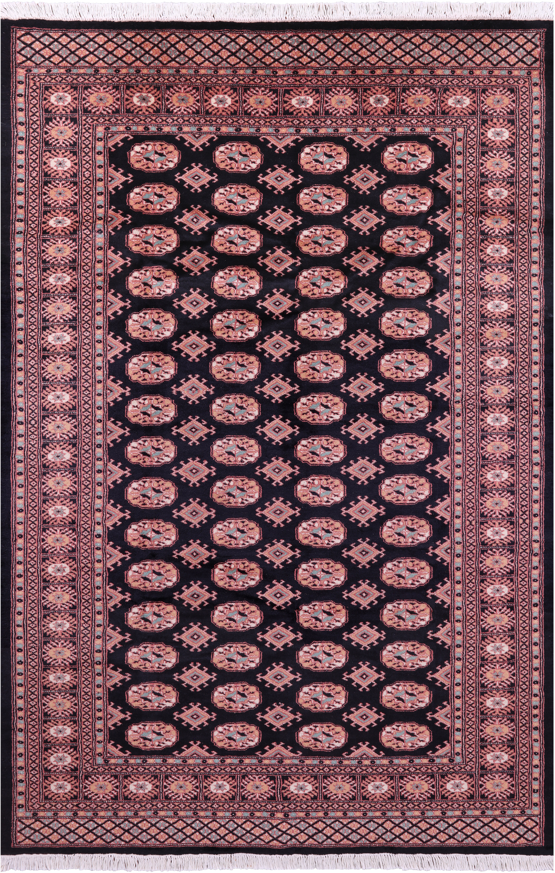Bokhara Rugs are classic Turkoman designs originally created by nomadic tribes in India. Bokhara Rugs are among the most popular handmade rugs widely produced in Pakistan, India & Afghanistan. There foundation and heavy pile consist of wool, and have a soft luxurious feel. There unique designs consist of repeating geometric designs and vary from one tribe to another. Designs are commonly dark blue/navy, black, brown, or red with ivory accents.