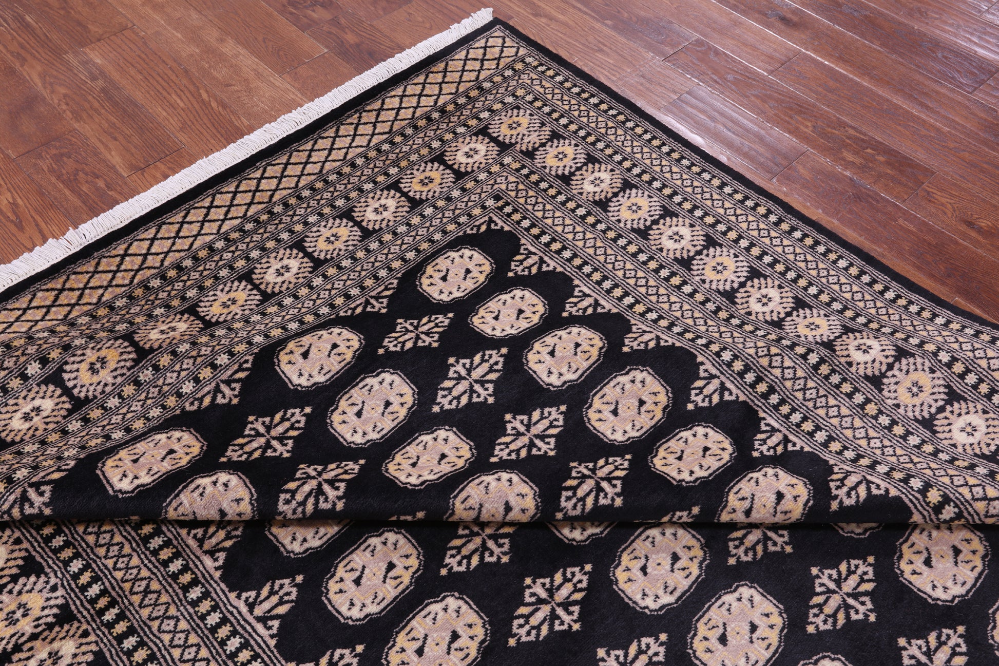 Bokhara Rugs are classic Turkoman designs originally created by nomadic tribes in India. Bokhara Rugs are among the most popular handmade rugs widely produced in Pakistan, India & Afghanistan. There foundation and heavy pile consist of wool, and have a soft luxurious feel. There unique designs consist of repeating geometric designs and vary from one tribe to another. Designs are commonly dark blue/navy, black, brown, or red with ivory accents.