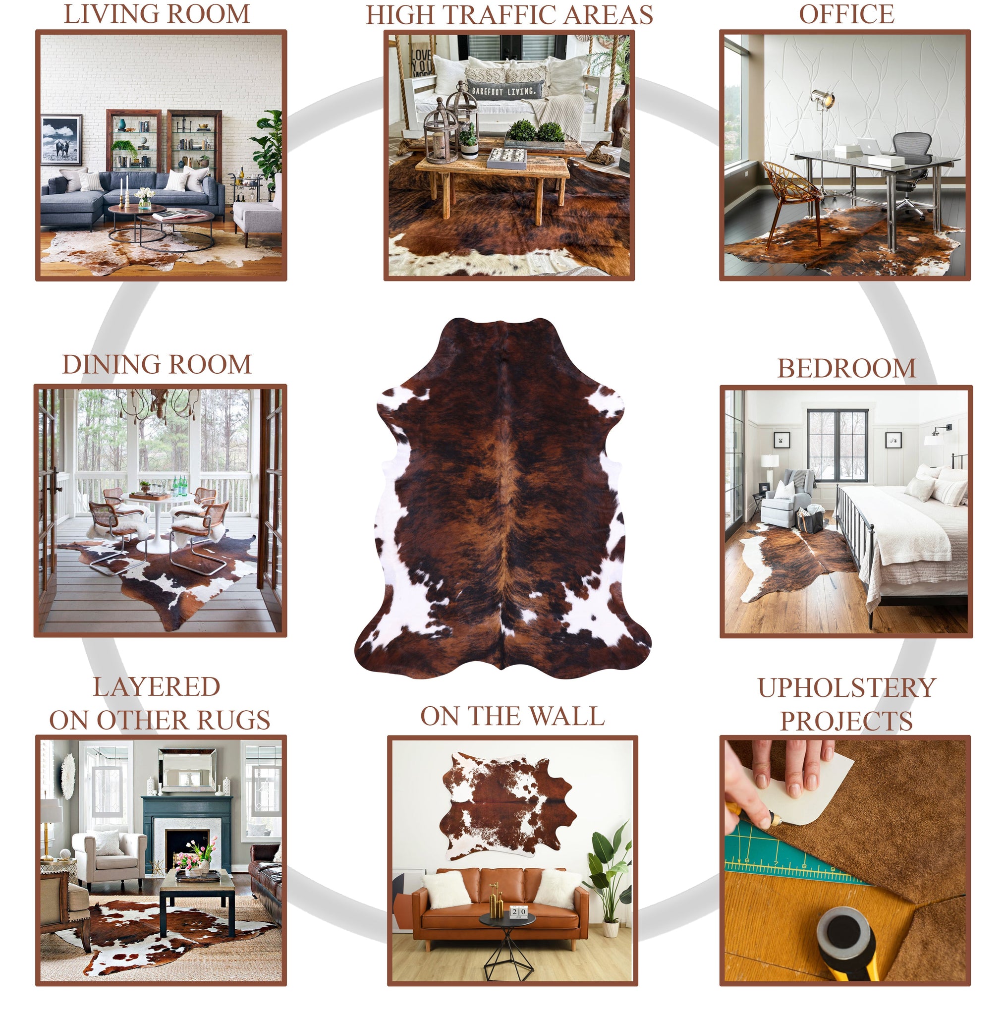 Our Cowhide rugs are a beautiful addition to any room with character and style from modern to rustic. All our hair-on hides come from an organic cow. Cows are not grown and killed for the production of our cowhide rugs, only the byproducts of the meat industry are used to make our cowhide rugs. Each of our cowhides is finished with a professional high-quality tanning process to give every hide a shiny, clean, and soft feeling. Our natural hide rugs have been chosen individually to ensure longevity. None of our cowhides will shed or curl. This is one of a kind cowhide rug there are no two alike. You will receive the hide that is pictured.