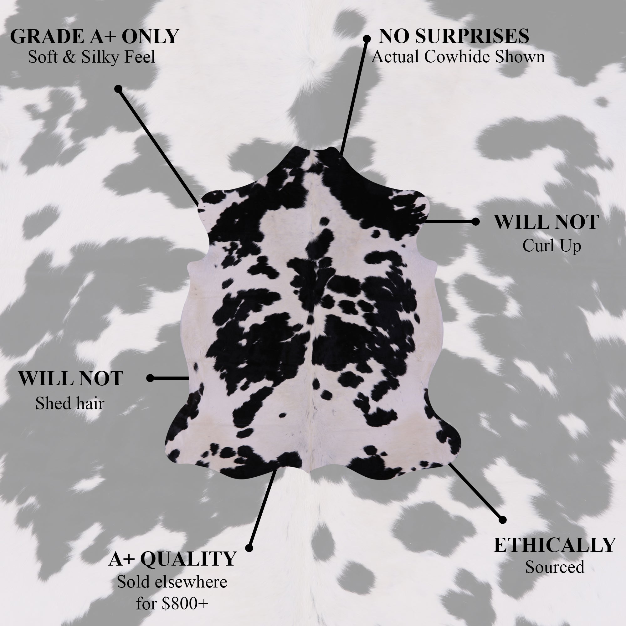 Our Cowhide rugs are a beautiful addition to any room with character and style from modern to rustic. All our hair-on hides come from an organic cow. Cows are not grown and killed for the production of our cowhide rugs, only the byproducts of the meat industry are used to make our cowhide rugs. Each of our cowhides is finished with a professional high-quality tanning process to give every hide a shiny, clean, and soft feeling. Our natural hide rugs have been chosen individually to ensure longevity. None of our cowhides will shed or curl. This is one of a kind cowhide rug there are no two alike. You will receive the hide that is pictured.