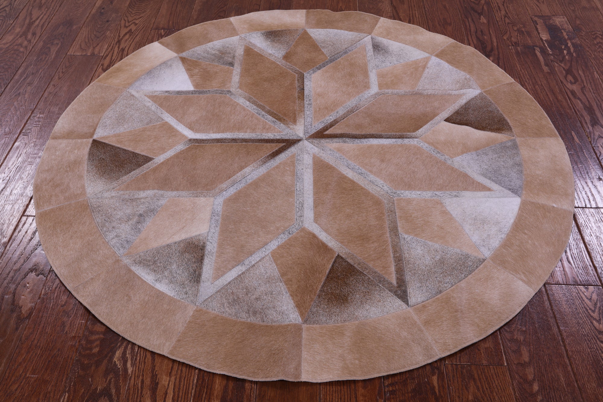 Brown Round Star Natural Cowhide Hand Stitched Patchwork Rug - 5' 0" X 5' 0"