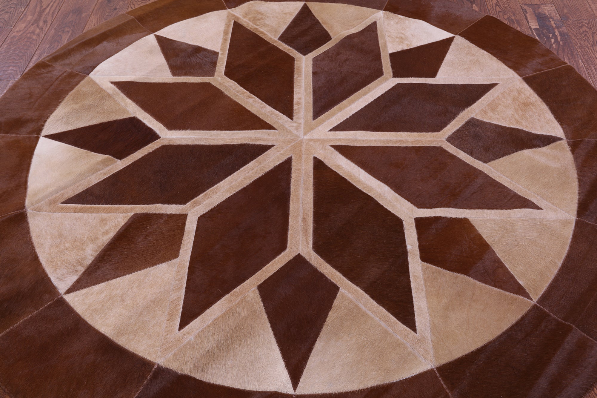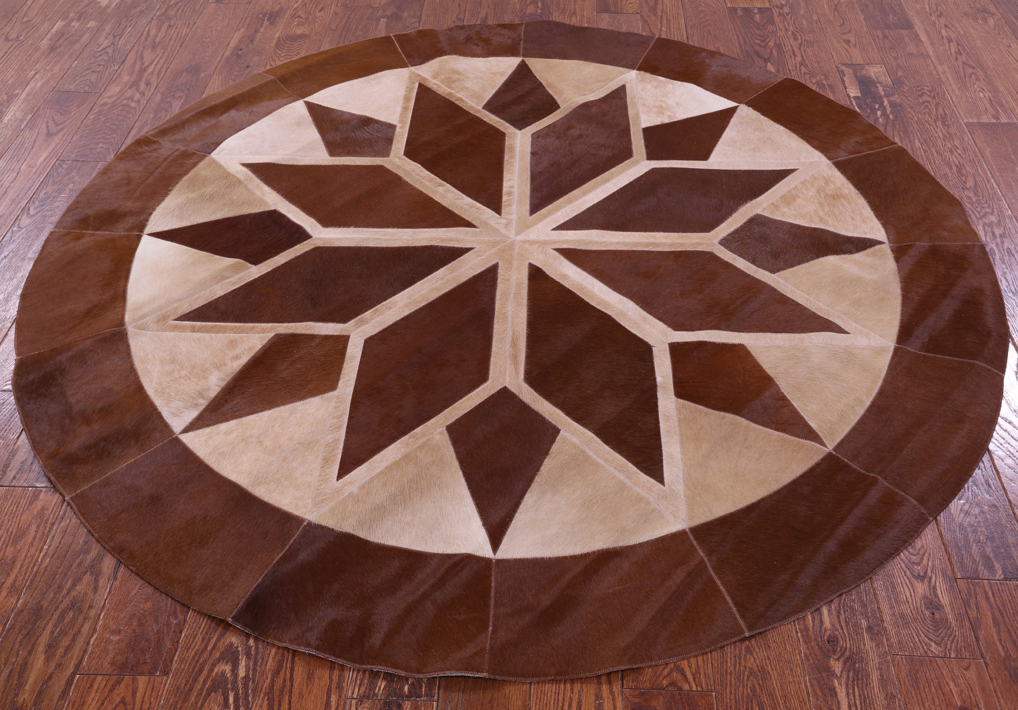 Brown Round Star Natural Cowhide Hand Stitched Patchwork Rug - 6' 6" X 6' 6"