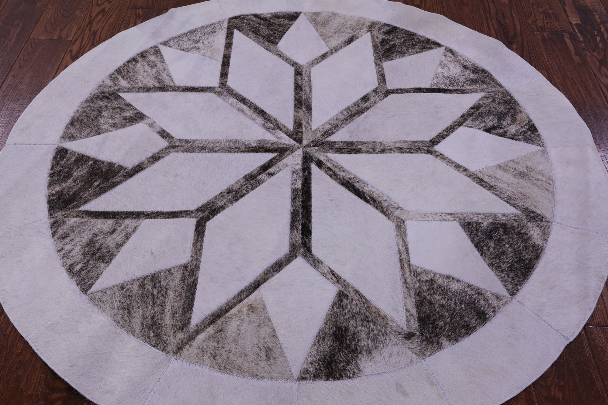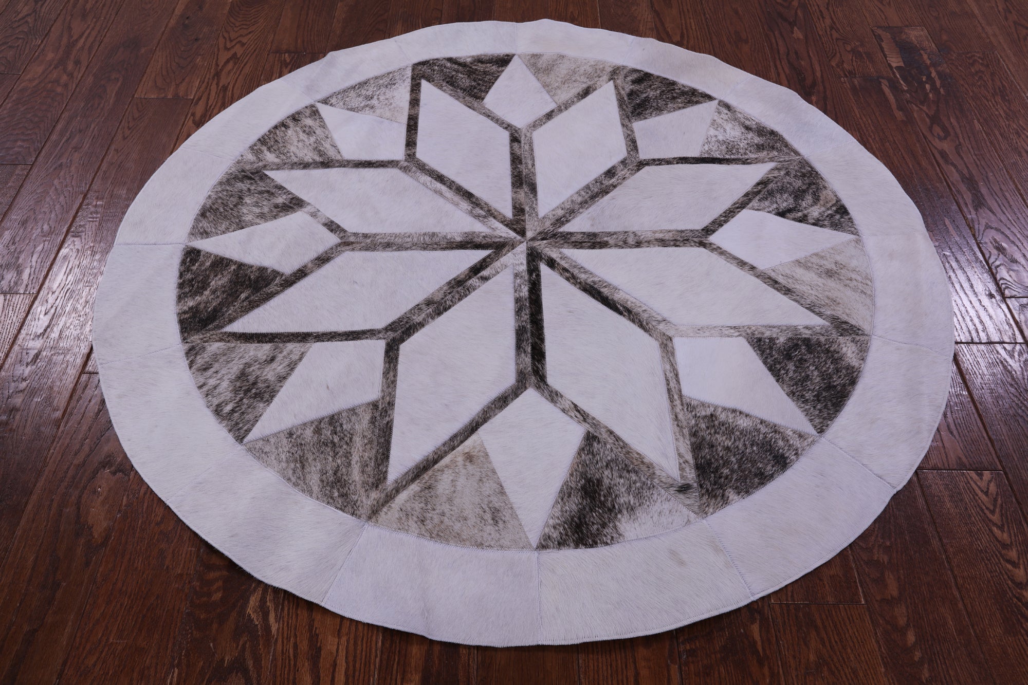 Brown & White Round Star Natural Cowhide Hand Stitched Patchwork Rug - 5' 0" X 5' 0"