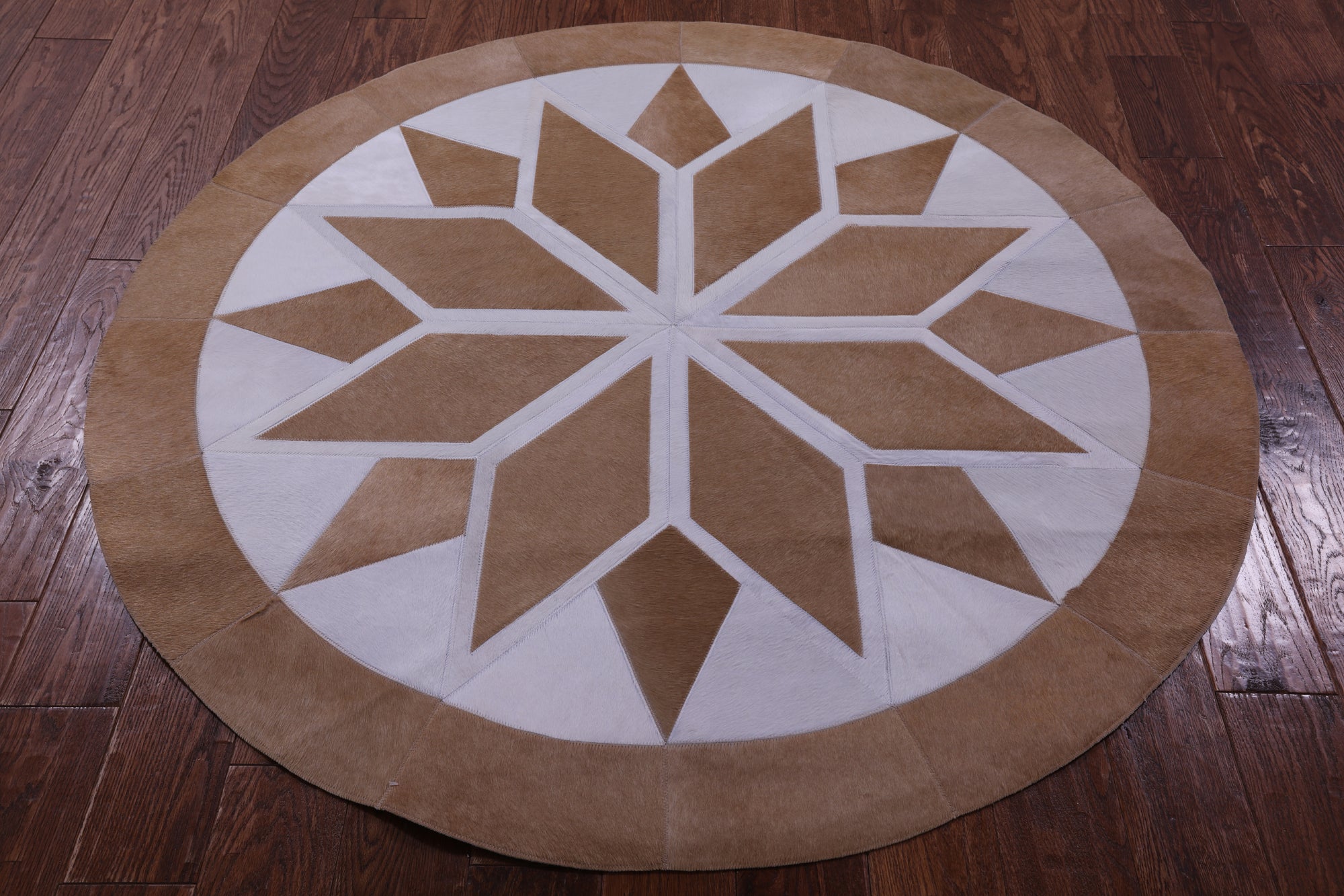 Brown & White Round Star Natural Cowhide Hand Stitched Patchwork Rug - 5' 0" X 5' 0"