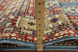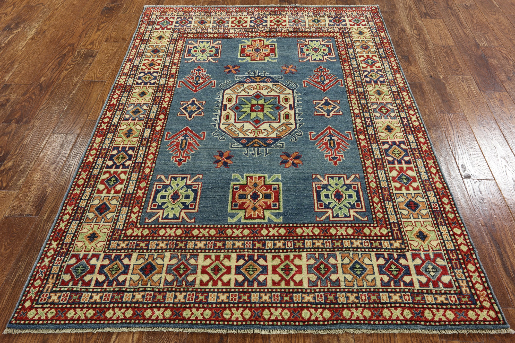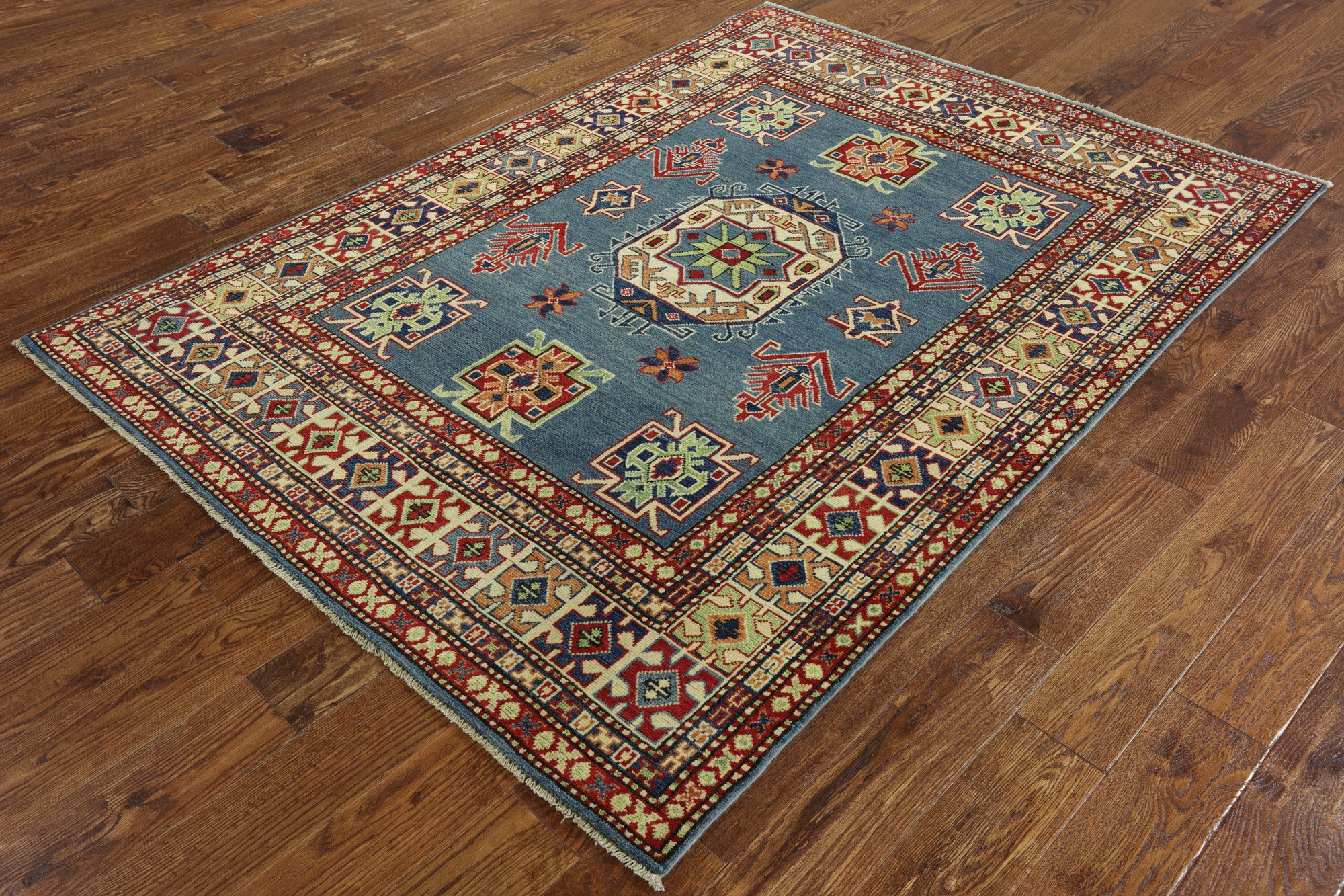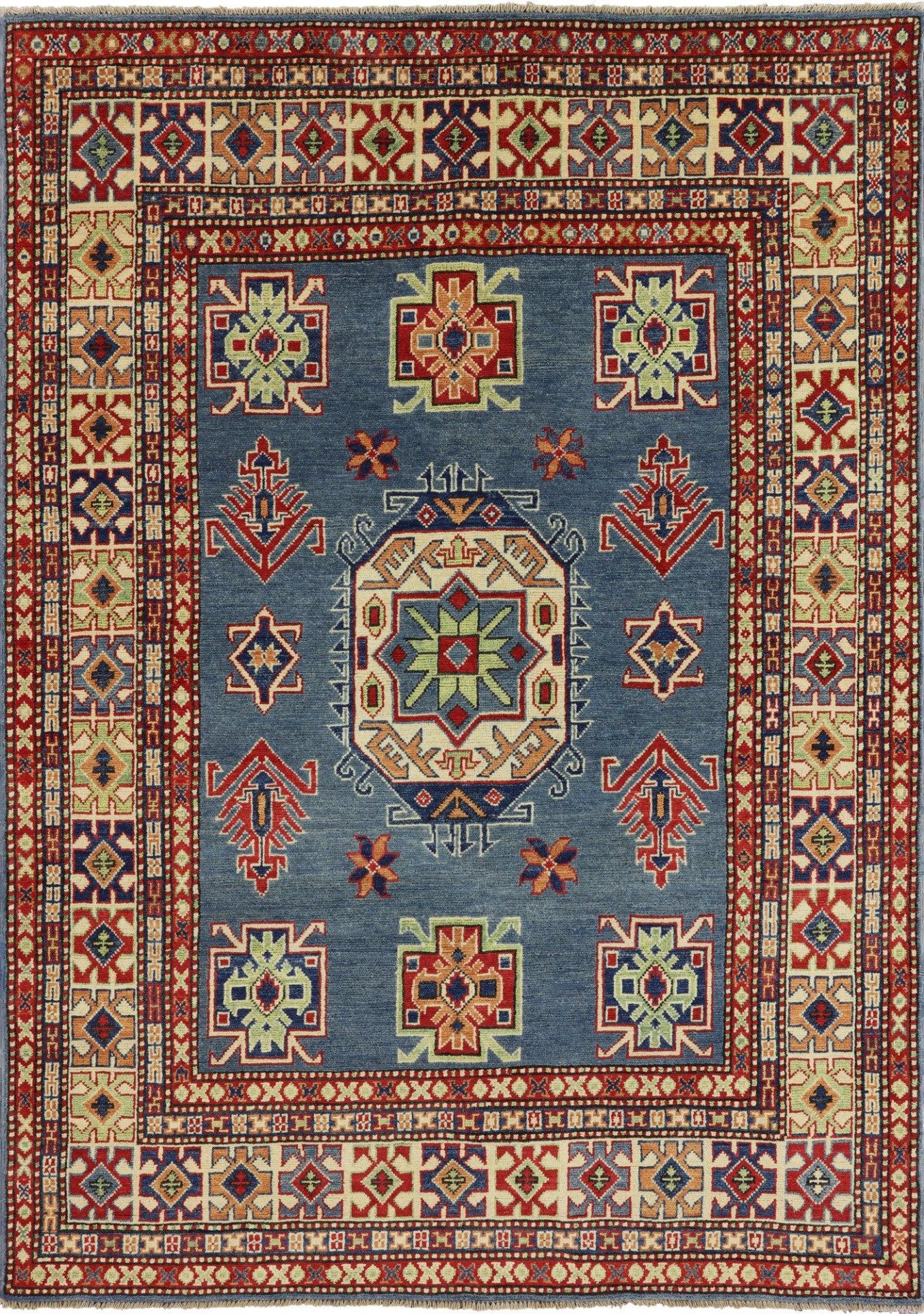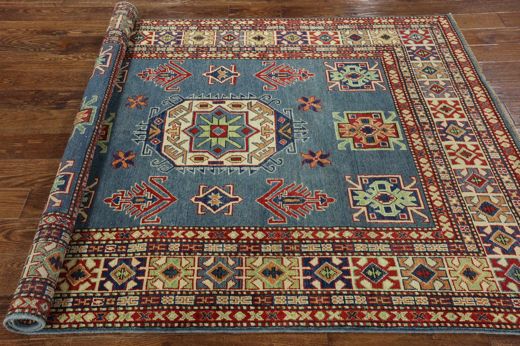 Kazak Rugs are popular for their stunning geometric designs & high quality dyes. Kazak patterns tend to be red, yellow/gold and blue. Designs include, but are not limited to animals, flowers, medallions, & iconic figures such as geometric people/ and animals & symbolic motifs.Β