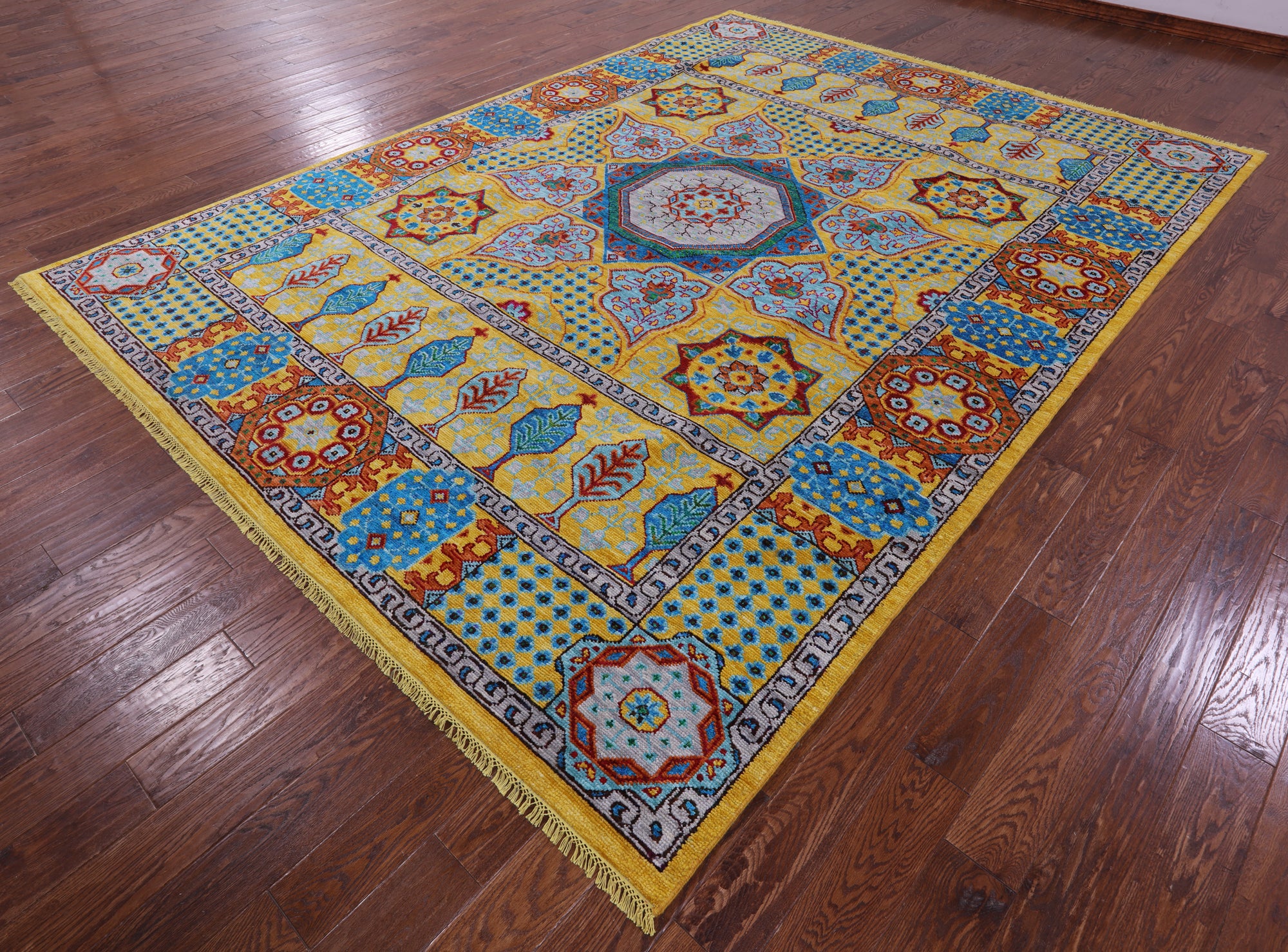 Gold Geometric Persian Mamluk Handmade Wool Rug - 8' 11" X 12' 3"